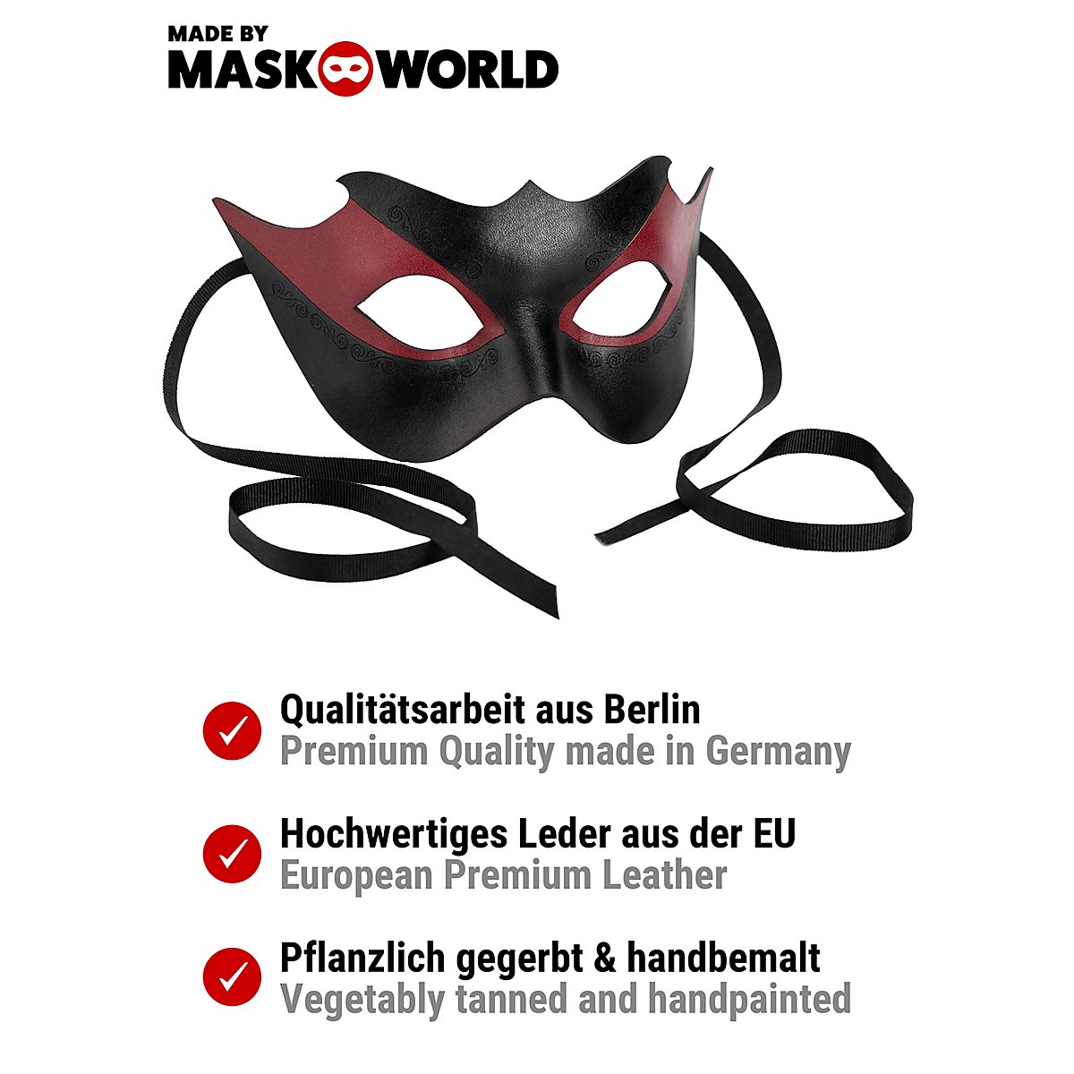 Eine Ledermaske im venezianischen Stil wie diese wird bei Andracor in Handarbeit aus ca. 2mm dickem Leder hergestellt.