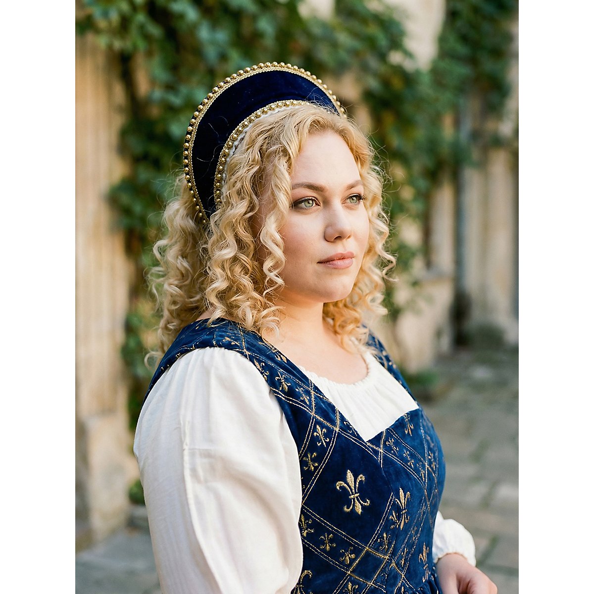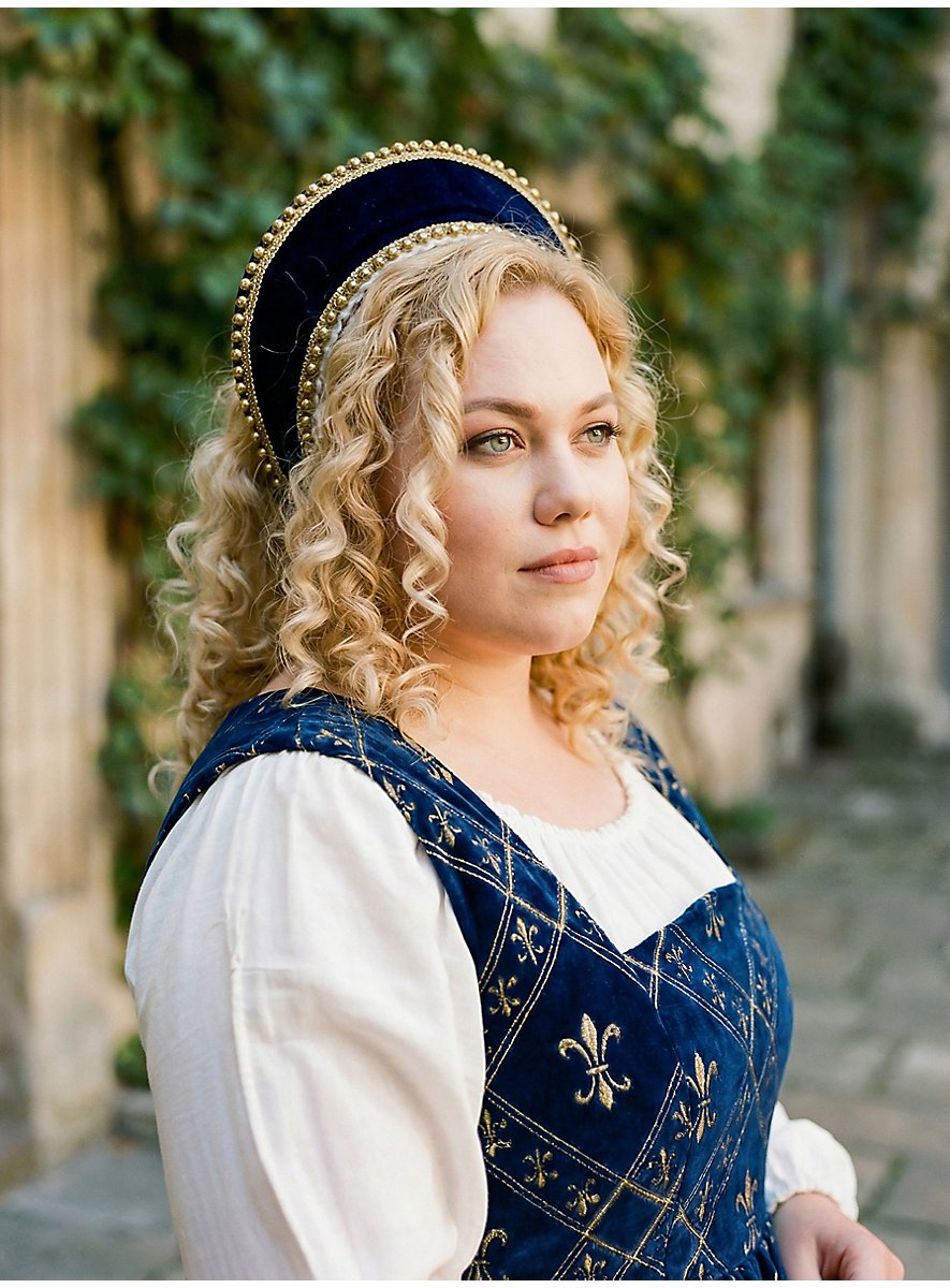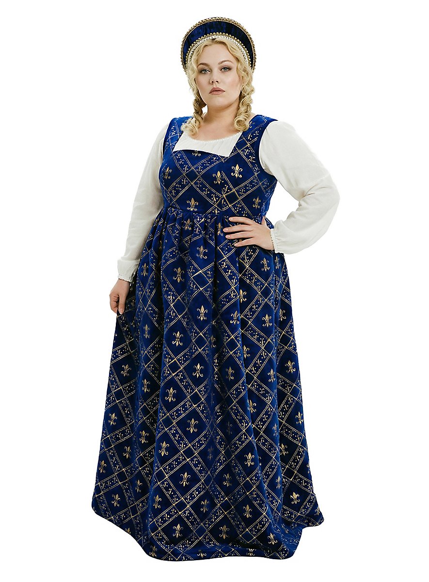 Dieses wunderschöne Kleid im Stil des 15. Jhds. wurde aus einem, mit der französischen Lilie gemusterten Stoff gefertigt.