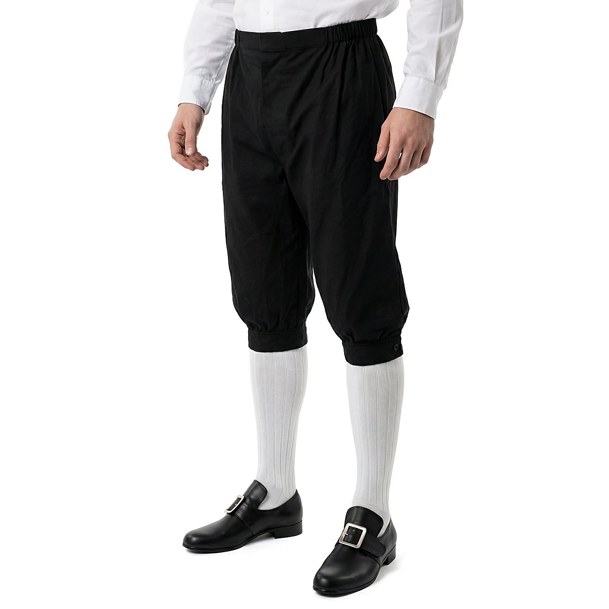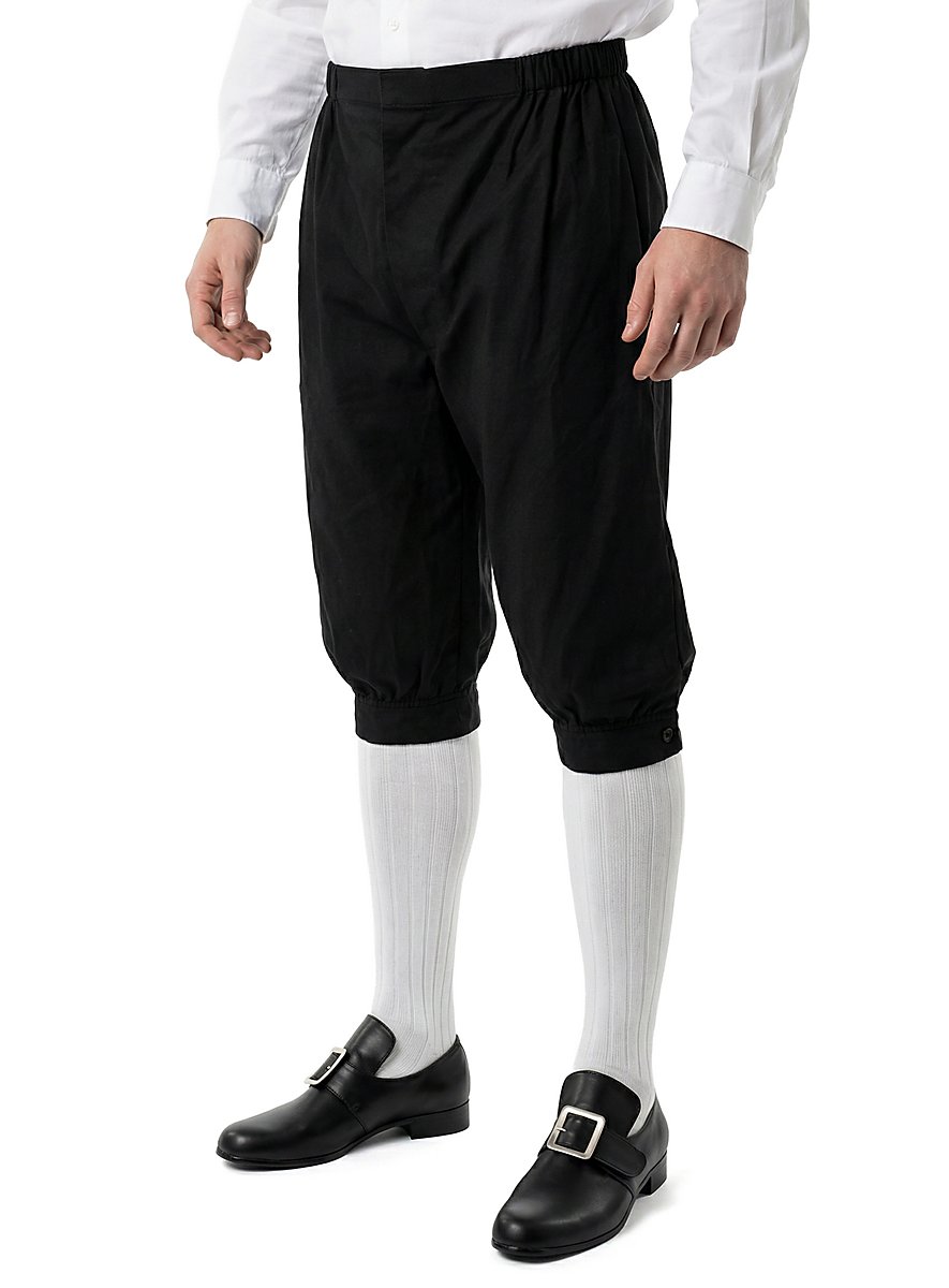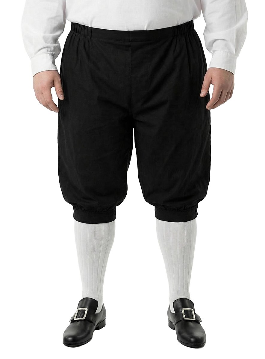 Sie reicht über die Knie und kann unterhalb beider Knie mit einem filigran verzierten Metallknopf zusammengeknöpft werden. Ein elastischer Hüftbund stellt sicher, dass die Hose selbst bei intensiven Duellen zugleich sicher und bequem an ihrem Platz sitzt. En garde!