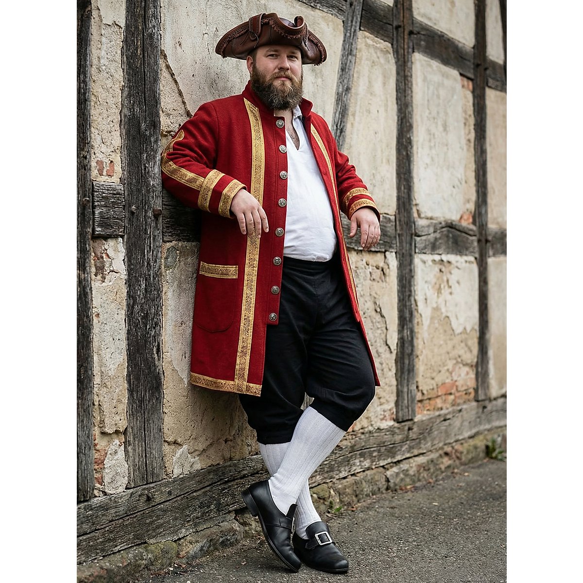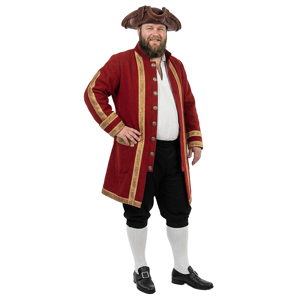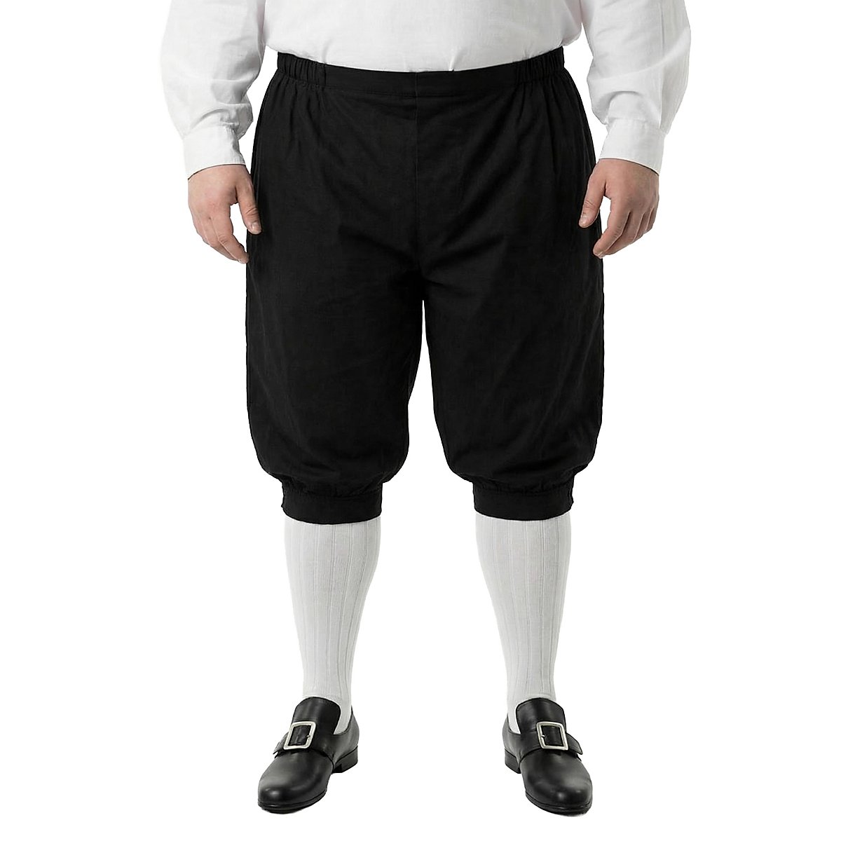 Sie reicht über die Knie und kann unterhalb beider Knie mit einem filigran verzierten Metallknopf zusammengeknöpft werden. Ein elastischer Hüftbund stellt sicher, dass die Hose selbst bei intensiven Duellen zugleich sicher und bequem an ihrem Platz sitzt. En garde!