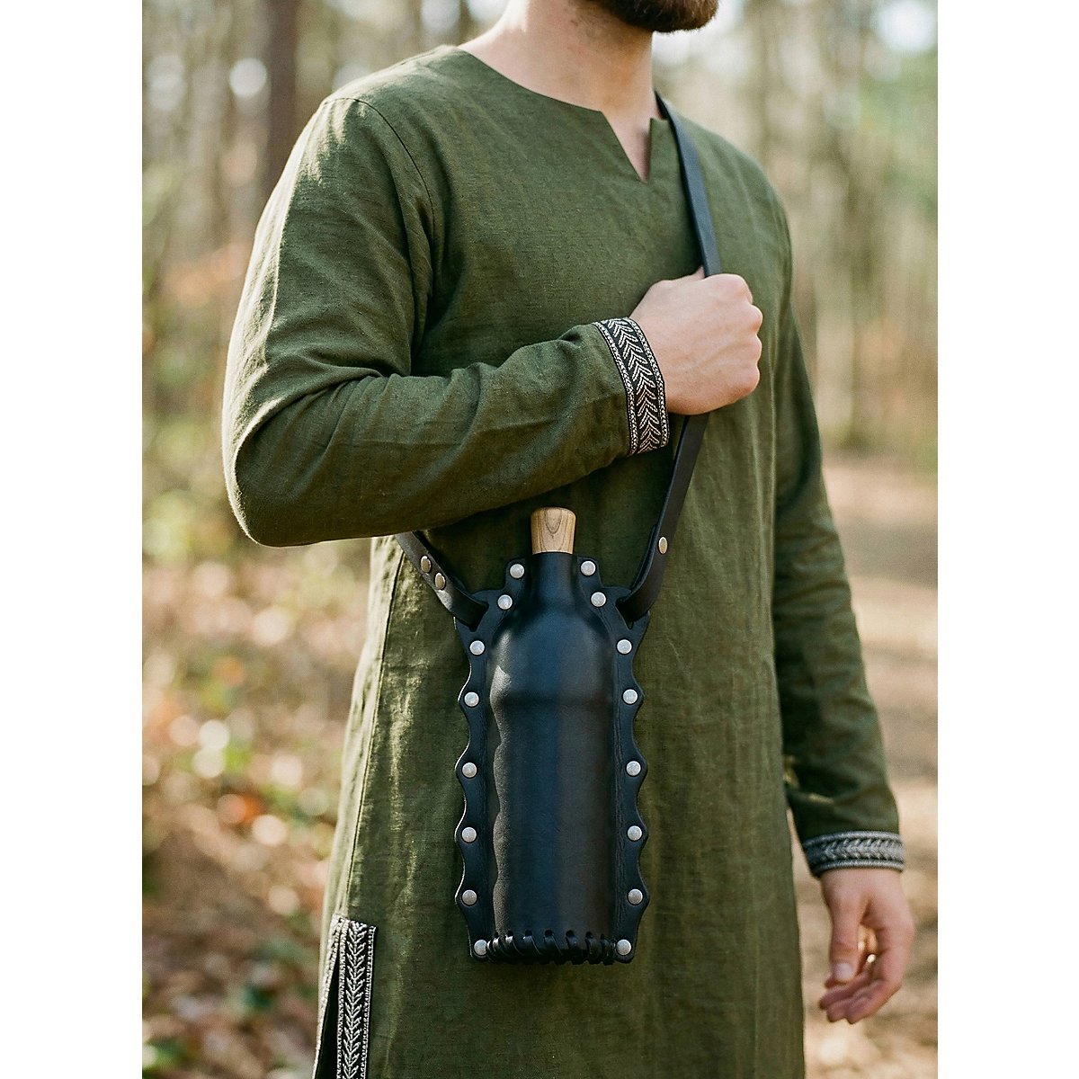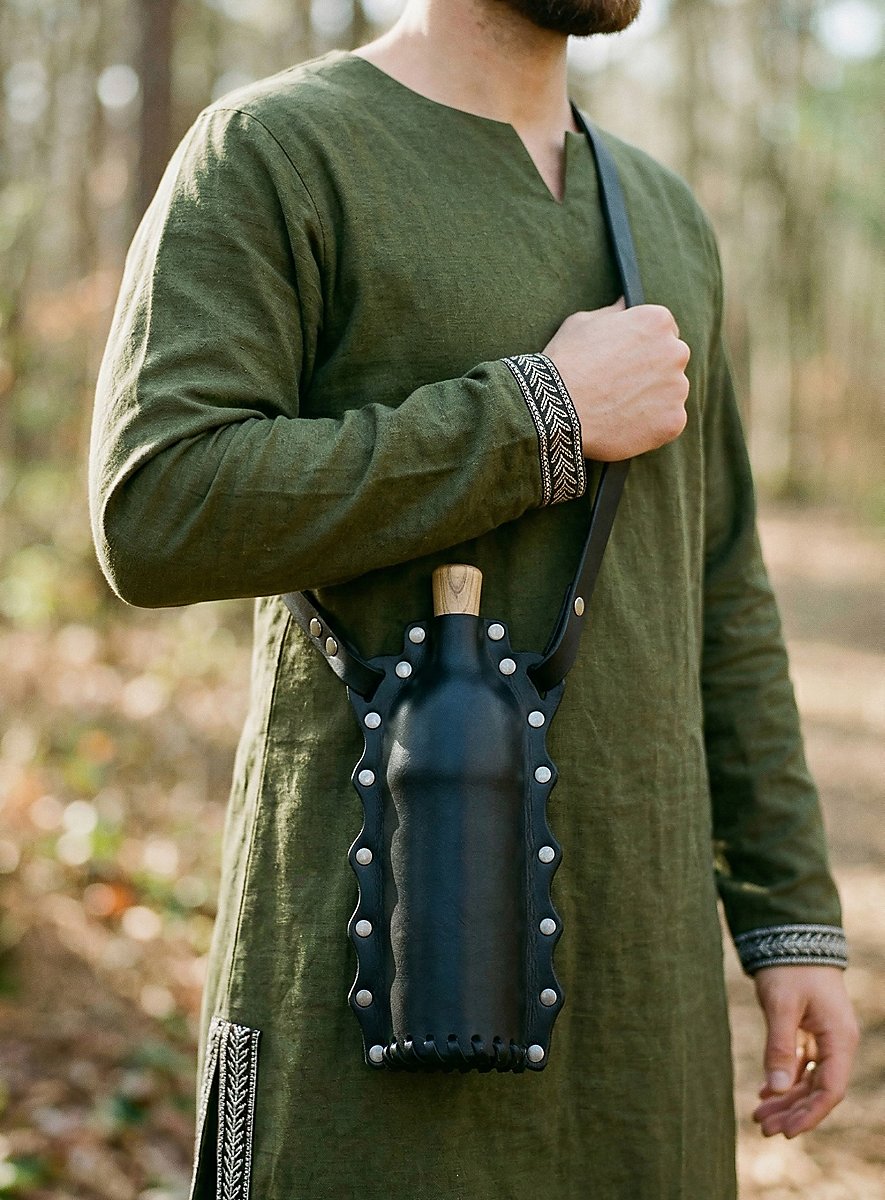 Wen es während seiner Abenteuer dürstet, der greift einfach zu dieser wunderbaren, schwarzen LARP Trinkflasche! Sie besteht aus echtem Leder, das über ein lebensmittelechtes PET-Inlay gezogen ist und hat ca. 500 ml Fassungsvermögen. Als Verschluss fungiert ein Holzpfropfen, der mittels Lederband an der Flasche befestigt ist, ein großzügig dimensionierter Lederriemen dient als Tragevorrichtung. Ein herrliches Accessoire, das jedermann und jederfrau gut zu Gesicht steht.