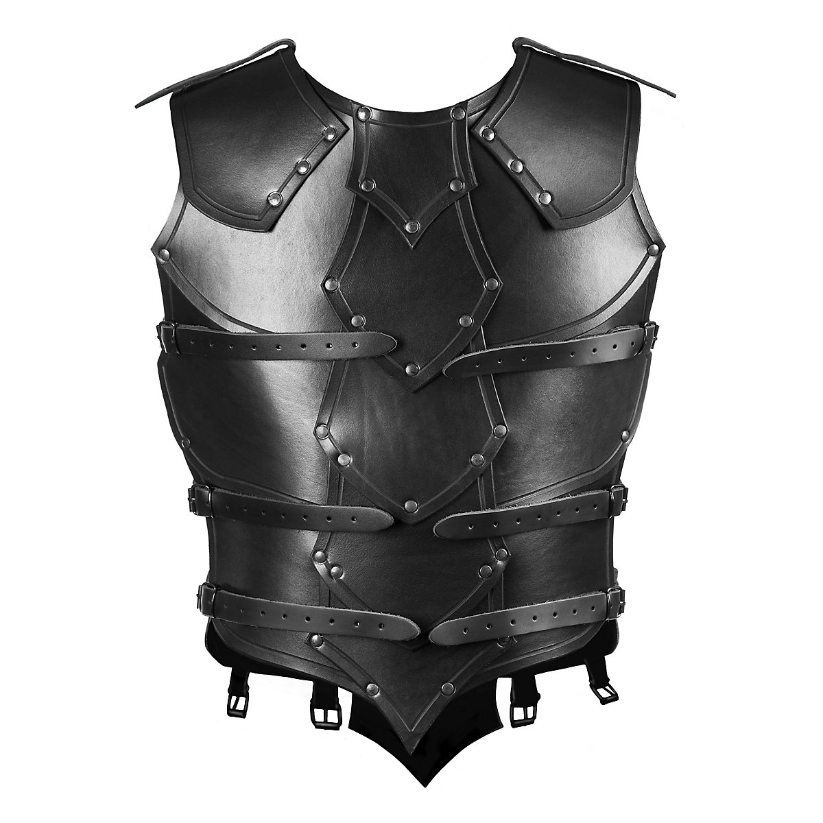Die Schulterpanzerung ist über Lederriemen mit dem Brustpanzer der Rüstung verbunden und kann abgenommen werden. Dank der seitlich platzierten Lederriemen lässt sich dieLederrüstung - Drachenreiter leicht an verschiedene Körpergrößen anpassen. Jede einzelne Rüstlederplatte ist mehrfach vernietet. Krieger aller Art werden an dieser hochwertigen Lederrüstung sehr lange Freude haben.
