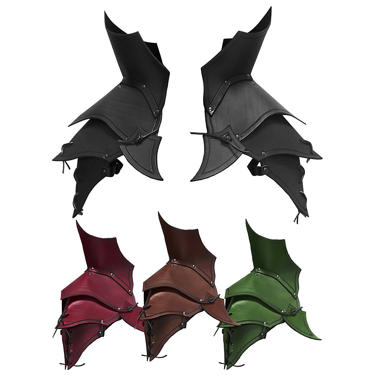 Mit den aus gut 3,5mm starken, vernieteten Rüstlederplatten bestehenden Lederschultern - Dämon kann das Erscheinungsbild vieler Rüstungen oder Charaktere individualisiert werden. Die stattlichen Klingenbrecher verleihen den Schulterpanzern und damit dem Träger oder der Trägerin ein aggressives Äußeres. Während der lamellenförmige Aufbau bestmögliche Beweglichkeit gewährleistet, bieten Schwebescheiben unterhalb der Achseln zusätzlichen Schutz. Die Schultern lassen sich, je nach Variante, entweder eigenständig tragen oder an Rüstkragen oder Brustpanzer befestigen.