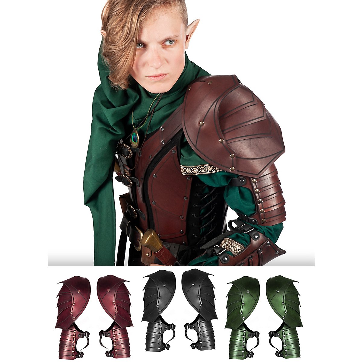 Unsere Lederschultern - Drachenrücken bieten wirklich massiven Rüstungsschutz ohne dabei zu wuchtig zu wirken. Sie bestehen aus zwei Segmenten, die mit einer Schnalle verbunden sind. Dadurch lassen sie sich sehr flexibel auf verschiedene Armlängen einstellen. Das untere Segment besteht aus mehreren aufgenieteten Platten und ist dadurch an vielen Stellen bis zu 1 cm dick. Zusätzlich entsteht ein Hohlraum zwischen der Platte und den Schuppen der Schläge extrem abdämpft. Auch das Schulterstück selbst umschließt die Schulter komplett und bietet echten Schutz vor Angriffen. Die Schultern lassen sich mit jeder Andracor Torso Lederrüstung oder Kragen kombinieren, passen aber optisch am besten zu unseren elfisch inspirierten Lederteilen.