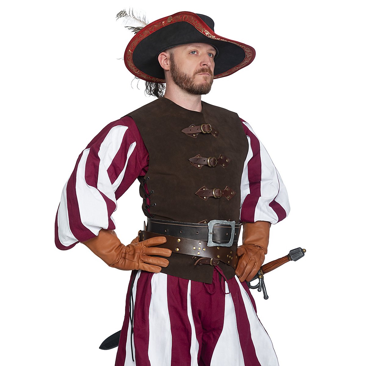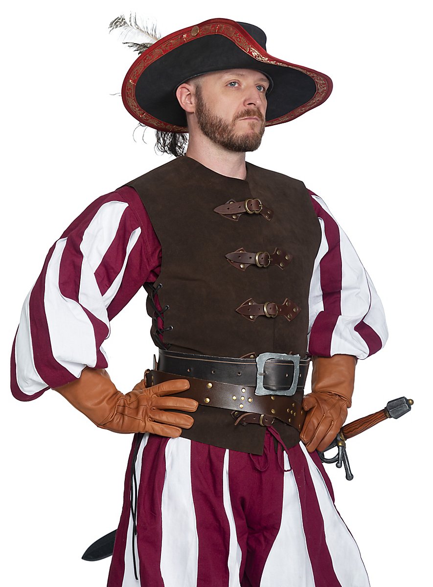 Die Lederweste Fechter ist in dem Set in Braun enthalten und aus robustem 1,5 mm starkem Veloursleder. Die Riemen sind aus dickem Rüstleder und durch ihre Pfeilform sehr extravagant, passend also zu einem Landsknecht. Ein super Basisteil also für Edelmänner, Piraten, Musketiere, flamboyante Prinzen, Witcher-Charaktere und den klassischen Söldner des Mittelalters.