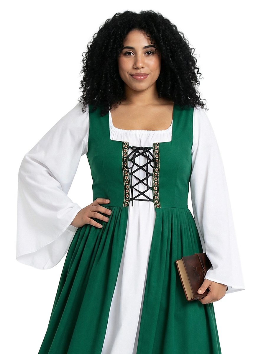 Dieses farbenprächtige Oberkleid im Stile des 16.Jahrhunderts sollte jede Maid in der Kleidertruhe haben. Das ärmellose, offene Kleid hat ein Schnürbustier mit Schmuckborten und verstärkenden Stäbchen für eine extra straffe Schnürung. Es ist vielseitig mit Chemisen, Unterkleidern und Unterröcken kombinierbar und kann so Sommer wie Winter getragen werden. Erhältlich in rot, grün und blau.