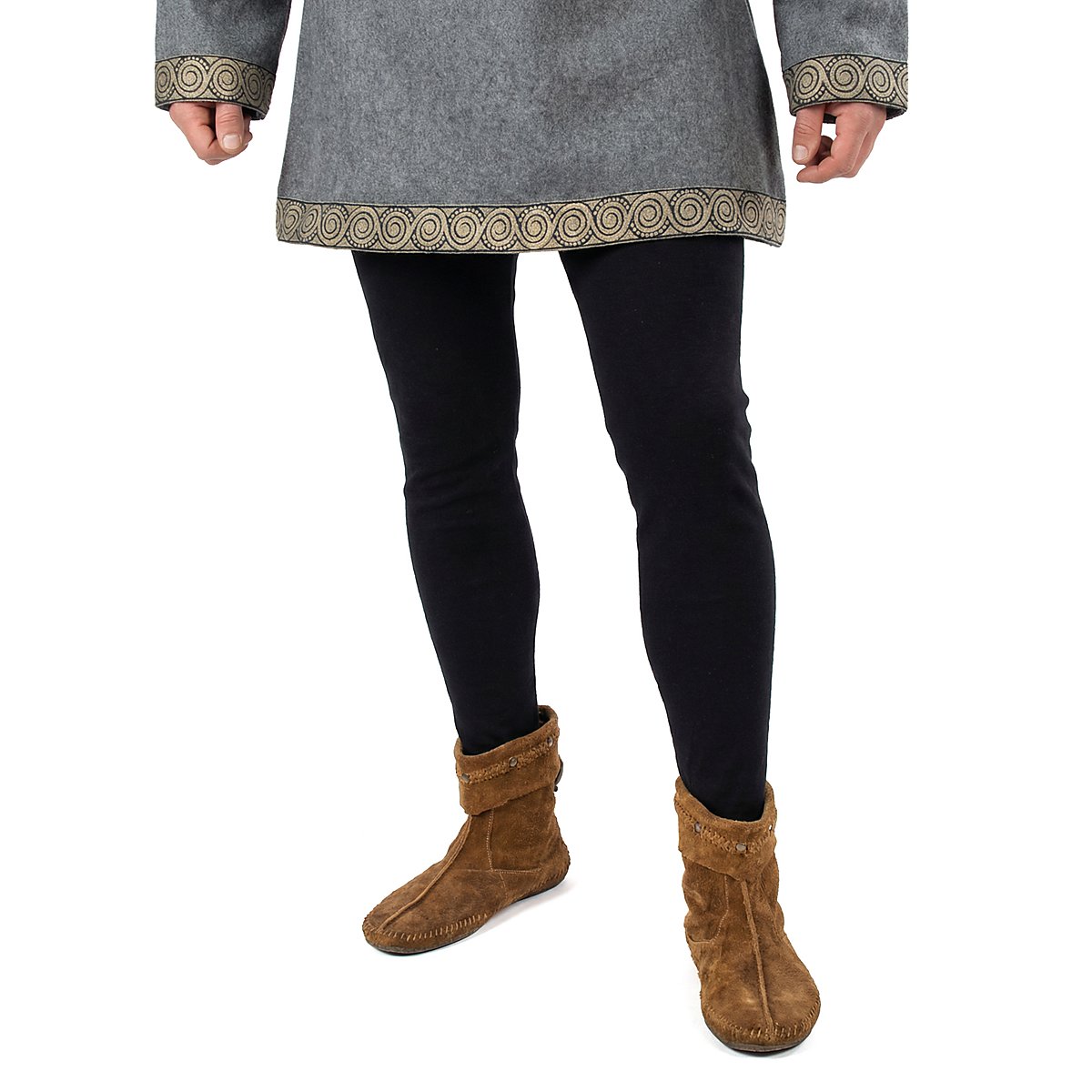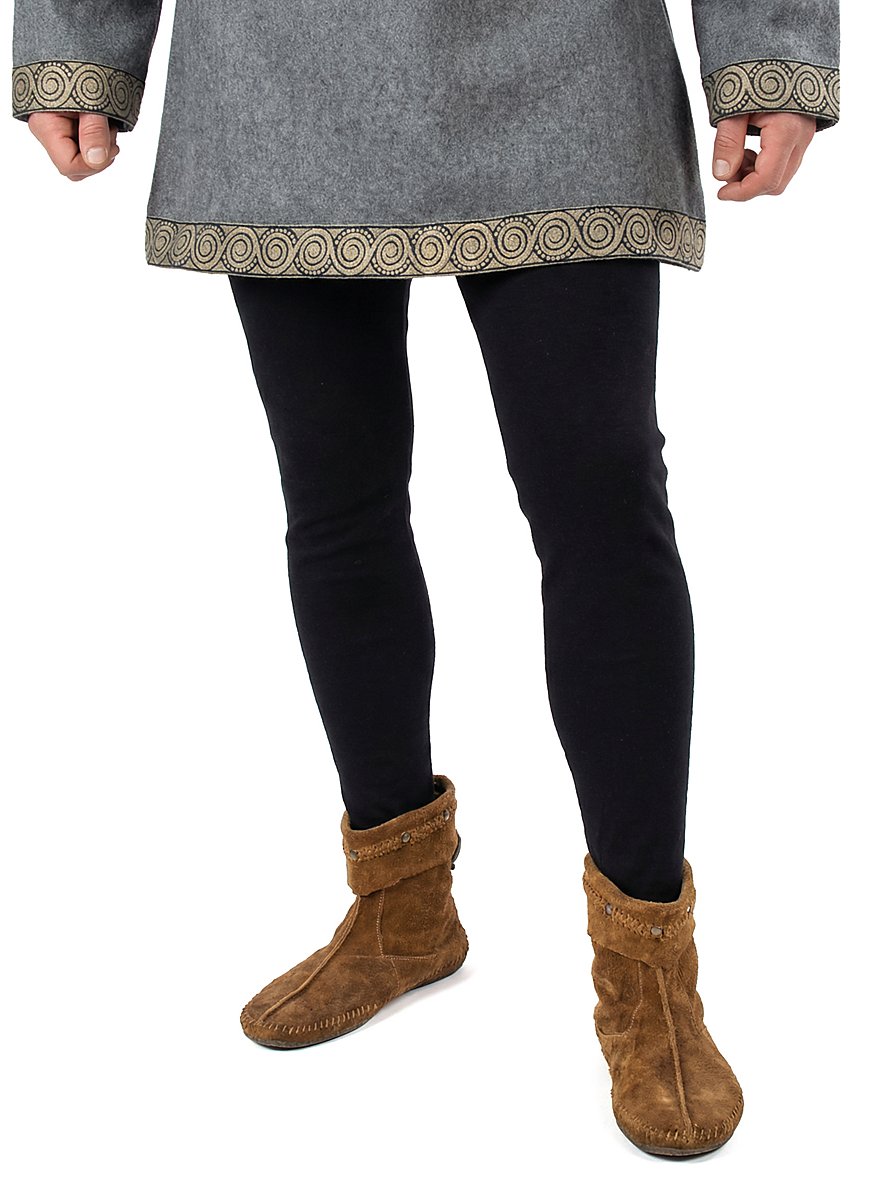 Pantalons, besser bekannt als Strumpfhosen, gibt es bereits seit Beginn des 15. Jahrhunderts. Zuvor trugen die Menschen meist Beinlinge, obwohl teilweise schon viel früher Strümpfe und Hosen zusammengenäht wurden. Unsere schwarzen mittelalterlichen Pantalons sind aus reiner, elastischer Baumwolle gefertigt, die schön weich und besonders angenehm zu tragen ist. Ein elastisches Zugband im Hosenbund garantiert den sicheren Sitz der mittelalterlichen Pantalons, an den Enden der Hosenbeine befindet sich jeweils eine Schlaufe, die den breiteren, für Strumpfhosen obligatorischen Fuß ersetzt und ein Hochrutschen der Pantalons verhindert. Ein überaus bequemes Kleidungsstück!