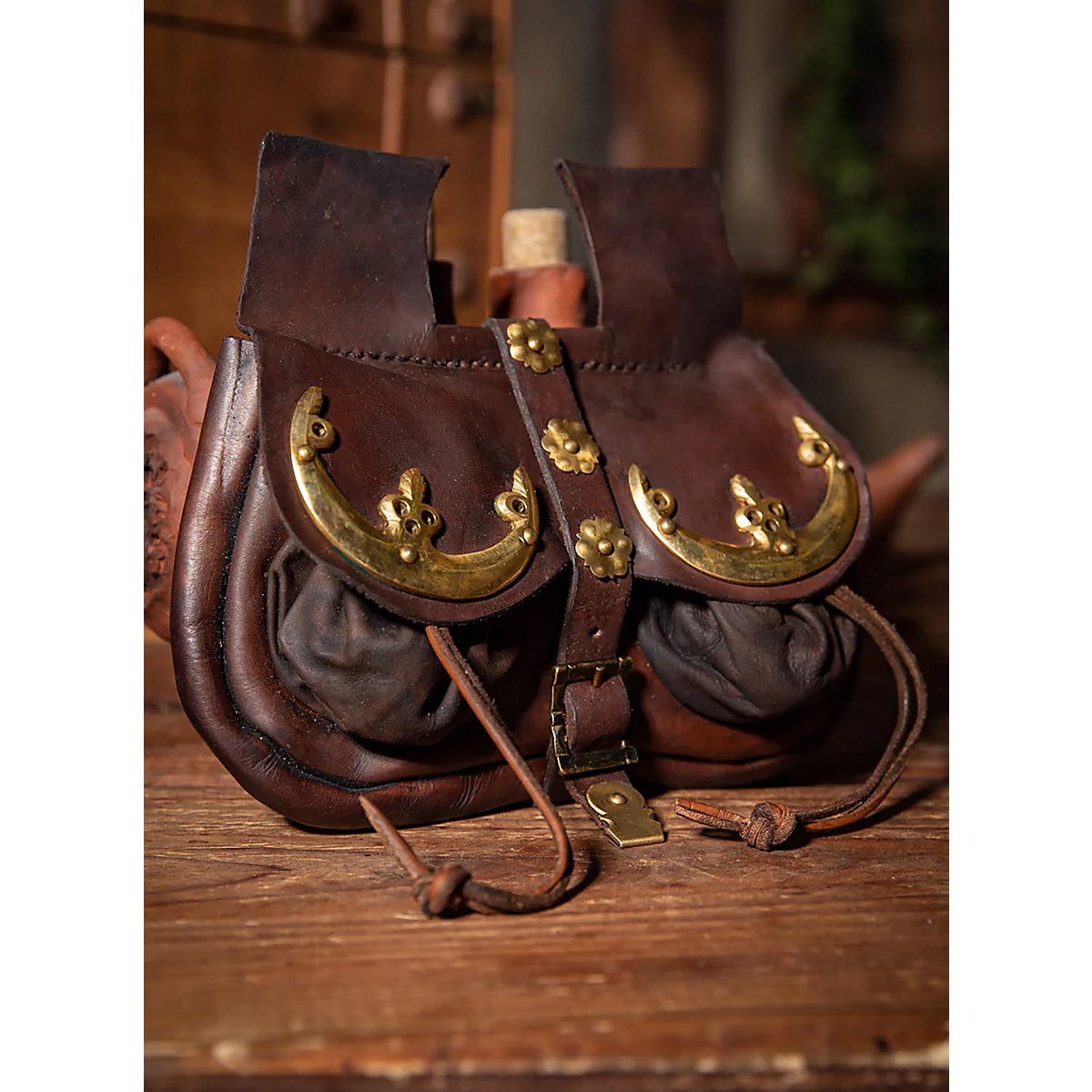 Eine elegante Gürteltasche aus weichem Leder mit Messingbeschlägen nach spätmittelalterlichen Vorbildern.
