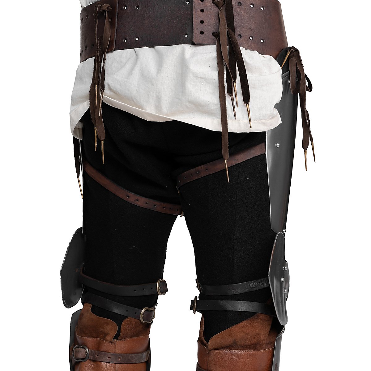 Zur Befestigung empfehlen wir euch unseren Rüstgürtel für Plattenbeine! Zur Not tun es auch Gürtel und Lederbänder. Allerdings würde das im Vergleich euren Tragekomfort deutlich schmälern.