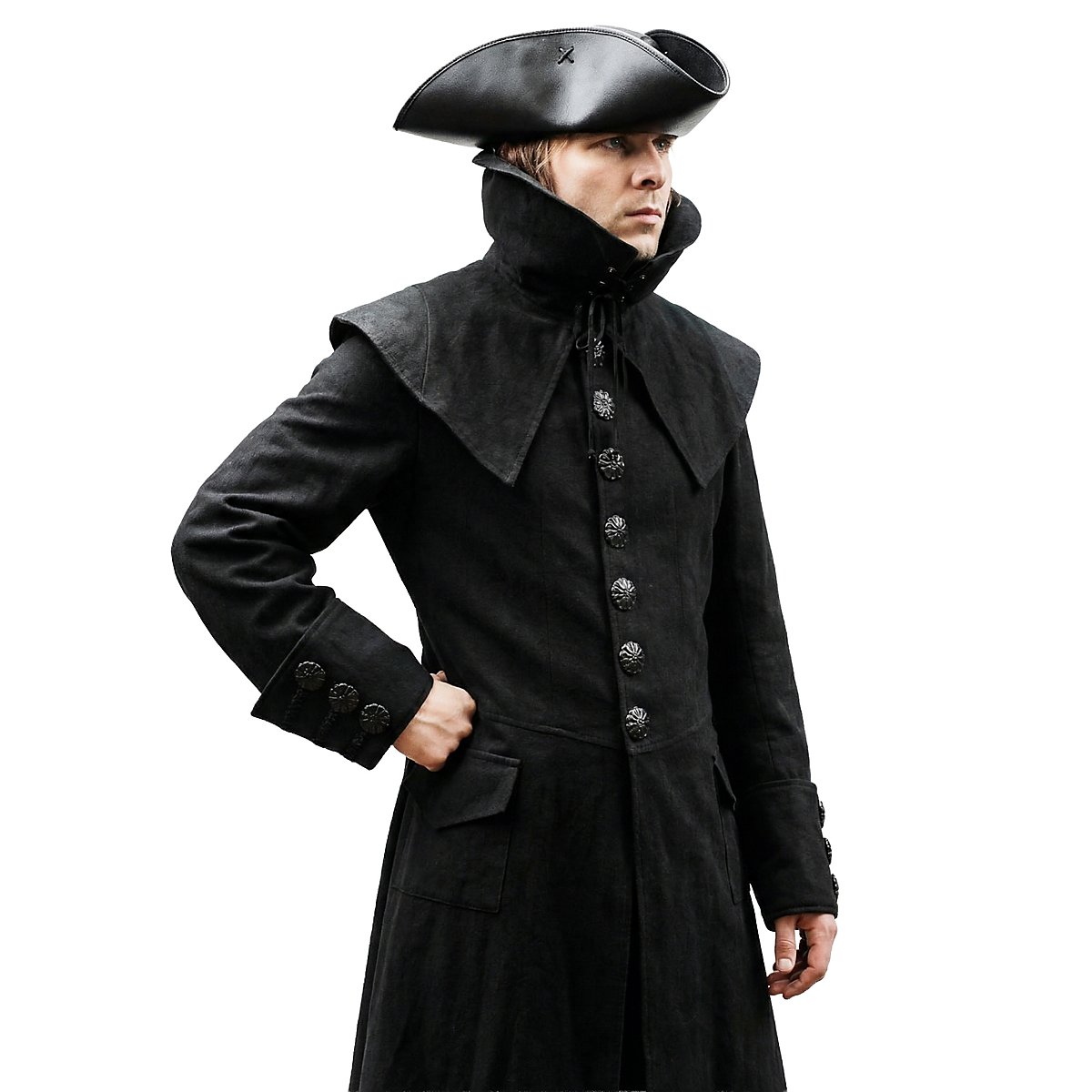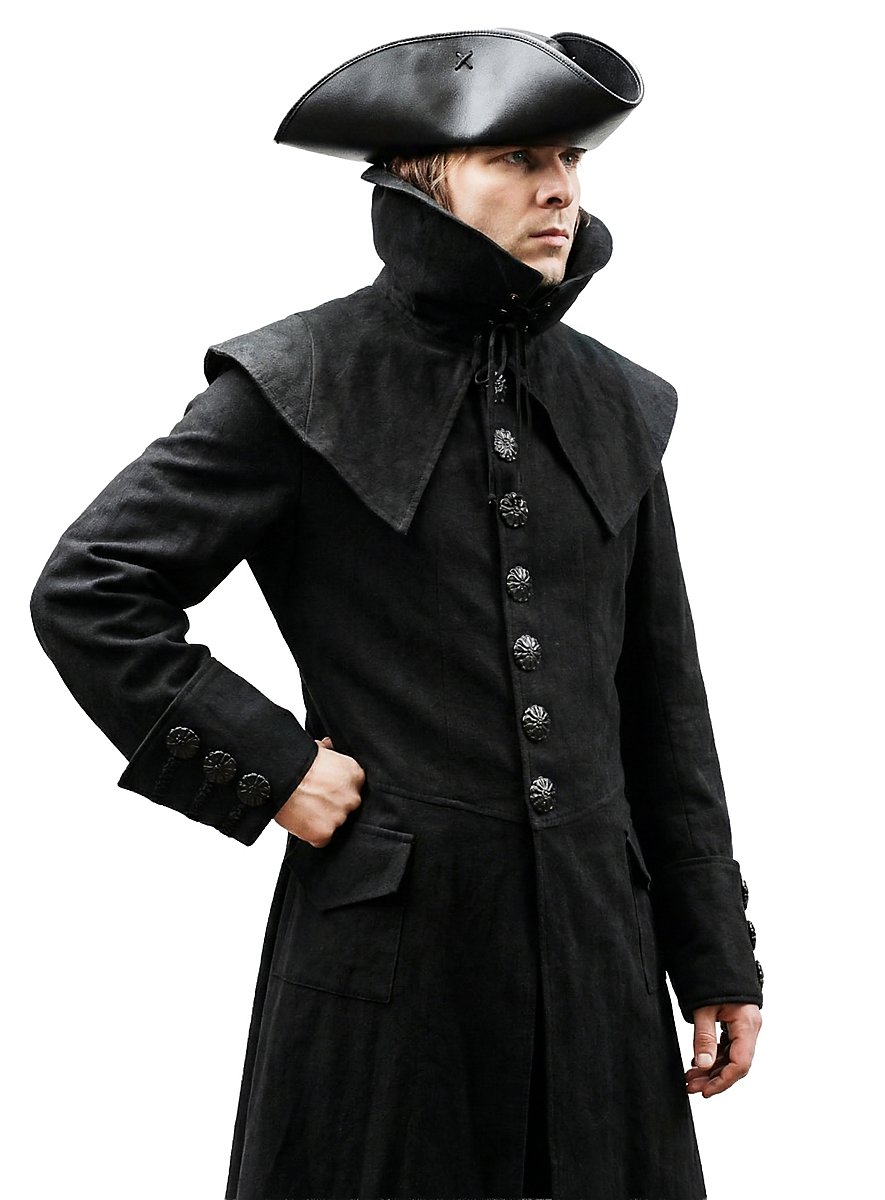 Unser Kutschermantel - Strassenräuberl besteht aus schwarzem Baumwolldrillich und ist zur besseren Bewegungsfreiheit am unteren Rücken und den Seiten geschlitzt. Er wird nicht nur Schurken und Piraten ein treuer Weggefährte sein. Ausgefallen weite Manschetten, welche mit Knöpfen aus Kunststoff und Borte besetzt sind, sowie ein stilvoll breiter Kragen, der aufgeklappt hervorragend als Gesichtsmaske dient, runden seine imposante Erscheinung eindrucksvoll ab.