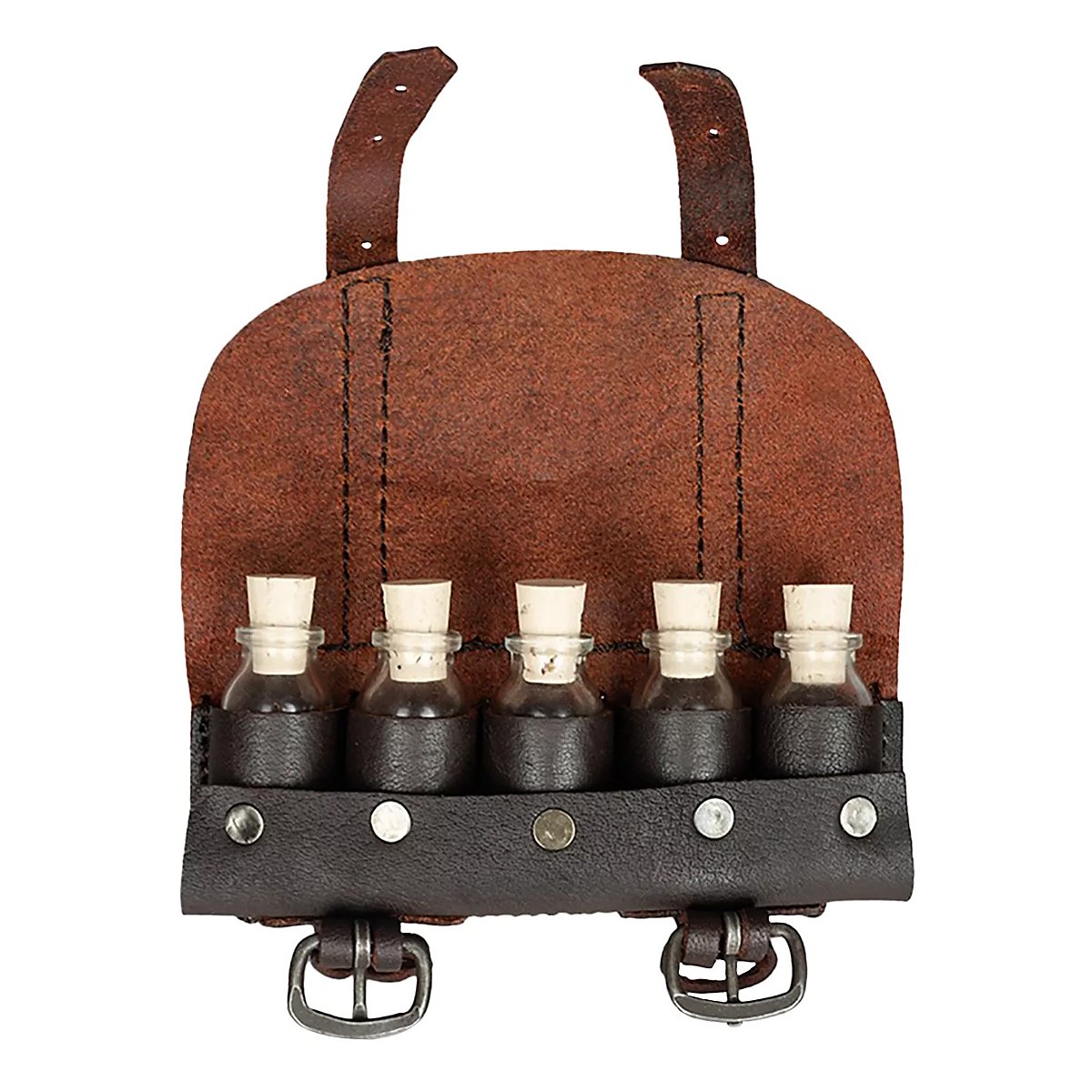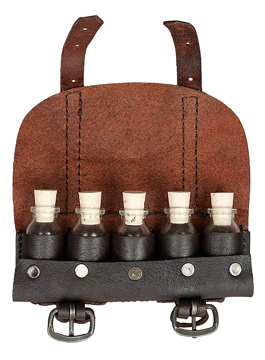Diese kleine Gürteltasche aus Oberleder verbirgt 5 kleine Trankflaschen mit Korken. Diese könnt ihr natürlich mit allem füllen, was der Alchimist, der Heiler oder Giftmischer so benötigen könnte!