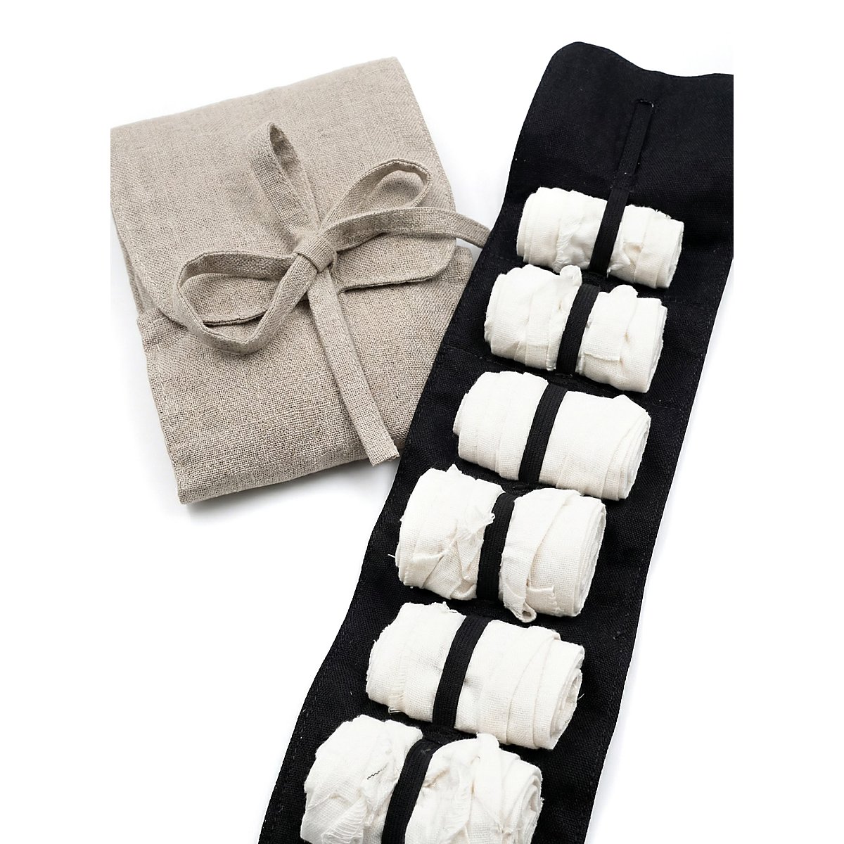 The Calendula bandage is not common medic ware, but rather specially concepted for LARP usage. It is sewed arround so it can`t lose its strings that easily. It has practical laces to string it fastly and knot it open quick again. It is washable and hell, yeah! Its long enough! In other words, perfect for all kinds of medics and healers in LARP.