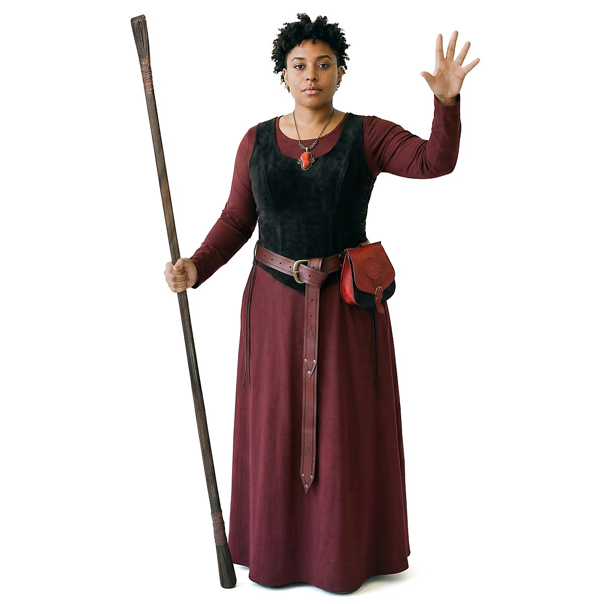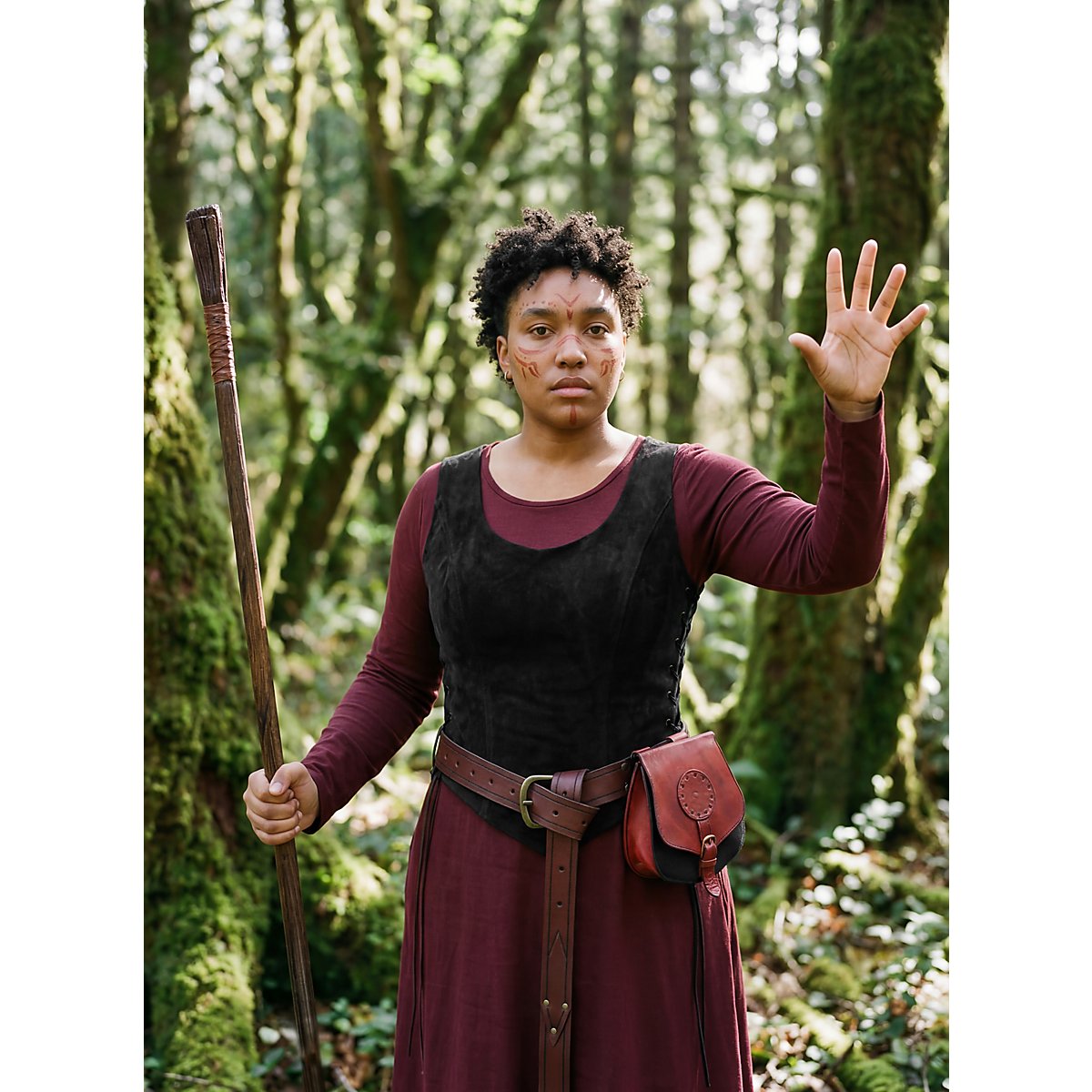 Whether wench or amazon, innkeeper's wife or warrior girl, this bodice made of genuine suede is very versatile: either as armour or as a regular garb. Defend the tavern, wench! Our bodice is handcrafted from durable, high quality velours and the lacing at the sides has stable metal eyelets. Use the leather straps to adjust the bodice to fit your figure. Our Tavern Wench bodice is available in black, in light brown, dark brown, and green.