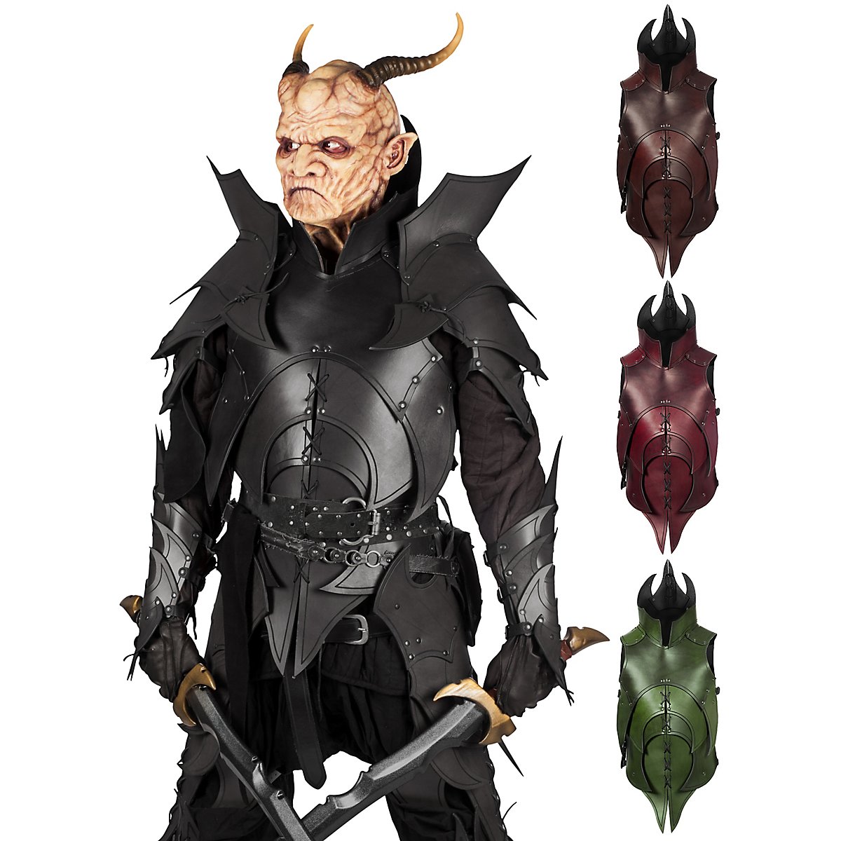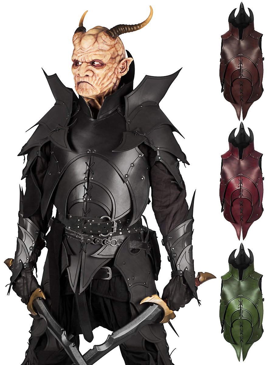 Spikes and sharp edges give the wearer of the demon leather torso a particularly fearsome appearance. The straps and buckles on the side allow the leather armour to be adapted to the wearer's own body. The Demon torso is available in red, black, brown and green.