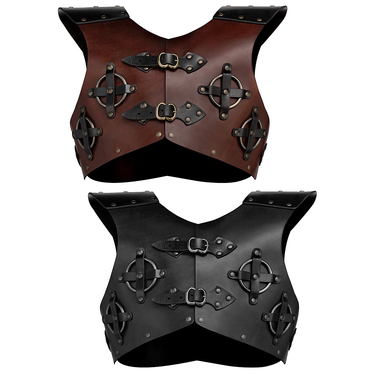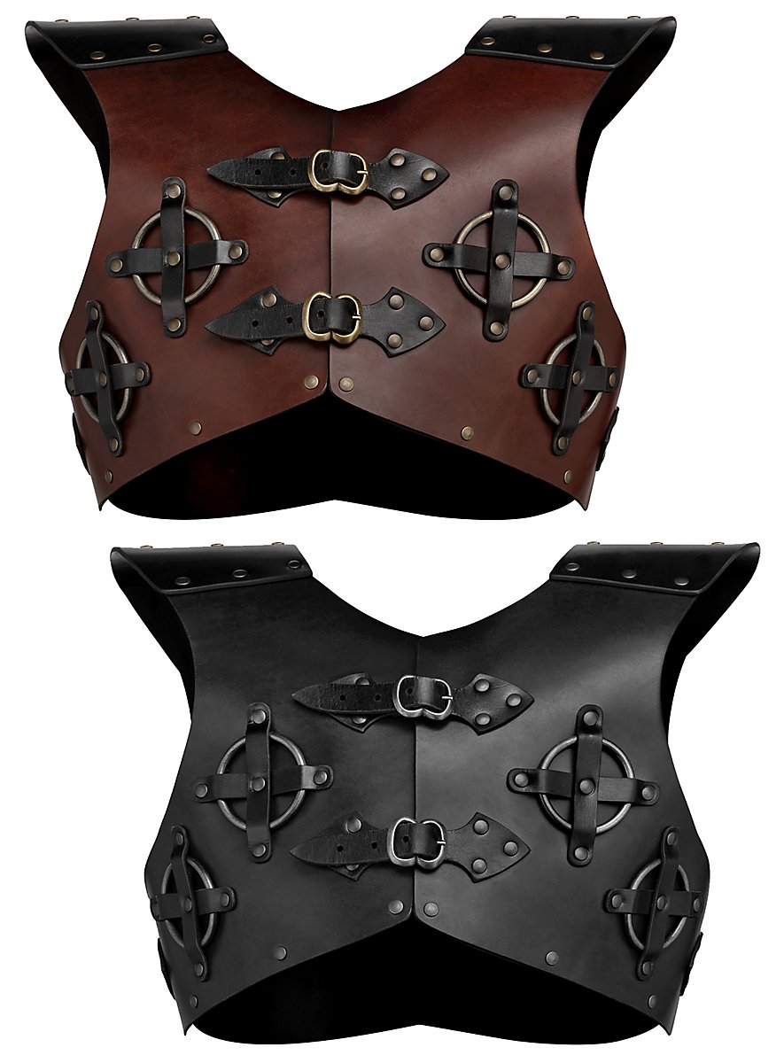This robust leather breastplate is inspired by the Bear School armour from the fantasy game Witcher: Wild Hunt. The solid rings on the chest give the piece of armour its iconic character. Whether for monster hunting, as a reinforcement over chain mail, or to feel like Geralt of Riva, you'll definitely cut a fine figure in the Witch hunter gorget. Shoulders can also be attached to the leather breast guard.
