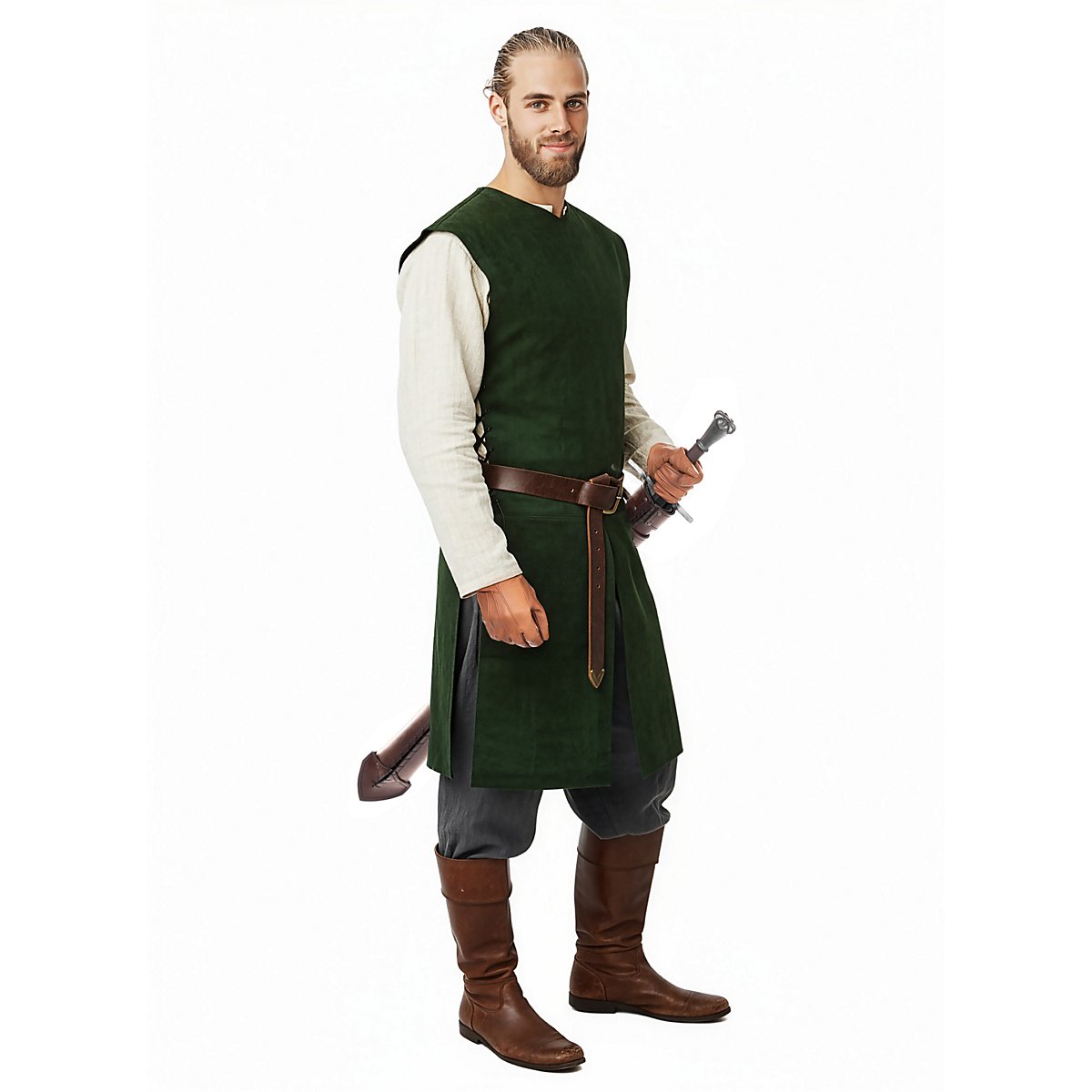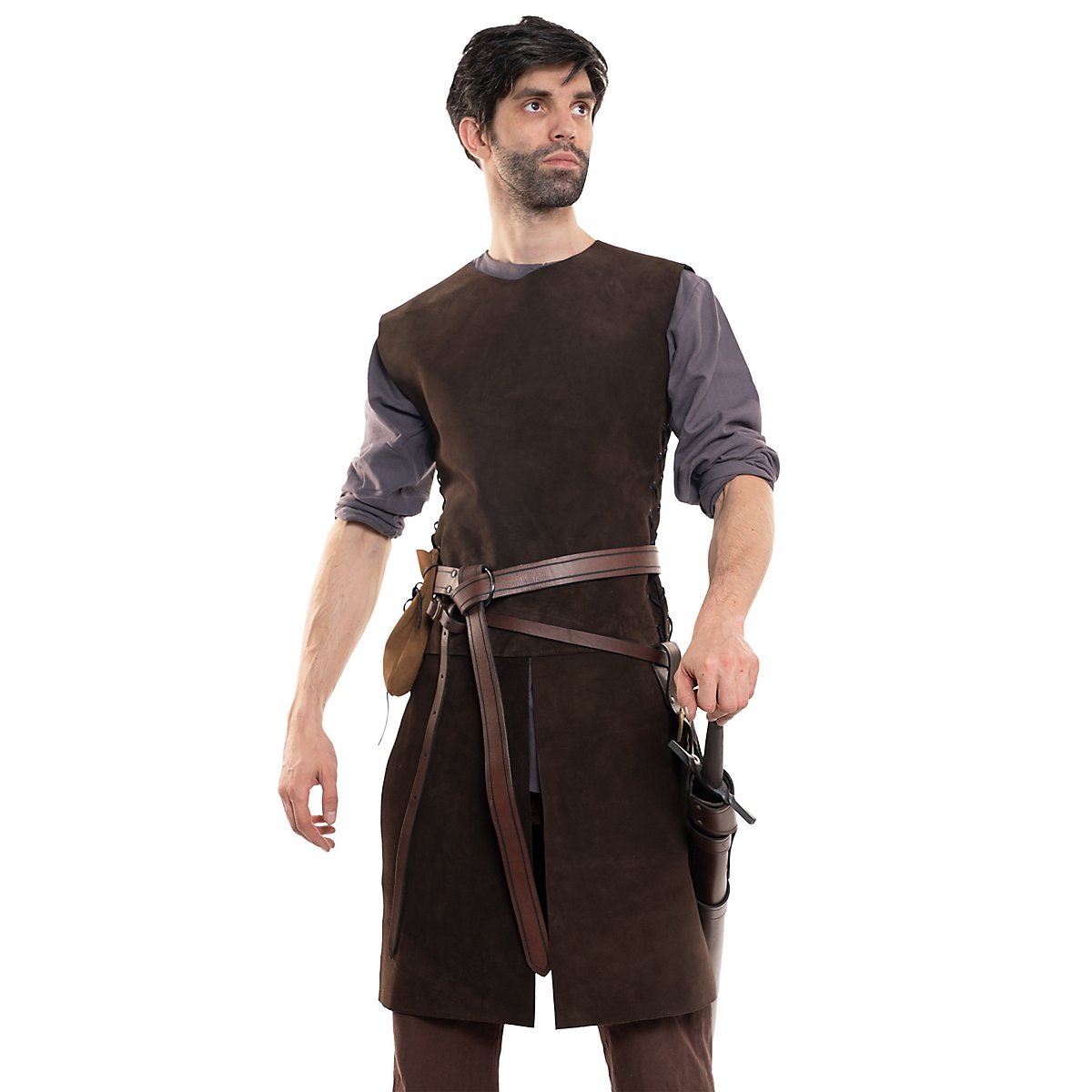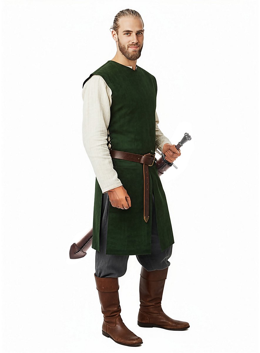 The huntsman jerkin is a perfect versatile base for many LARP outfits, whether for a ranger or a well-camoflaged archer. It is made from genuine naturally tanned suede of the highest quality. The jerkin is open at the sides, but has leather straps for individual adjustment. The split material at the bottom also allows for more mobility as legroom is not restricted - making it ideal for mounted units.