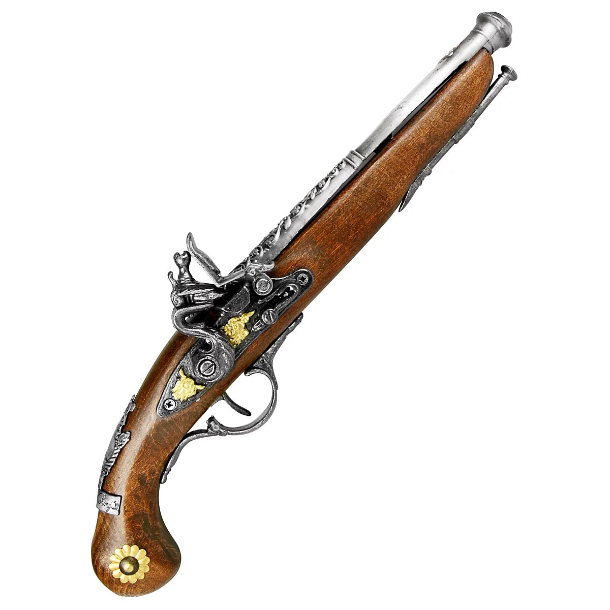 All of our replica handguns have moving parts but do not fire.In the tradition of the armorers and gunsmiths of the past, these replicas have been painstakingly handcrafted in consultation with well preserved pieces in armory collections and historical drawings and prototypes.The wooden parts are real wood and the metal parts are made of a high-strength zinc-aluminum alloy.Specially-developed imitation ivory is used for all ivory handles and decorations.