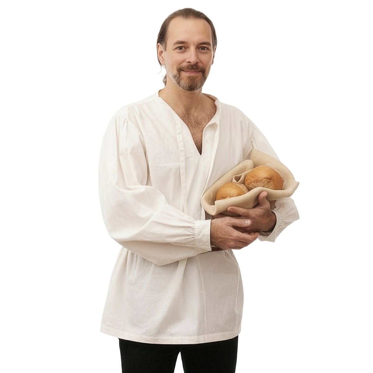 OurShirt - Ramius is the same type of lightweight shirt made of 100 percent unbleached cotton that workers and peasants would have worn during the Renaissance. It is comfortable and roomy, and cut to be worn outside of the braies or hose that workers covered their legs with. Even lords of the manor would sometimes wear shirts like this peasant shirt – when hunting, for example.