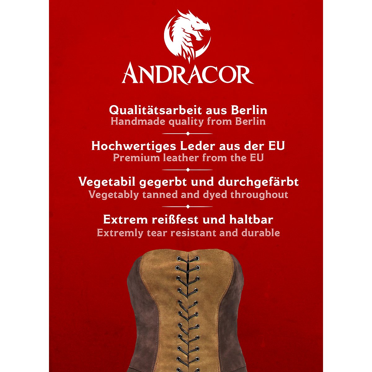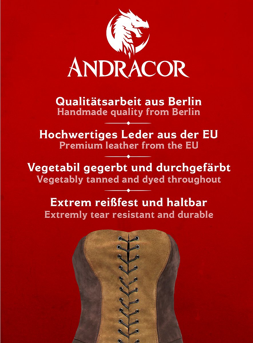 No matter if you are a forest elf or a dwarven warrior; a robust leather bodice is part of the basic equipment of many fantasy characters. The corset skirt - novice can be individually adapted to its wearer by laced leather straps on the sides, front and back. Its two colours, the light one in the middle, make it look narrower. This is especially good for elf characters. It can be combined in many ways with other Andracor leather accessories and is an ideal basic garment for larper women who want to appear as magicians, elves, dwarves or fantastical adventurers.
