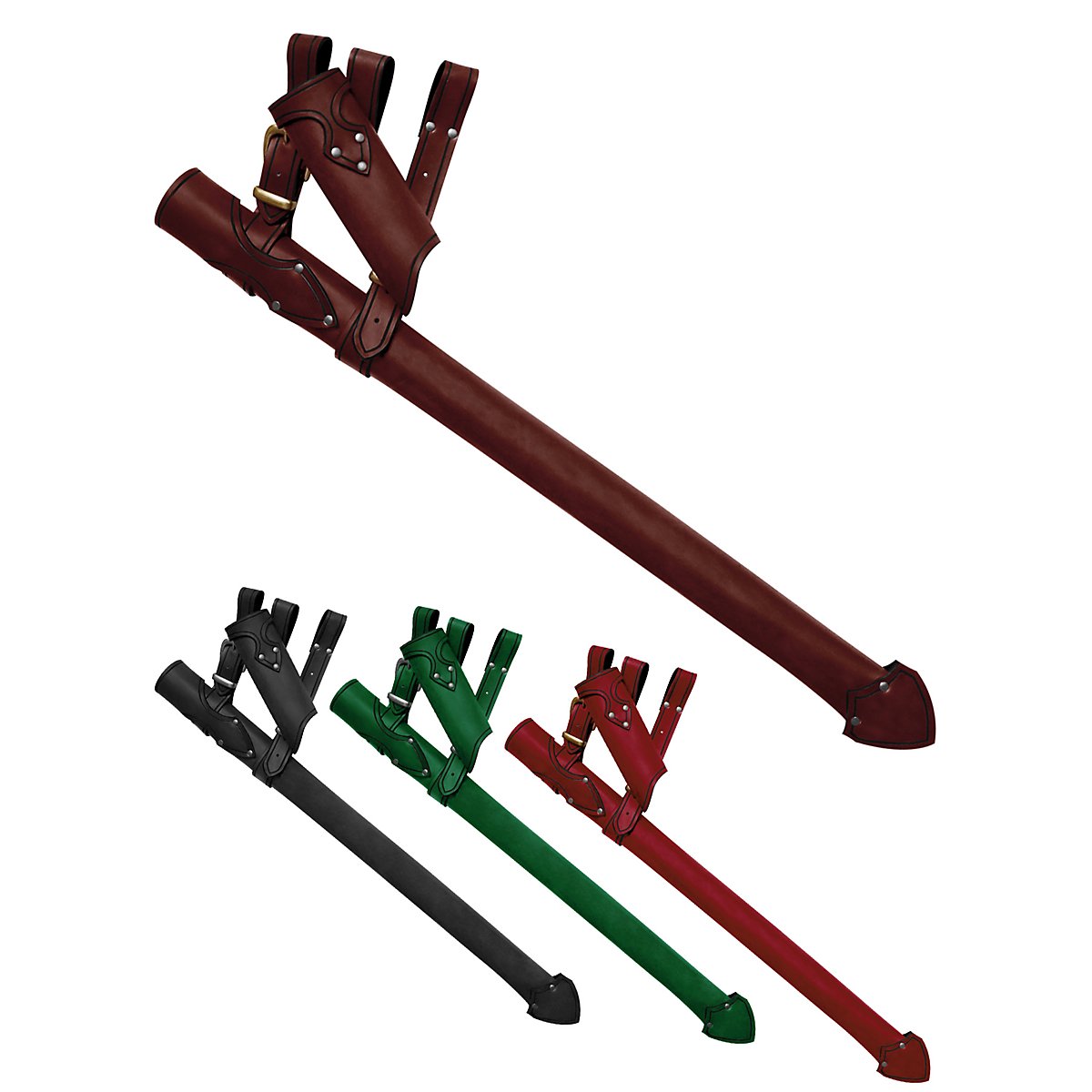 Our weapons belt - Knight has a closed scabbard and a flexible, versatile and open weapon holder. All parts are made of vegetable-tanned, heavy grade leather with a thickness of 3-4 mm. The 90 cm long scabbard has a diameter of approx. 5.5 cm and is fastened to the belt with two adjustable leather straps. The strap on the back stretches along the scabbard for a comfortable fit. The open weapon holder has an inner circumference of approx. 5.5 cm and is suitable for most LARP weapons. The weapons belt - Knight can be made for the left or right side of the body as required and is available in black, brown, green and red.