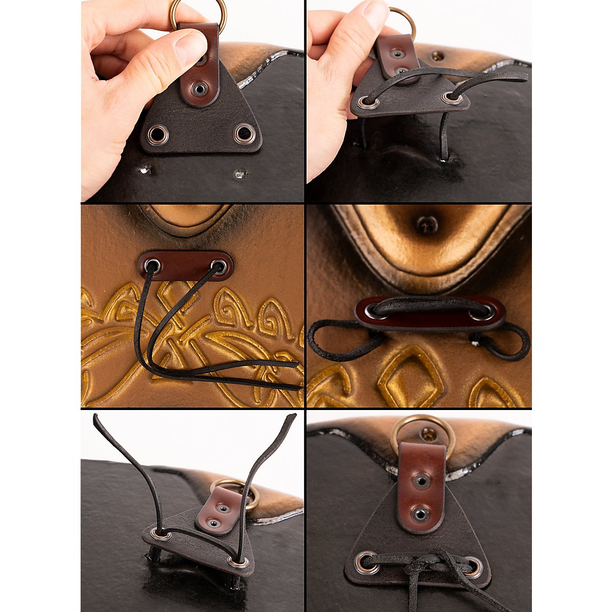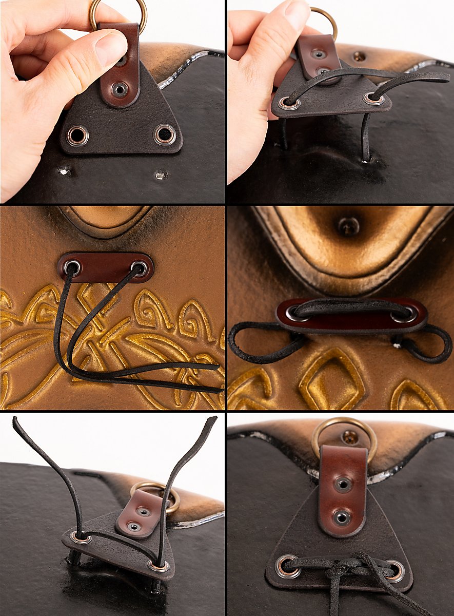 • Enfilez la sangle en cuir dans les œillets, puis dans les deux trous du bouclier. Une aiguille épaisse peut vous aider.