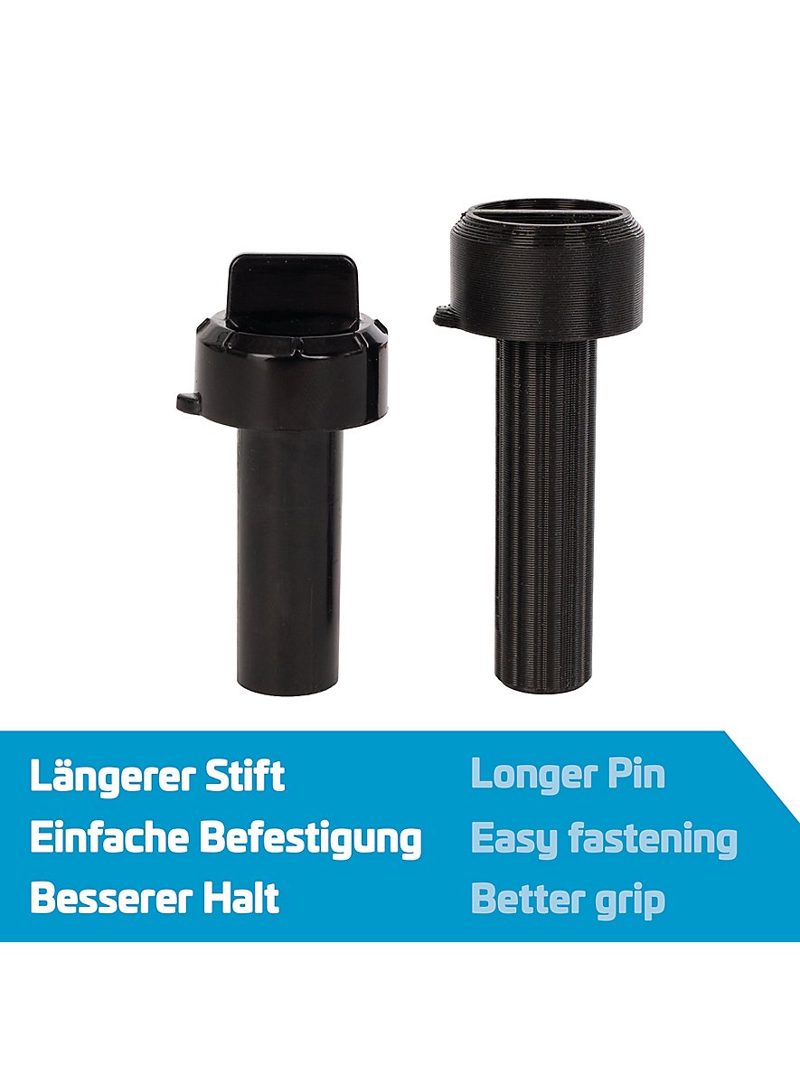 Cette goupille de rechange a été conçue pour être une copie exacte de l'originale et fonctionne tout aussi simplement. Placez le blaster sur le trépied, insérez la goupille dans l'ouverture prévue et tournez-la légèrement jusqu'à ce que le verrou à baïonnette intégré s'enclenche solidement. Votre blaster est maintenant de nouveau connecté de manière stable au trépied et prêt pour la prochaine bataille.