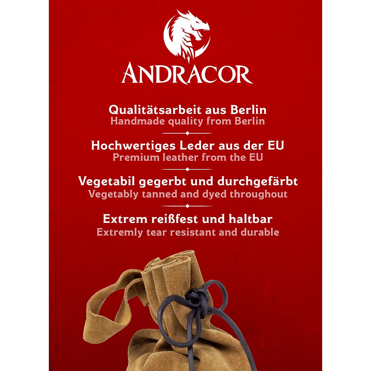 Tous les produits Andracor sont conçus et fabriqués à la main à Berlin depuis 1999. La sélection rigoureuse de matériaux de haute qualité et l'expérience de nos collaborateurs garantissent un niveau de qualité particulièrement élevé. Ainsi, nous fabriquons des produits que nous avons nous-mêmes envie de porter et qui sont parfaitement adaptés aux exigences des GN.