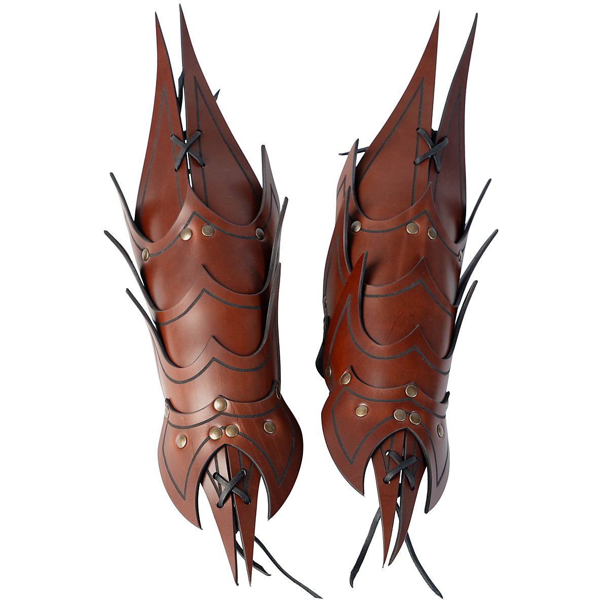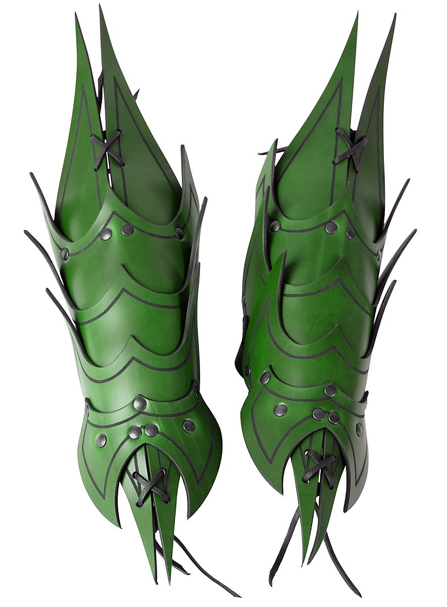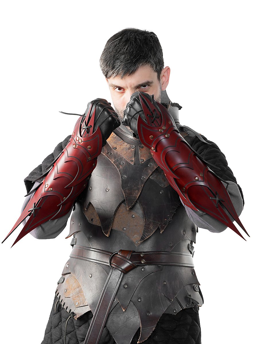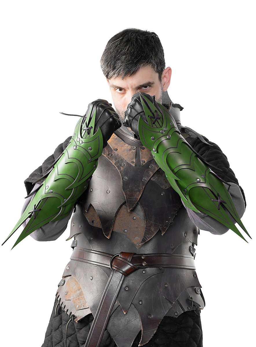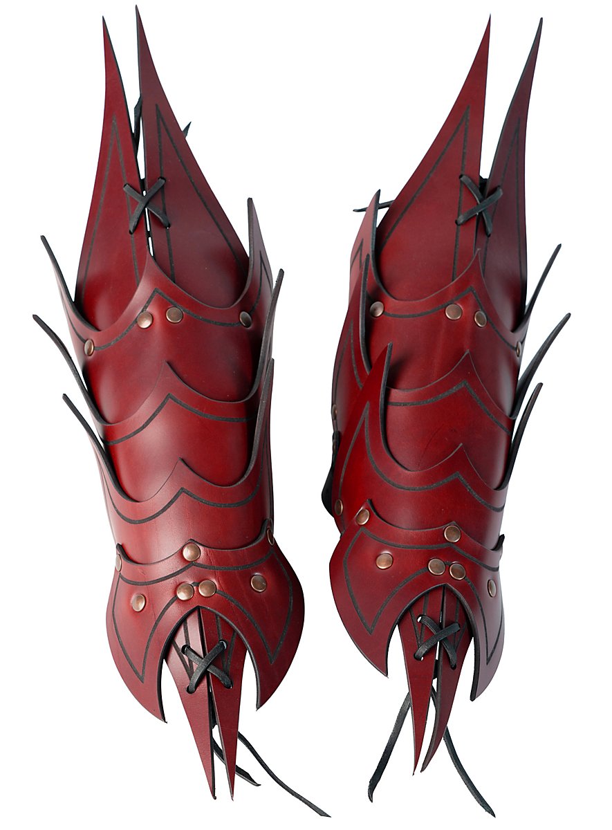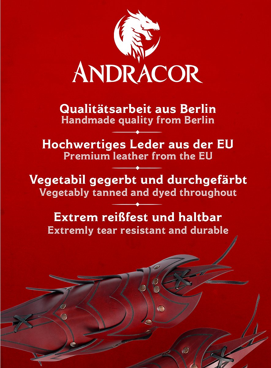 Ils sont faits de cuir végétal tanné de 3 à 4 mm d'épaisseur et sont décorés d'une rainure. Grâce à leur construction, qui leur confère une grande flexibilité, ces armures d'avant-bras offrent une excellente protection, en particulier lorsque plusieurs couches de cuir d'environ 3 à 4 mm d'épaisseur et partiellement rivetées l'une sur l'autre se superposent directement. Grâce aux trois sangles et boucles métalliques avec lesquelles chaque bretelle est fermée, les bracelets démon sont réglables individuellement et attirent le regard en Larp. Les bracelets sont disponibles en noir, brun, vert et rouge.