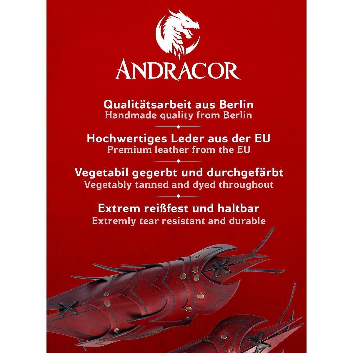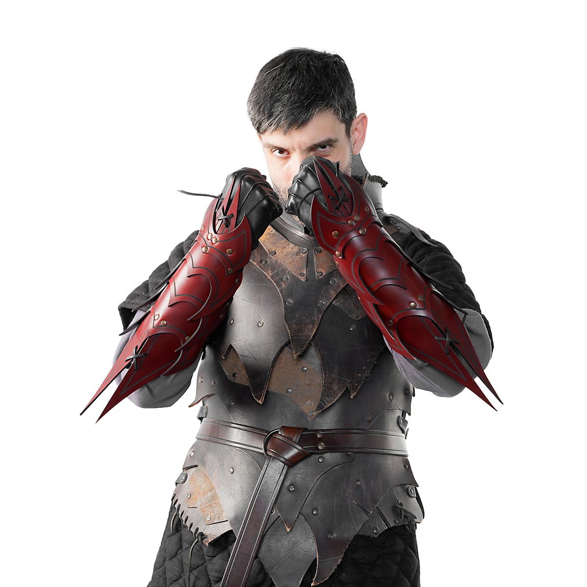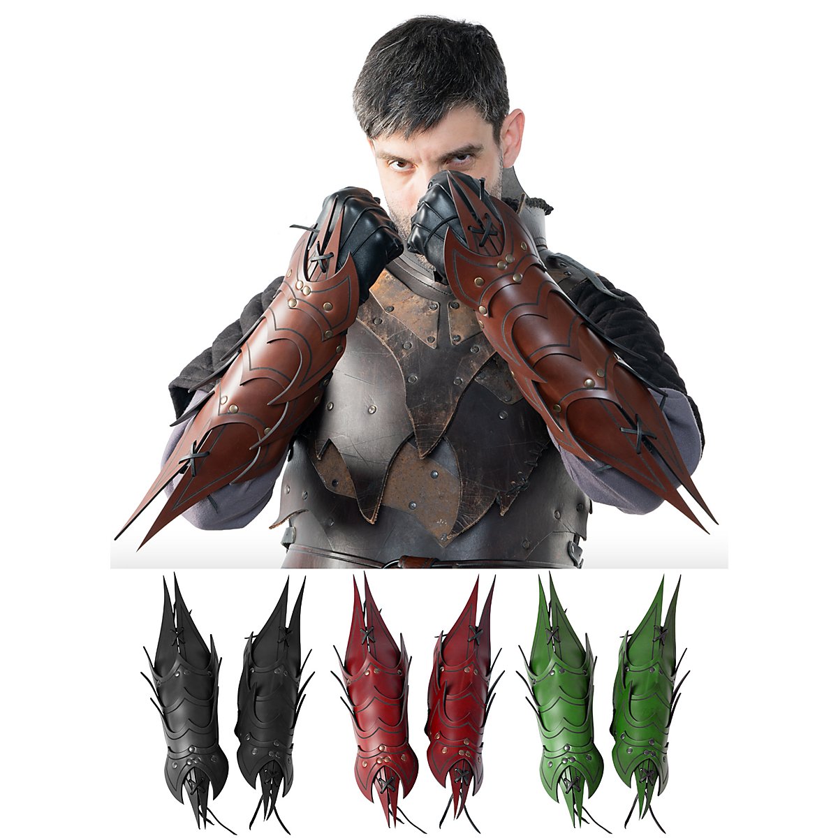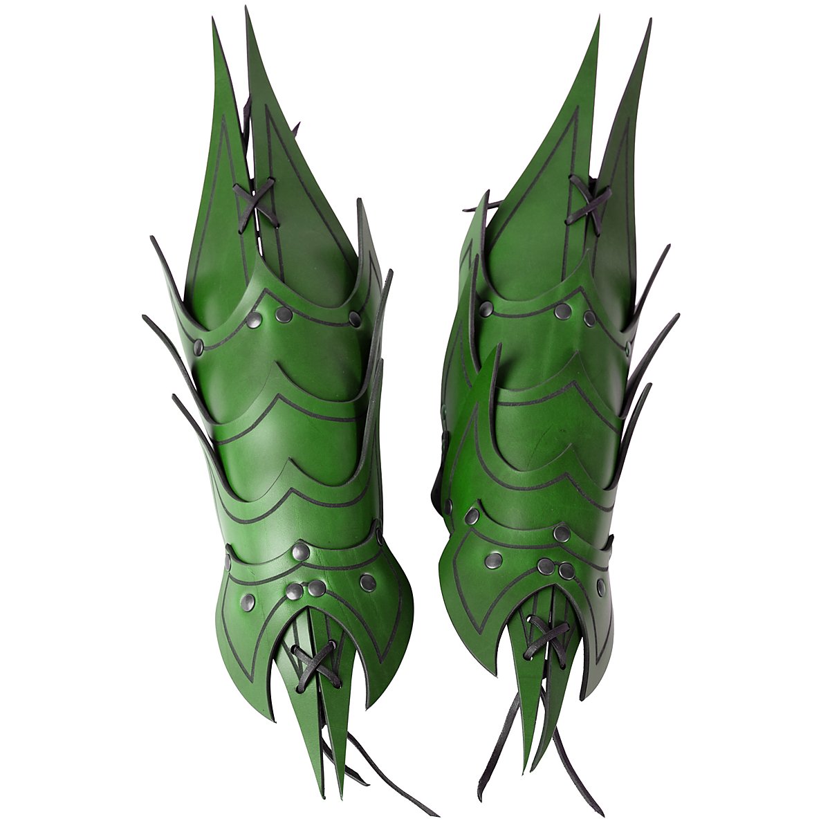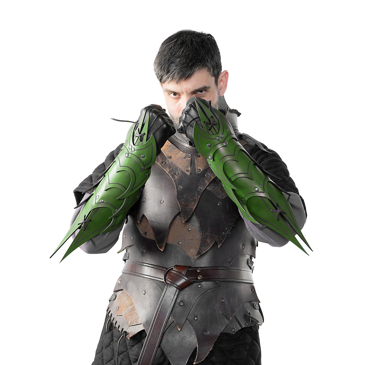 Ils sont faits de cuir végétal tanné de 3 à 4 mm d'épaisseur et sont décorés d'une rainure. Grâce à leur construction, qui leur confère une grande flexibilité, ces armures d'avant-bras offrent une excellente protection, en particulier lorsque plusieurs couches de cuir d'environ 3 à 4 mm d'épaisseur et partiellement rivetées l'une sur l'autre se superposent directement. Grâce aux trois sangles et boucles métalliques avec lesquelles chaque bretelle est fermée, les bracelets démon sont réglables individuellement et attirent le regard en Larp. Les bracelets sont disponibles en noir, brun, vert et rouge.