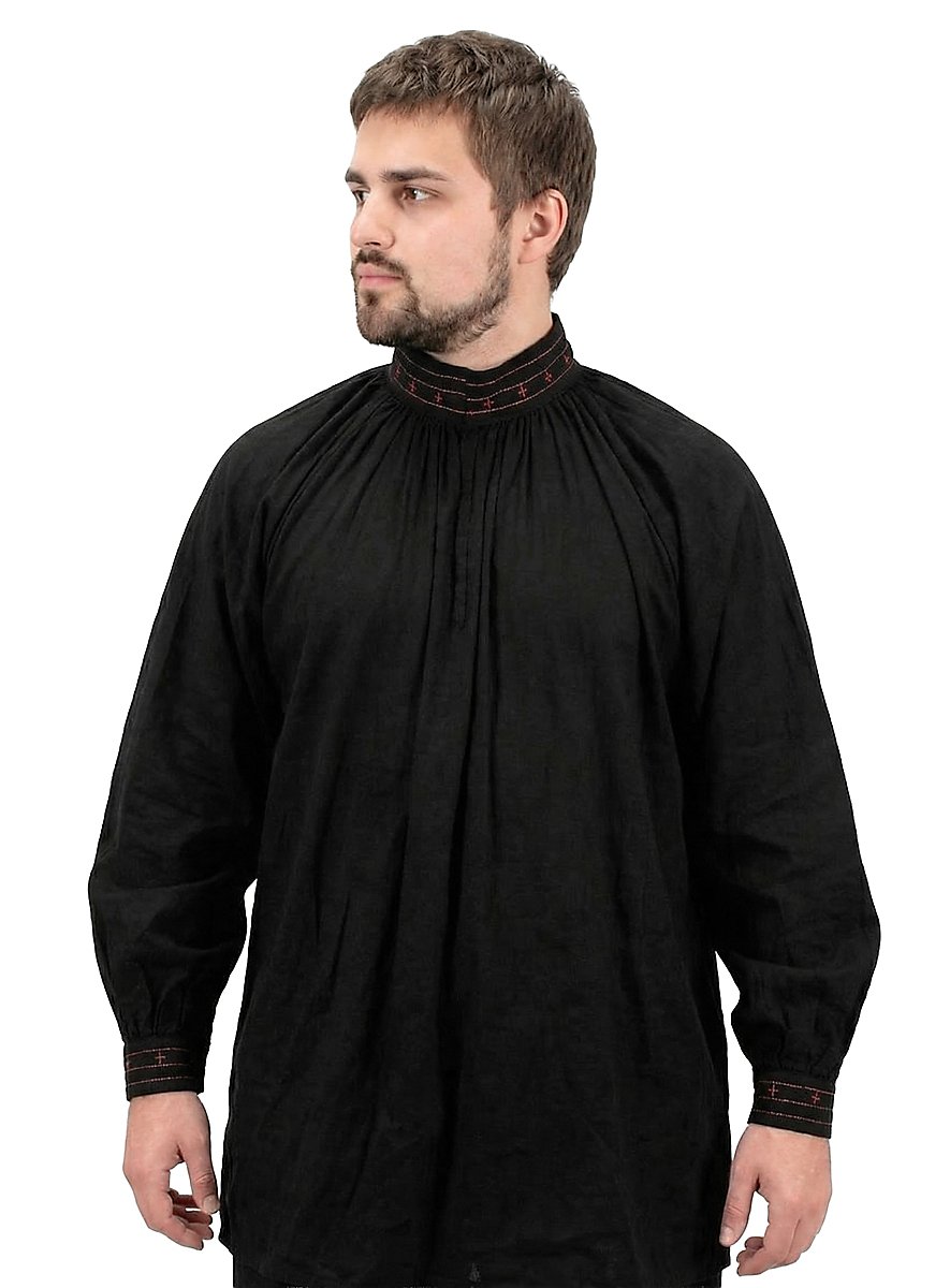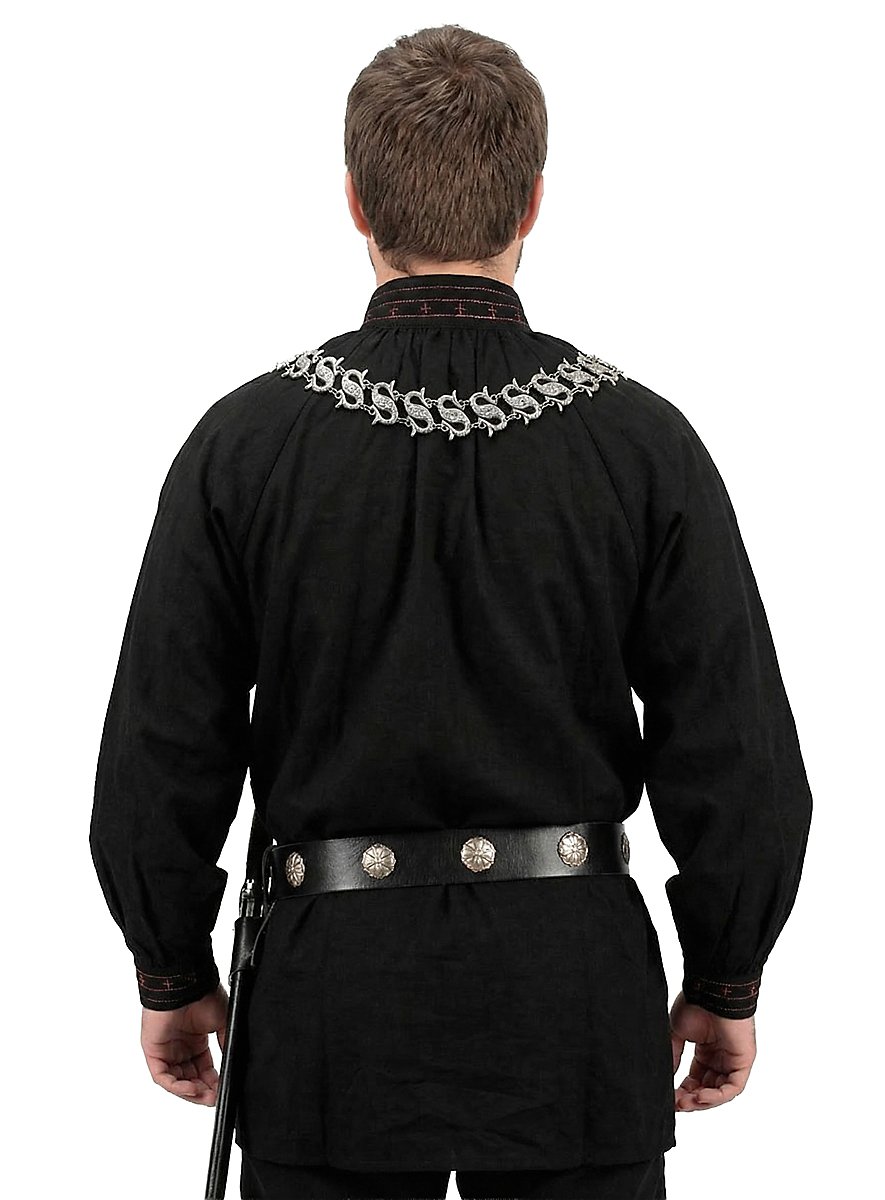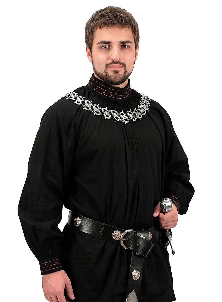 Les plus anciennes références à Robin Hood datent du XIIIe siècle. Aujourd'hui, on part du fait que le nom de « Robin Hood » était un surnom, utilisé pour les hors la loi et les voleurs de grand chemin. L'image romantique de l'homme qui volait les riches pour le donner aux pauvres apparut seulement au XIXe siècle. siècle. Cette touche d'aventures et de romantisme entoure également la chemise noire de Robin des bois. Des coutures rouges et des croix rouges cousues ornent à la fois le col orné de volants et les extrémités des manches également ornées de volants, qui arborent respectivement deux boutons fonctionnels au motif floral. Deux crochets qui permettent d'ouvrir la chemise jusqu'à la poitrine, idéal pour les jours de chaleur estivale, se trouvent sur le col. La chemise Robin des bois est agréablement légère et aérée, tout en étant robuste grâce à l'utilisation de coton pur, comme il se doit pour la chemise d'un aventurier.