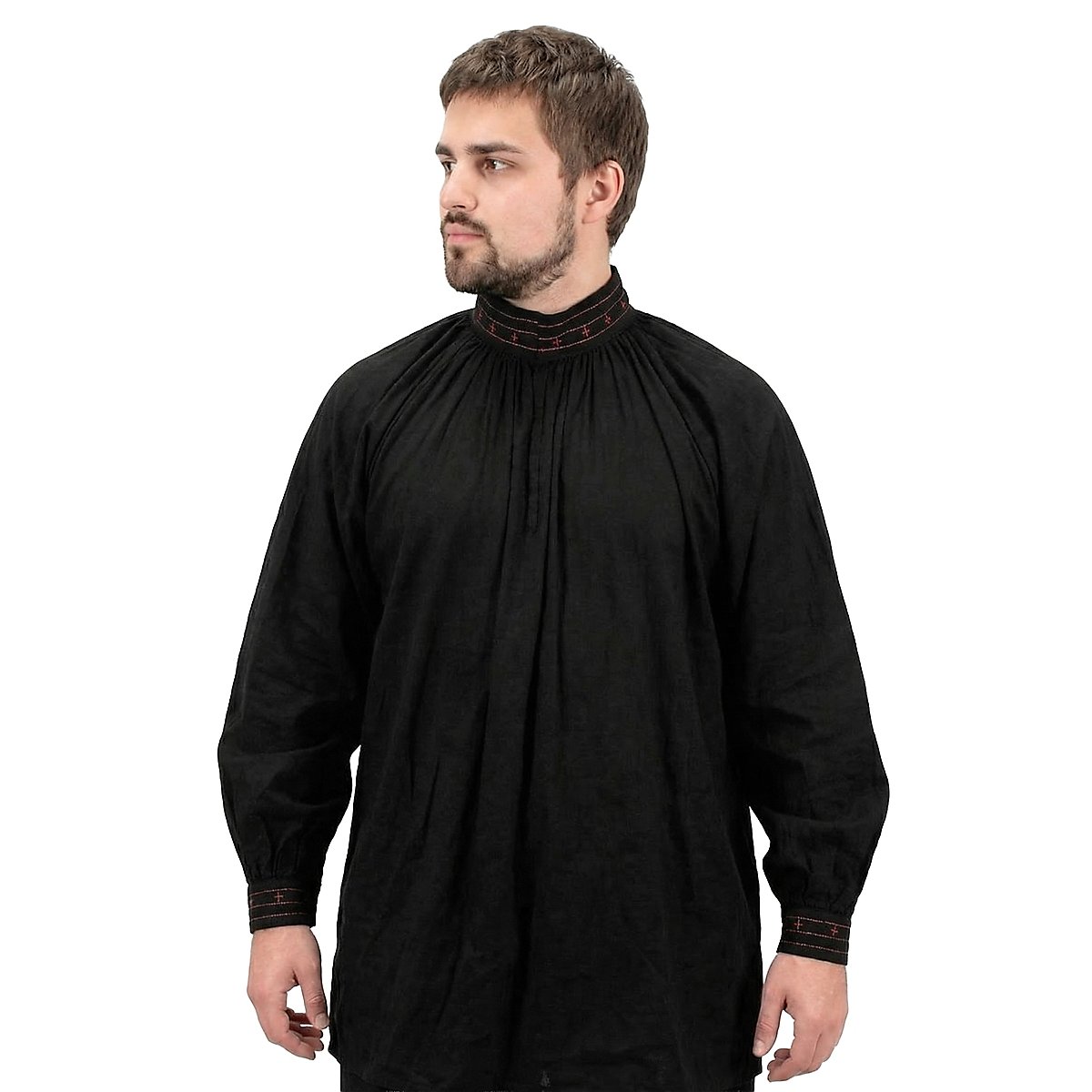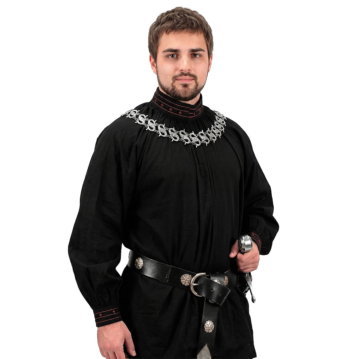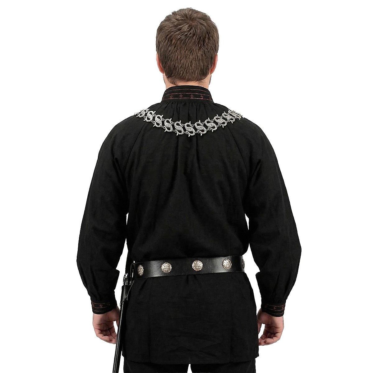 Les plus anciennes références à Robin Hood datent du XIIIe siècle. Aujourd'hui, on part du fait que le nom de « Robin Hood » était un surnom, utilisé pour les hors la loi et les voleurs de grand chemin. L'image romantique de l'homme qui volait les riches pour le donner aux pauvres apparut seulement au XIXe siècle. siècle. Cette touche d'aventures et de romantisme entoure également la chemise noire de Robin des bois. Des coutures rouges et des croix rouges cousues ornent à la fois le col orné de volants et les extrémités des manches également ornées de volants, qui arborent respectivement deux boutons fonctionnels au motif floral. Deux crochets qui permettent d'ouvrir la chemise jusqu'à la poitrine, idéal pour les jours de chaleur estivale, se trouvent sur le col. La chemise Robin des bois est agréablement légère et aérée, tout en étant robuste grâce à l'utilisation de coton pur, comme il se doit pour la chemise d'un aventurier.