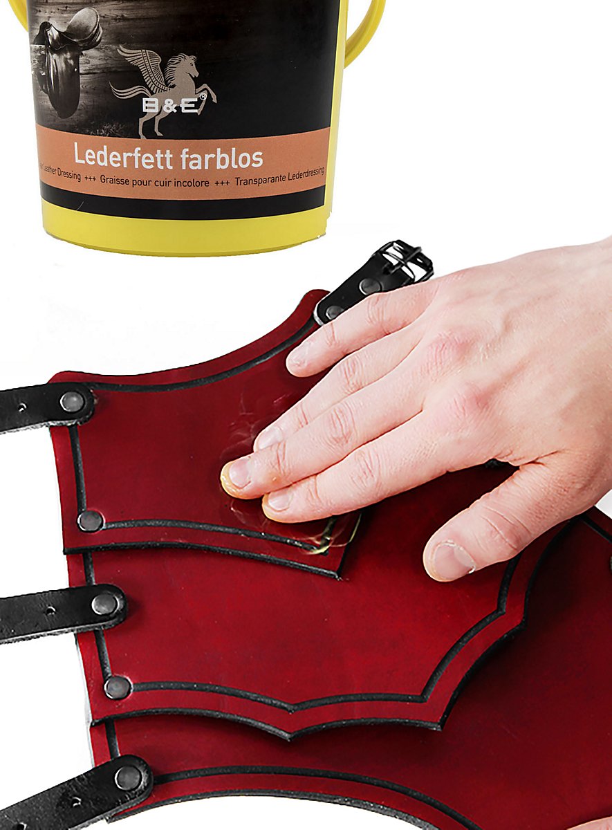 Le cuir est un produit naturel. En tant que tel, il réagit à la chaleur, à l'humidité, aux rayons du soleil, à la transpiration et aux autres facteurs renontrés en GN. Pour que vous puissiez profiter longtemps de votre élégante armure en cuir, nous vous conseillons de l'entretenir régulièrement. Notre graisse pour cuir entre alors en jeu ! Elle se compose de vaseline, d'huile et de graisses, pènètre rapidement le cuir et permet au cuir de garder sa souplesse. Appliquez simplement une fine couche avec un chiffon ou une éponge, laissez pénétrer, et le tour est joué ! Elle imperméabilise également vos armures et accessoires, qui pourront alors résister sans problème aux averses !