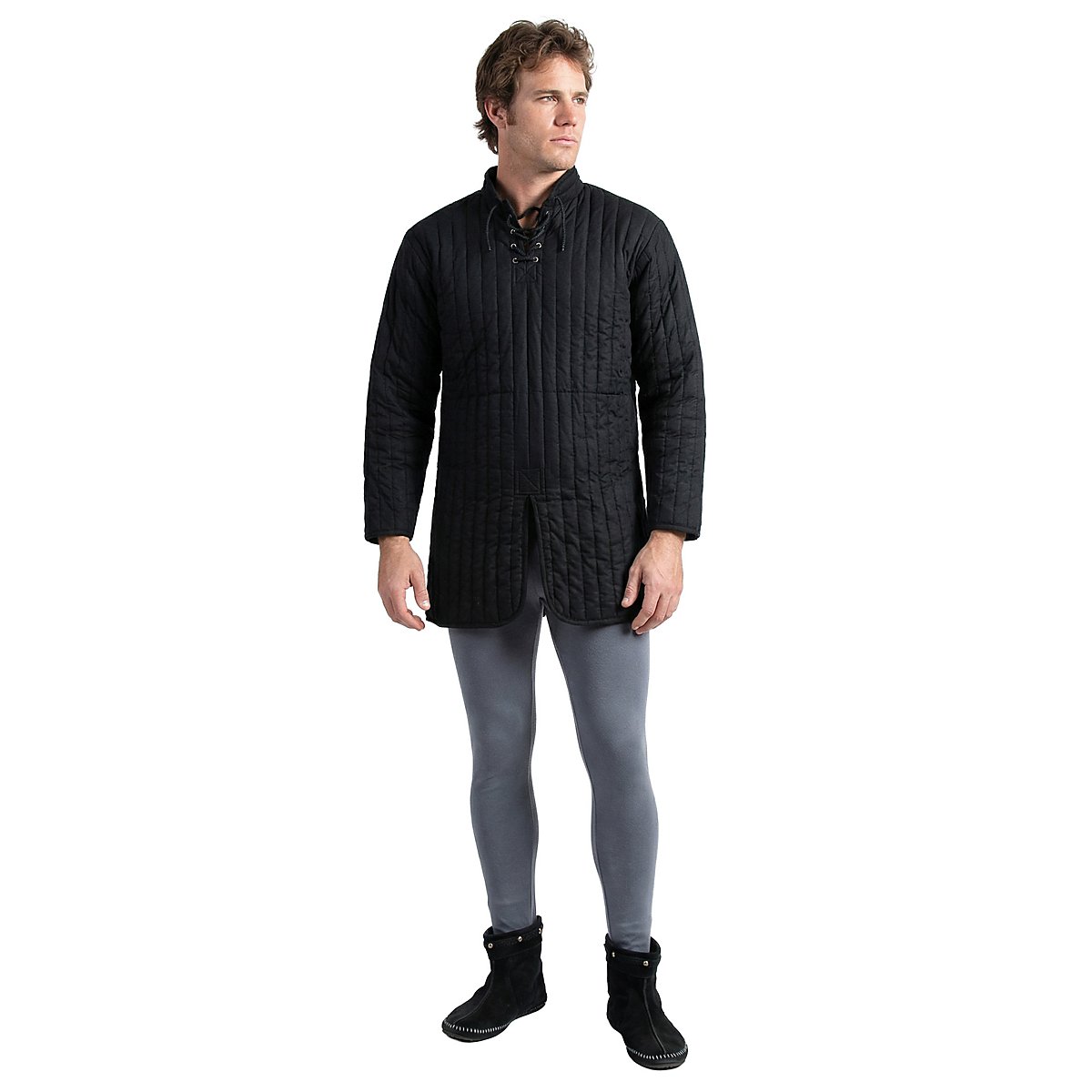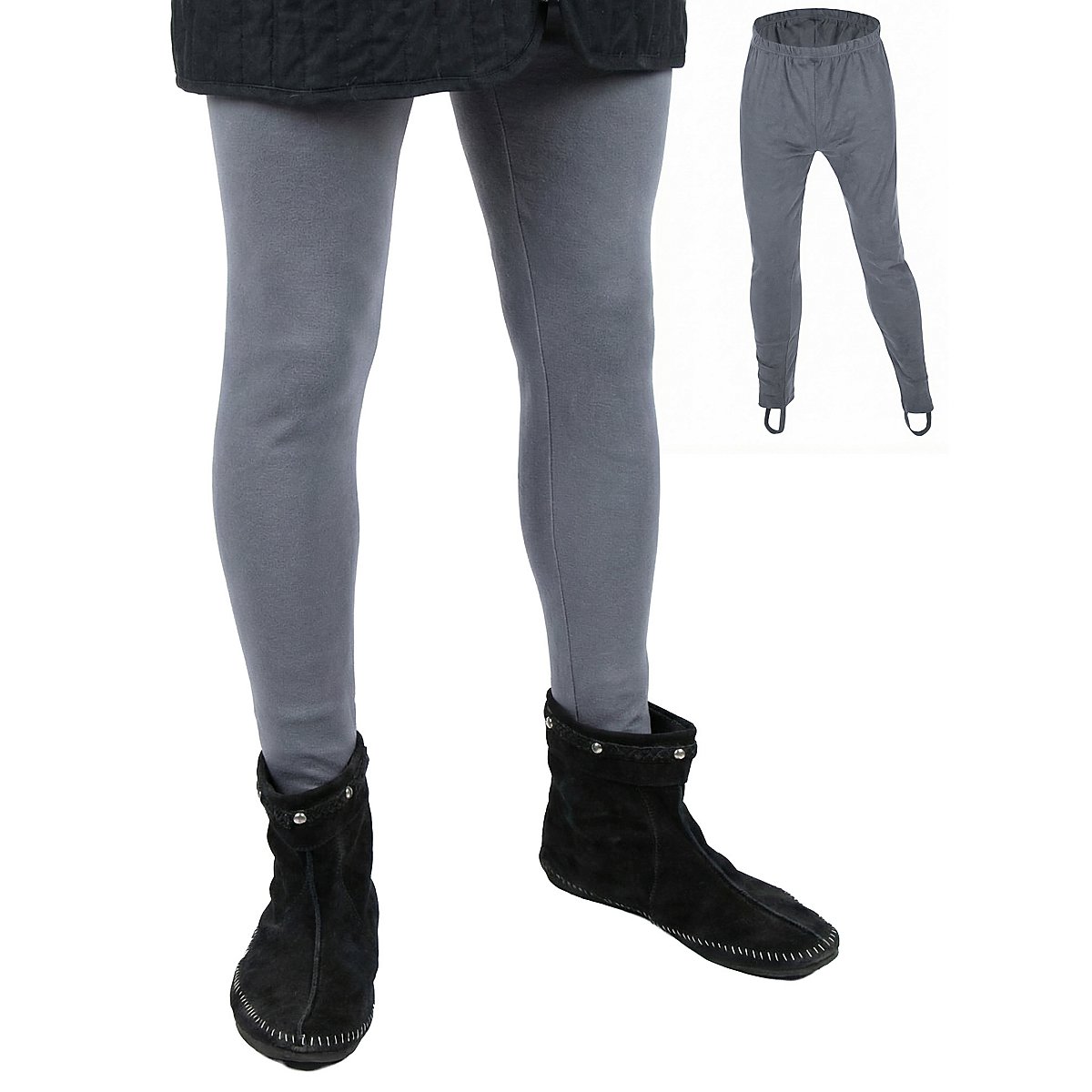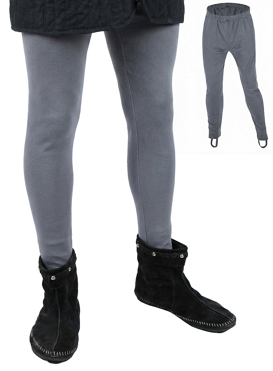 Le pantalon date du début du XVème siècle, quand il ressemblait plutôt à des collants. siècle. Avant, on portait surtout des guêtres, même si des bas ou des pantalons avait déjà été cousus longtemps auparavant. Notre pantalon médiéval gris est fabriqué en pur coton élastiqué, ce qui le rend doux et agréable à porter. Un ruban élastique à la taille assure le maintien parfait du pantalon médiéval, et les ourlets des jambes sont munis aussi de bandes qui remplacent les grands pieds des collants et empêchent le pantalon de remonter. En tout et pour tout, un vêtement très confortable !