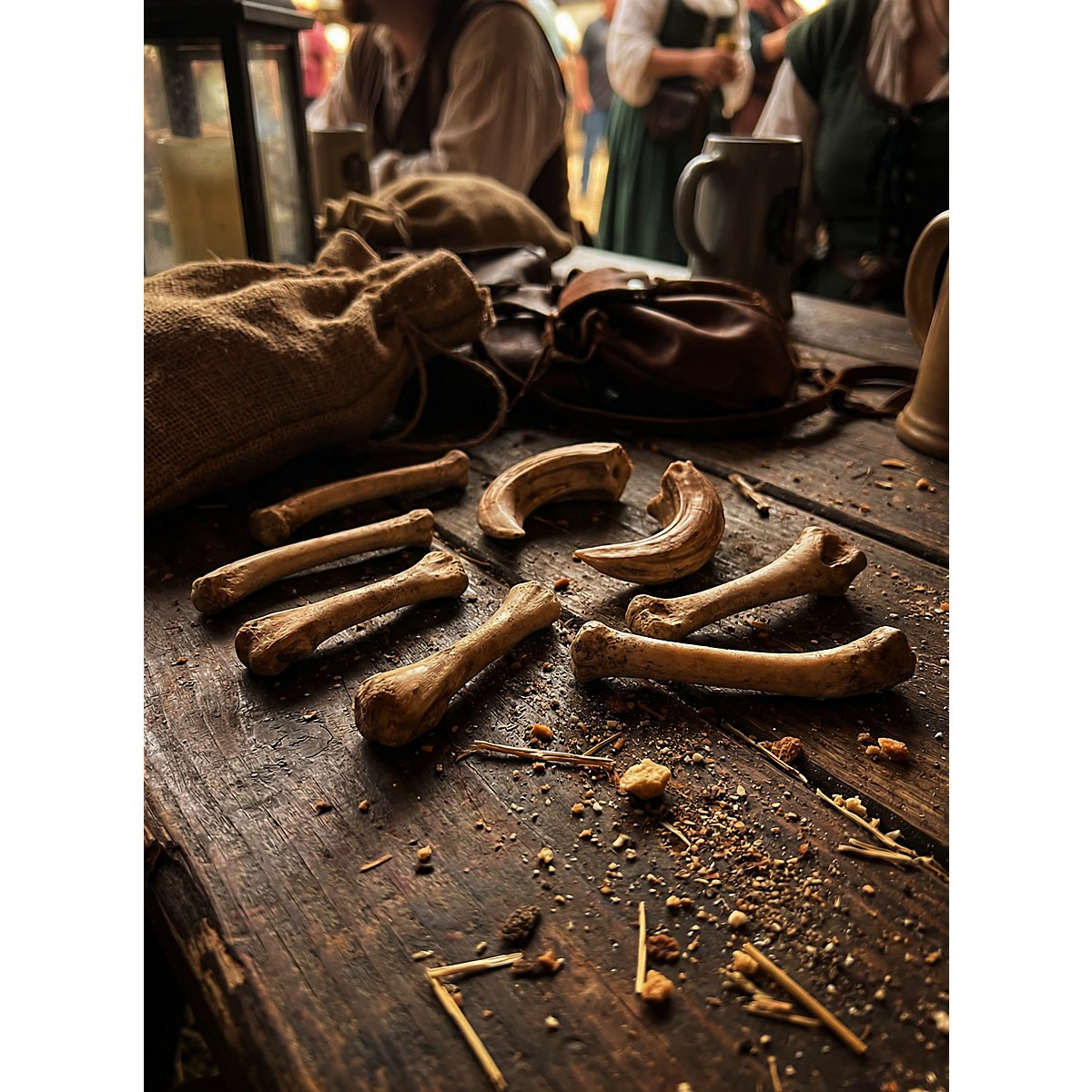 Les os ont été moulés à partir d'os de poulet et les dents d'animaux à partir d'os de sanglier. Ils sont peints à la main, ce qui leur donne un aspect réaliste.