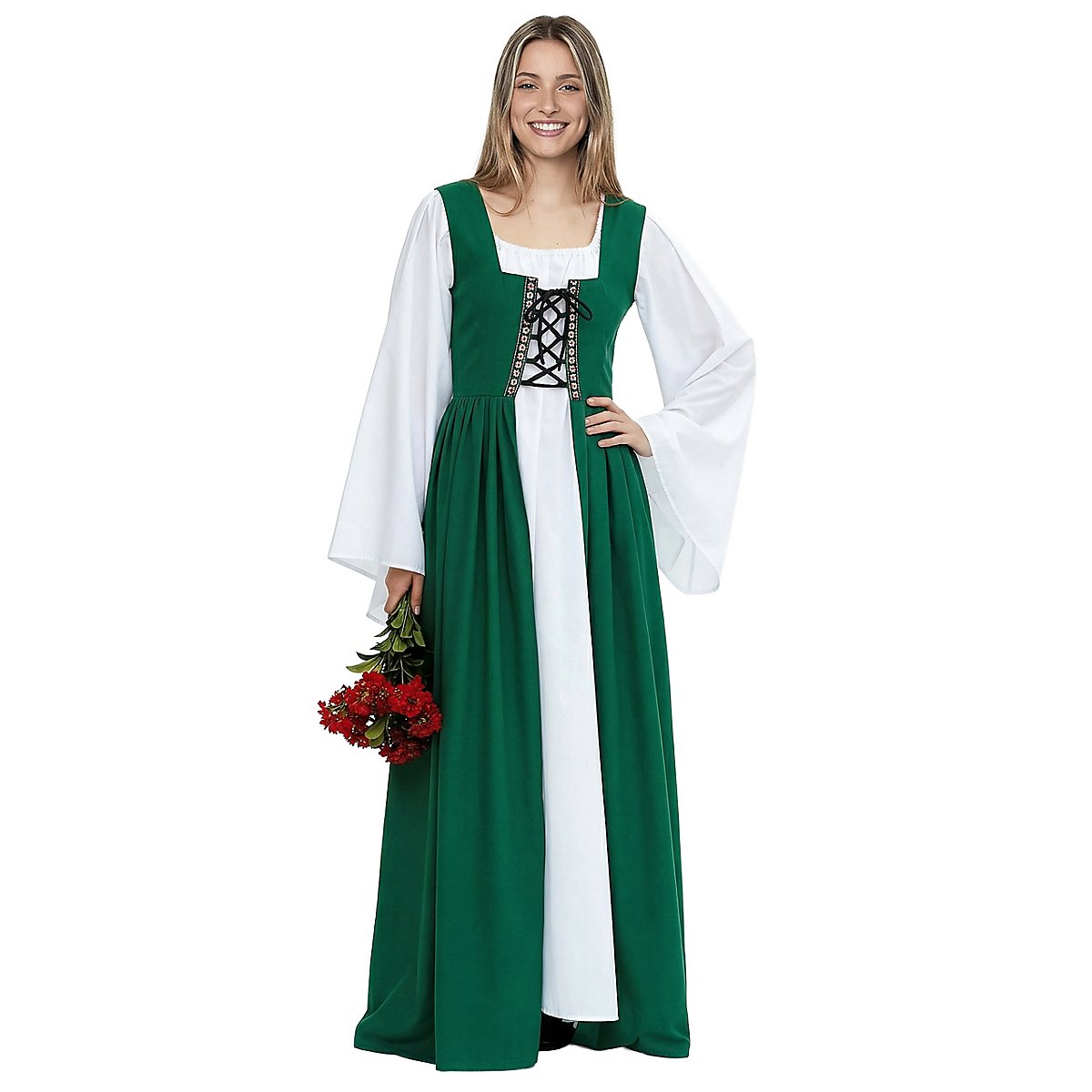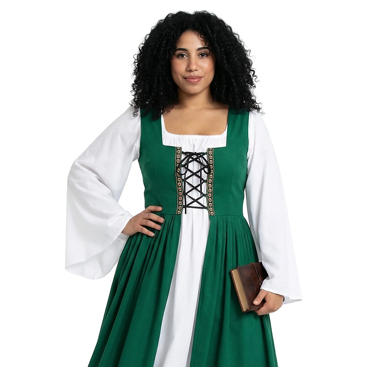 Ce surcot de style XVIème siècle qui brille de mille feux est indispensable dans le garde-robe d'une servante. La robe ouverte, sans manches a un bustier lacé avec des bordures décoratives et des baleines pour assurer un laçage extra serré. Elle s'associe merveilleusement à un grand nombre de chemisiers, de fonds de robes et de jupons. Vous pouvez donc la porter aussi bien en hiver qu'en été. Disponible en rouge, vert et bleu.
