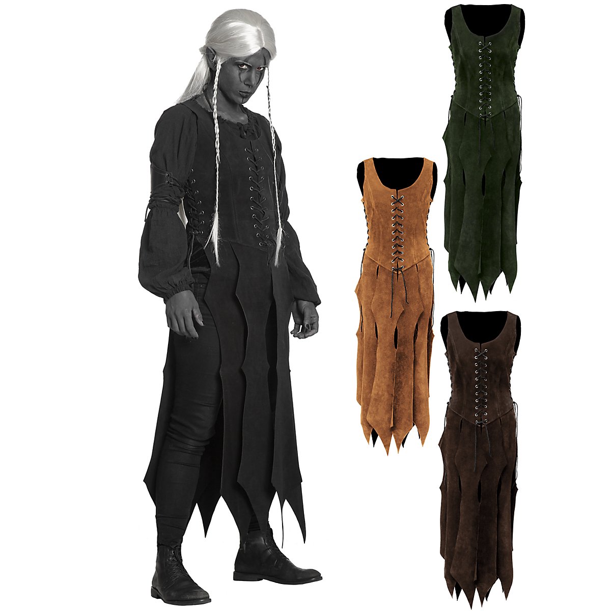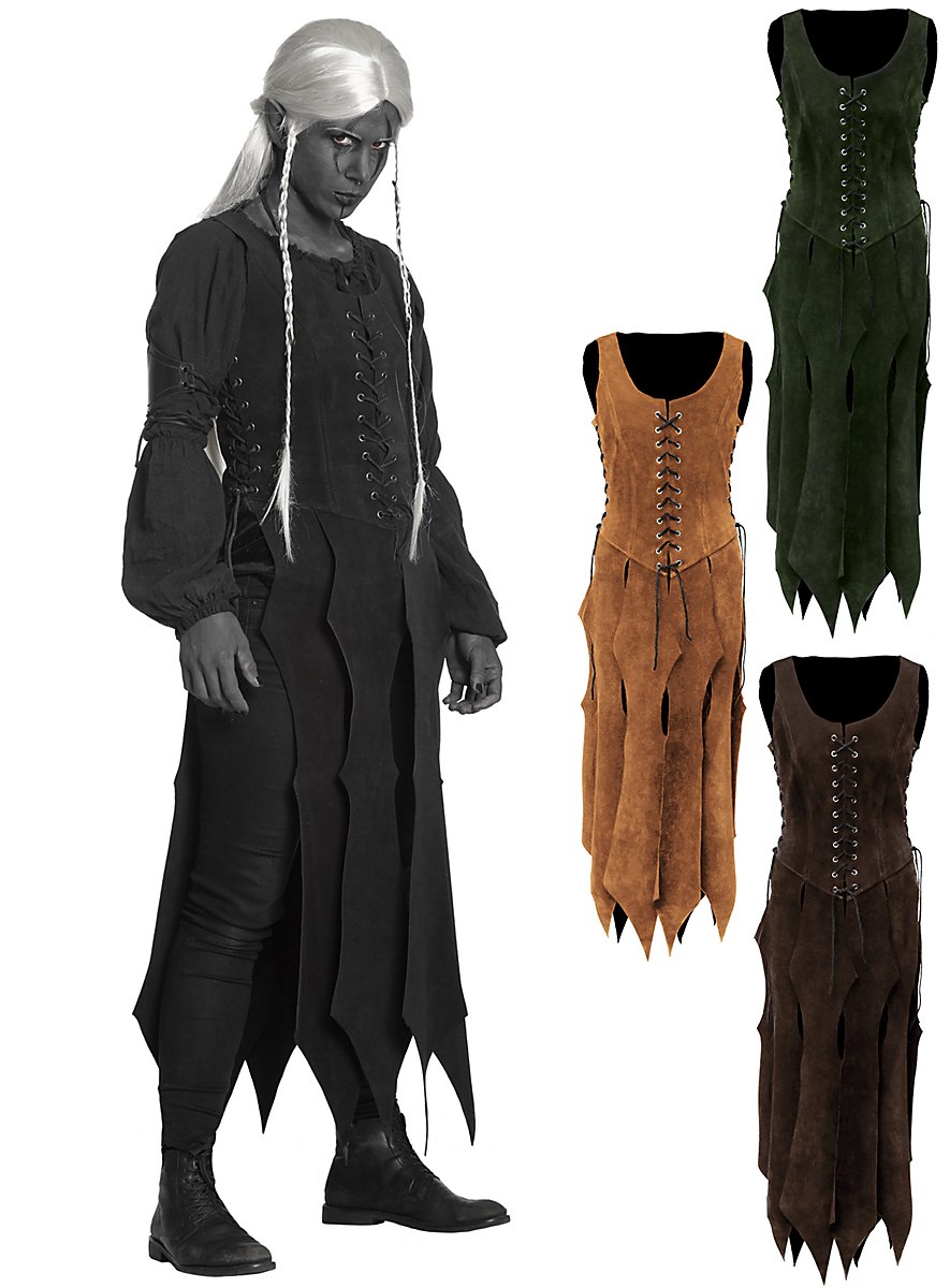 Notre corset avec jupe - bandit de grand chemin n'est pas seulement impressionnant pour les elfes noirs. Fabriqué à la main en cuir suédé tanné végétal et résistant, c'est une véritable parure pour les Amazones, les aventurières et autres femmes courageuses. Il est lacé sur le côté et à l'avant, ce qui lui permet de s'asseoir confortablement et de s'adapter parfaitement au corps. Les trous à travers lesquels les trois lanières de cuir de 1,5 m de long sont tirées sont protégés de la déchirure par des œillets métalliques. Sous le laçage susmentionné, le vêtement de type robe est coupé en lambeaux longs, s'élargissant vers le bas, multi-taillés et effilés, ce qui donne à celle qui le porte une apparence particulièrement combative. Cependant, comme cette forme de coupe est également quelque peu révélatrice, un sous-vêtement est fortement recommandé.