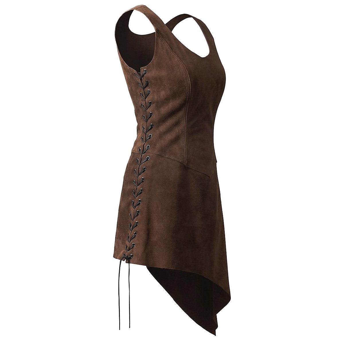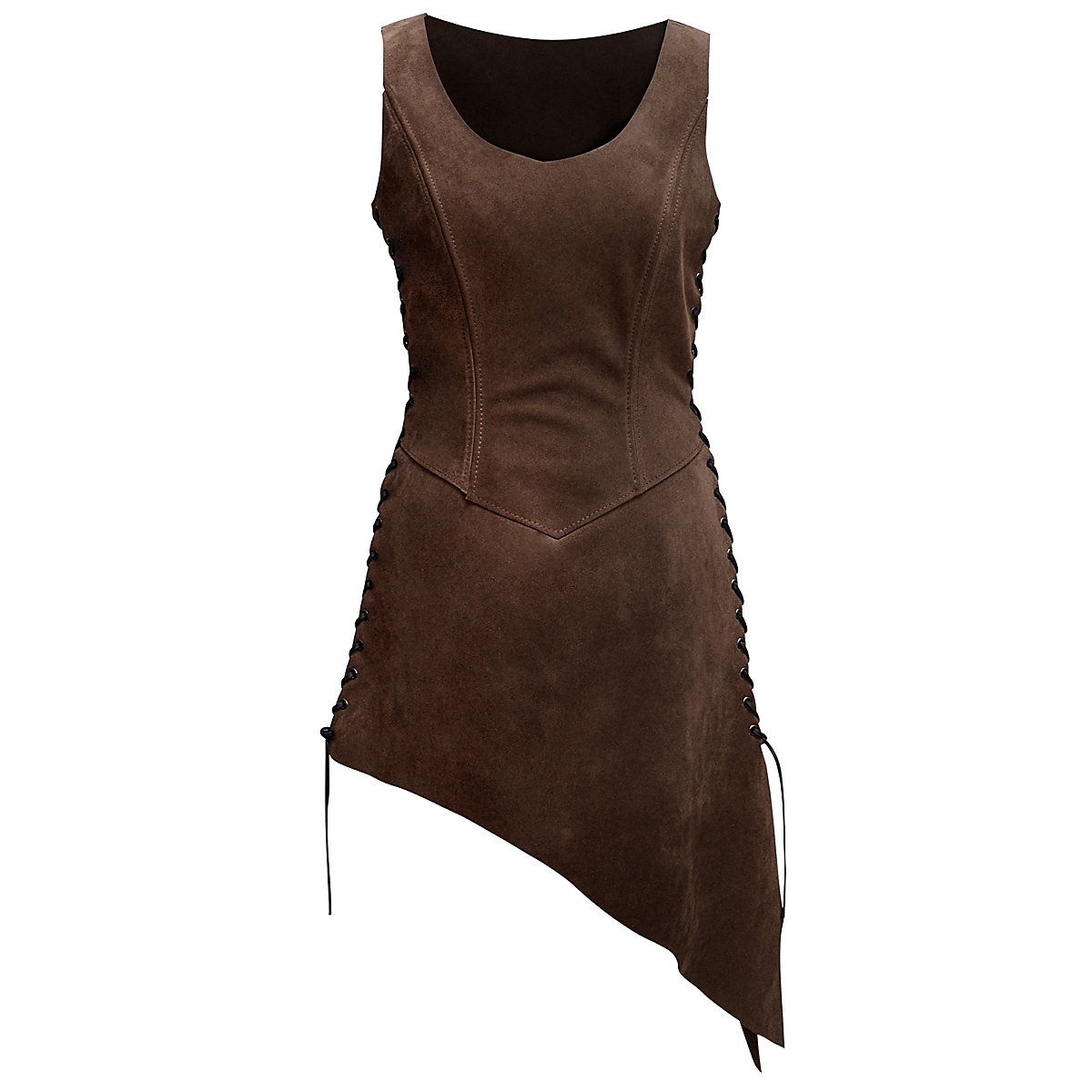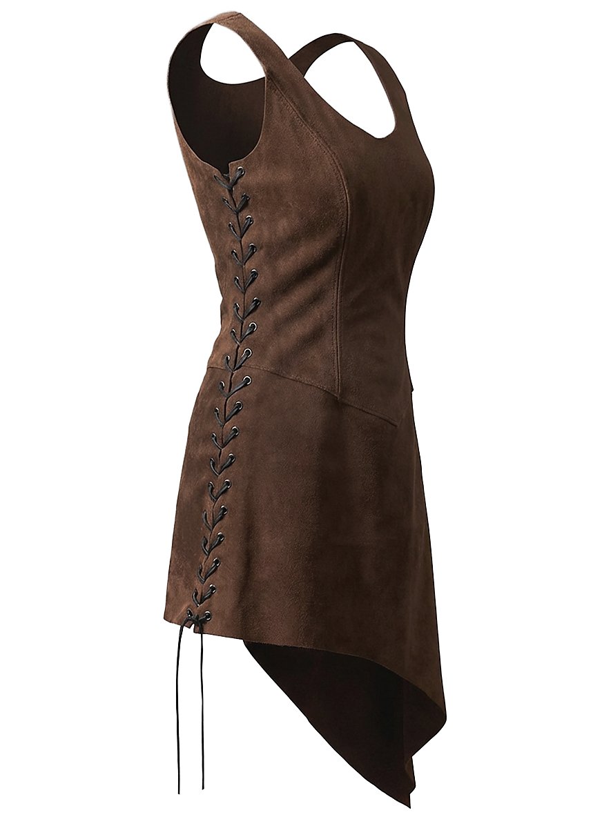 Serveuse ou amazone, aubergiste ou guerrière : cette tunique en cuir velours est très polyvalente et peut servir d'armure ainsi que de vêtement. La coupe impertinente et asymétrique ainsi que les laçages latéraux permettent à celle qui la porte de montrer un peu plus de jambe d'un côté et un peu de peau des deux côtés. Cela détourne les adversaires masculins de leur action sur le champs de bataille et génère également plus d'argent à la taverne, ce qui est grandiose. C'est pourquoi il existe une tunique de serveuse en daim, fabriquée à la main en cuir velours indéchirable, et garnie sur les côtés de liens avec œillets robustes. Au final, ils permettent un ajustement individuel à chaque silhouette et garantissent un maintien sûr et confortable du vêtement excitant. La tunique de serveuse en cuir velours est disponible en noir et aussi en marron foncé, marron clair et en vert.