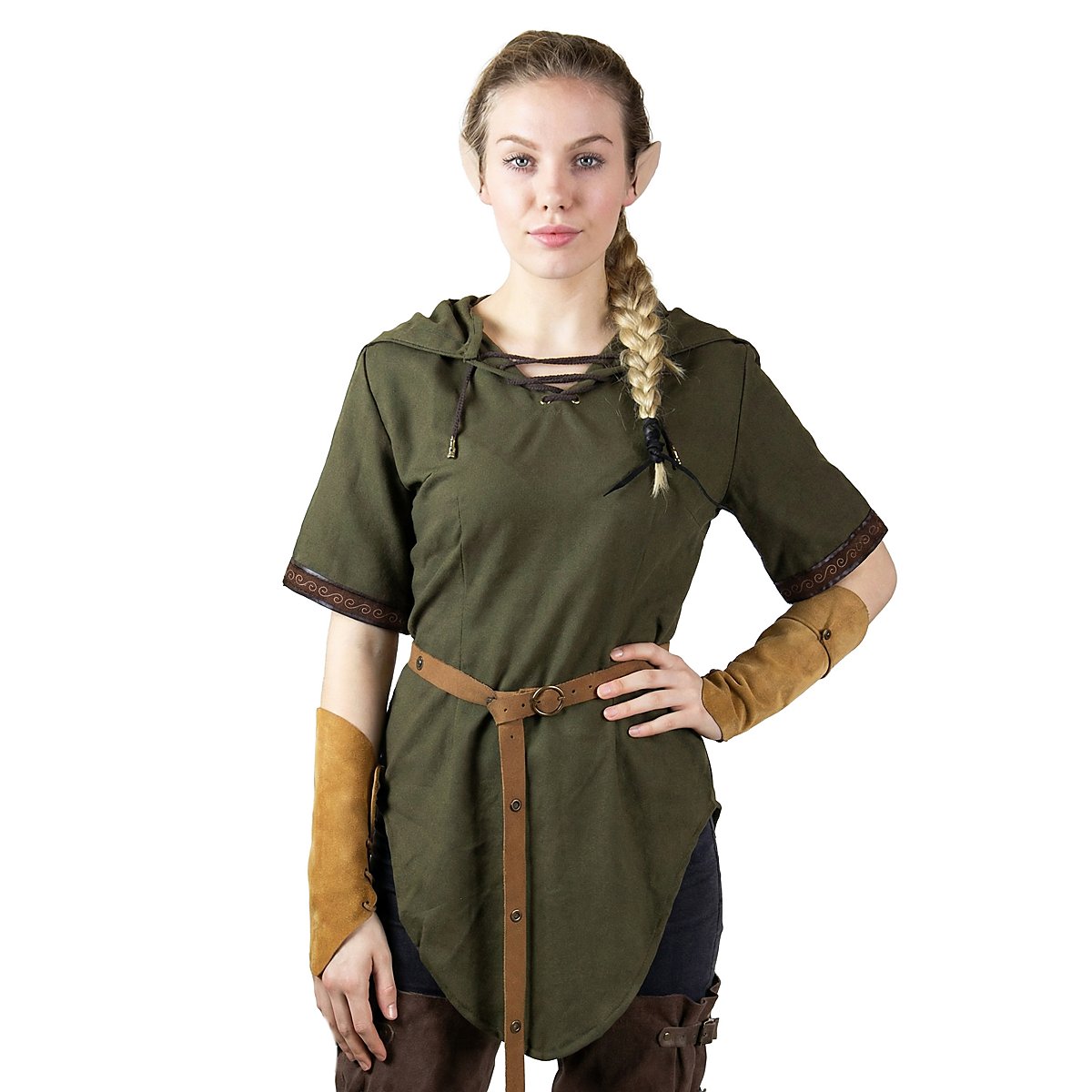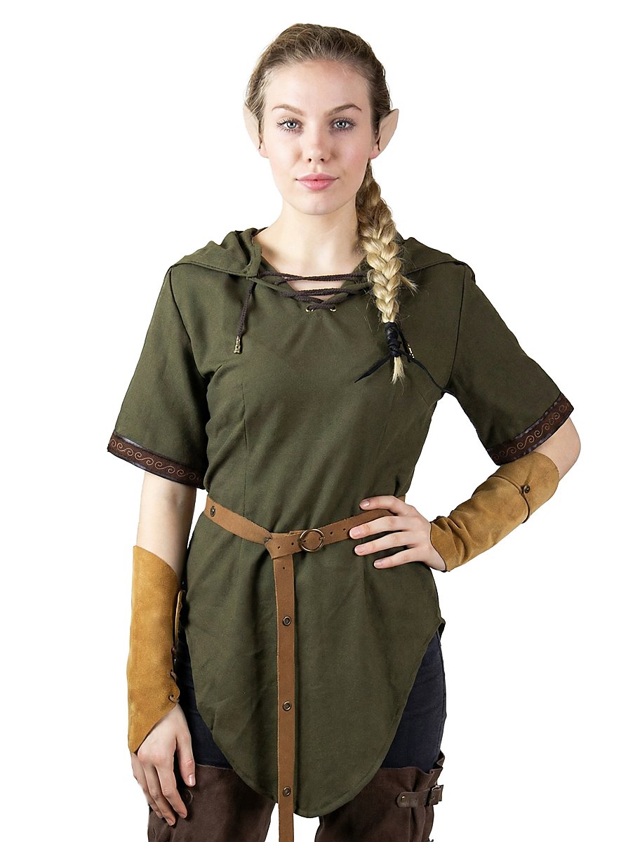 Cette tunique de ranger est très confortable et peut être combinée avec de nombreux autres vêtements. Elle est fabriquée en sergé de haute qualité et possède une large capuche et des manches courtes, qui sont décorées de garnitures en cuir et en daim de différentes couleurs. Elle est parfaite comme pièce de base d'un vêtement elfique.