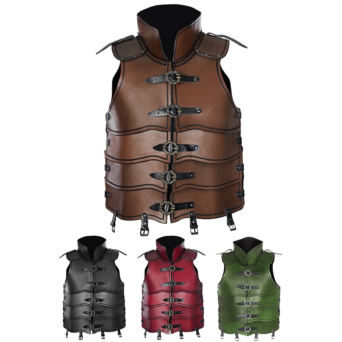 Le piastre mobili sull'addome, disposte come le armature romane, garantiscono libertà di movimento e comfort, consentendo all'esploratore di muoversi silenziosamente e senza essere scoperto nel sottobosco! Grazie alle cinghie e alle fibbie regolabili sul davanti e sui lati, l'armatura in pelle da esploratore offre un'ampia gamma di regolazioni, che la rendono facilmente adattabile a indumenti intimi e forme del corpo diverse. Il colletto cucito completa perfettamente il look e offre una protezione contro i colpi involontari alla zona del collo.