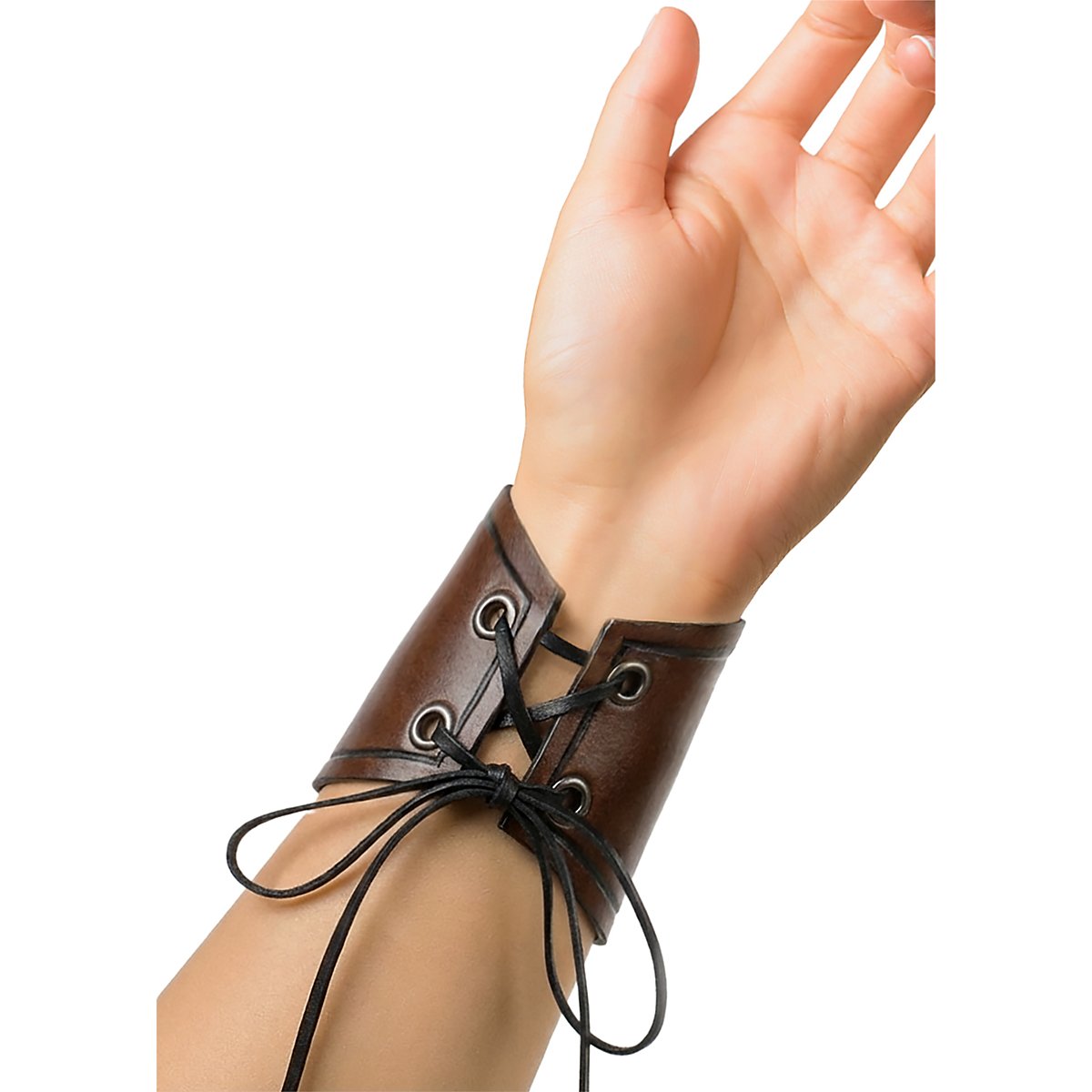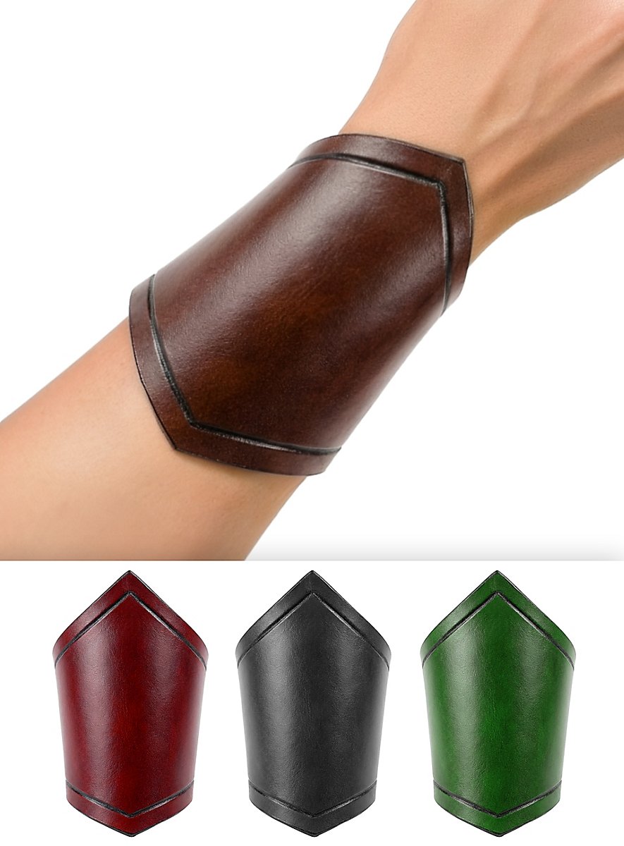 "Oh... che carino". Niente affatto! Il nostro bracciale in pelle - avventuriero non ha tanto lo scopo di proteggere quanto quello di dare un bell'aspetto a chi lo indossa, grazie alle sue dimensioni compatte, ma non è destinato esclusivamente alle donne. È ugualmente adatto a uomini e donne come accessorio complementare all'armatura o all'abbigliamento da GRV. È realizzato in pelle da armatura conciata al vegetale, con uno spessore di 3 - 4 mm ed è decorato con scanalature. Si fissa all'avambraccio con una cinghia di cuoio lunga circa 50 cm che viene fatta passare attraverso i quattro occhielli metallici e può essere regolata individualmente per adattarsi alla circonferenza del braccio.
