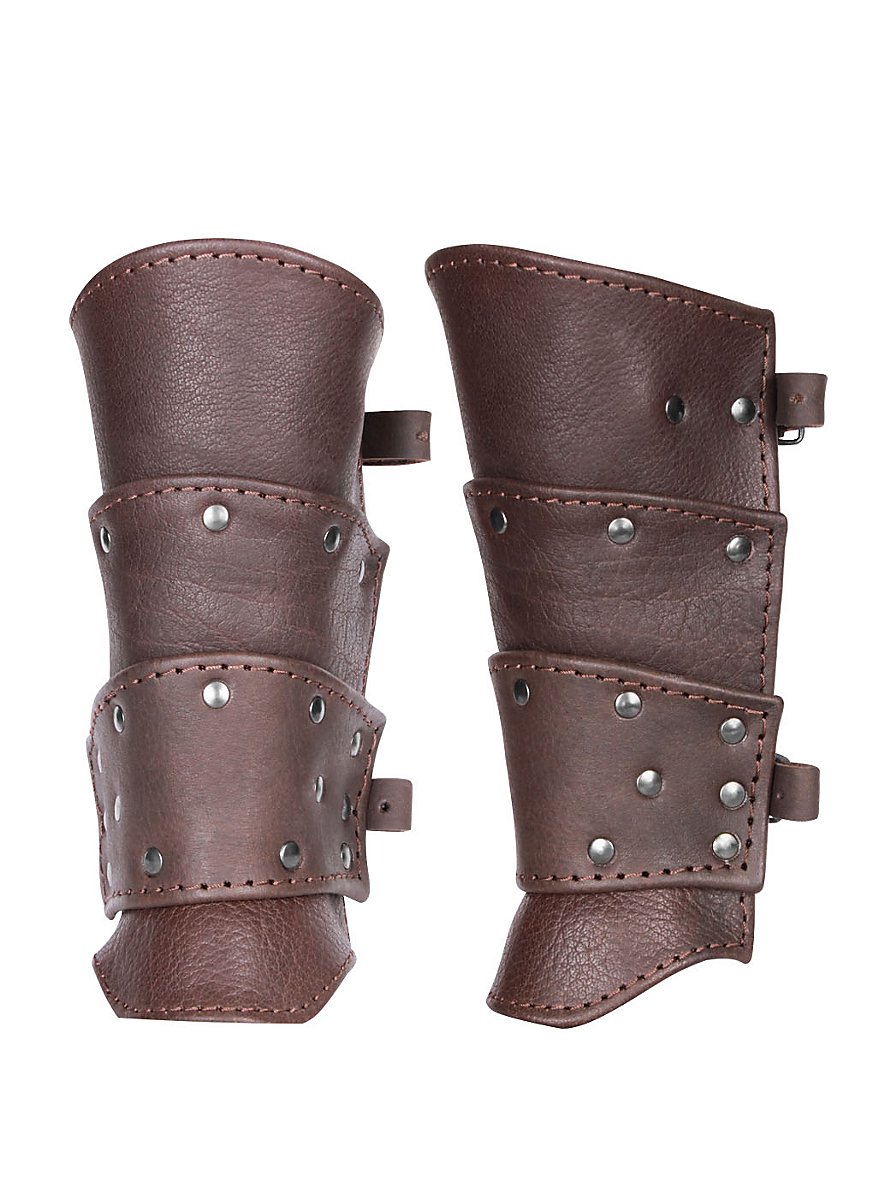 Se siete alla ricerca di bretelle eccellenti, non cercate oltre! I nostri bracciali da combattimento marroni sono un'ottima aggiunta a una varietà di abiti medievali e fantasy. Sono costituiti da pezzi di cuoio rivettati insieme e spessi circa 3 - 4 mm. Questo tipo di costruzione non solo offre una buona protezione, ma è anche molto comoda da indossare. A ciò contribuiscono anche le due fibbie a rullo e le cinghie di cuoio, che possono essere regolate individualmente e grazie alle quali i bracers possono essere indossati comodamente.