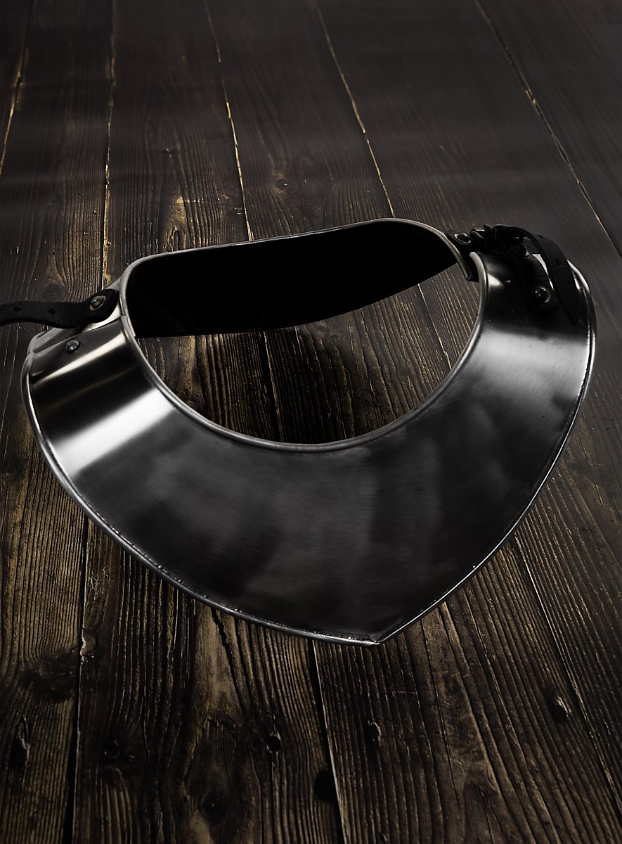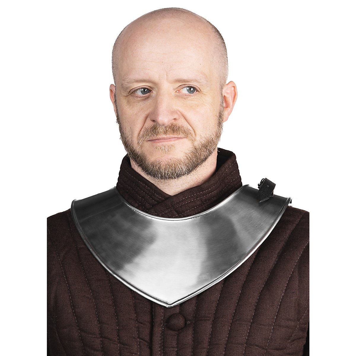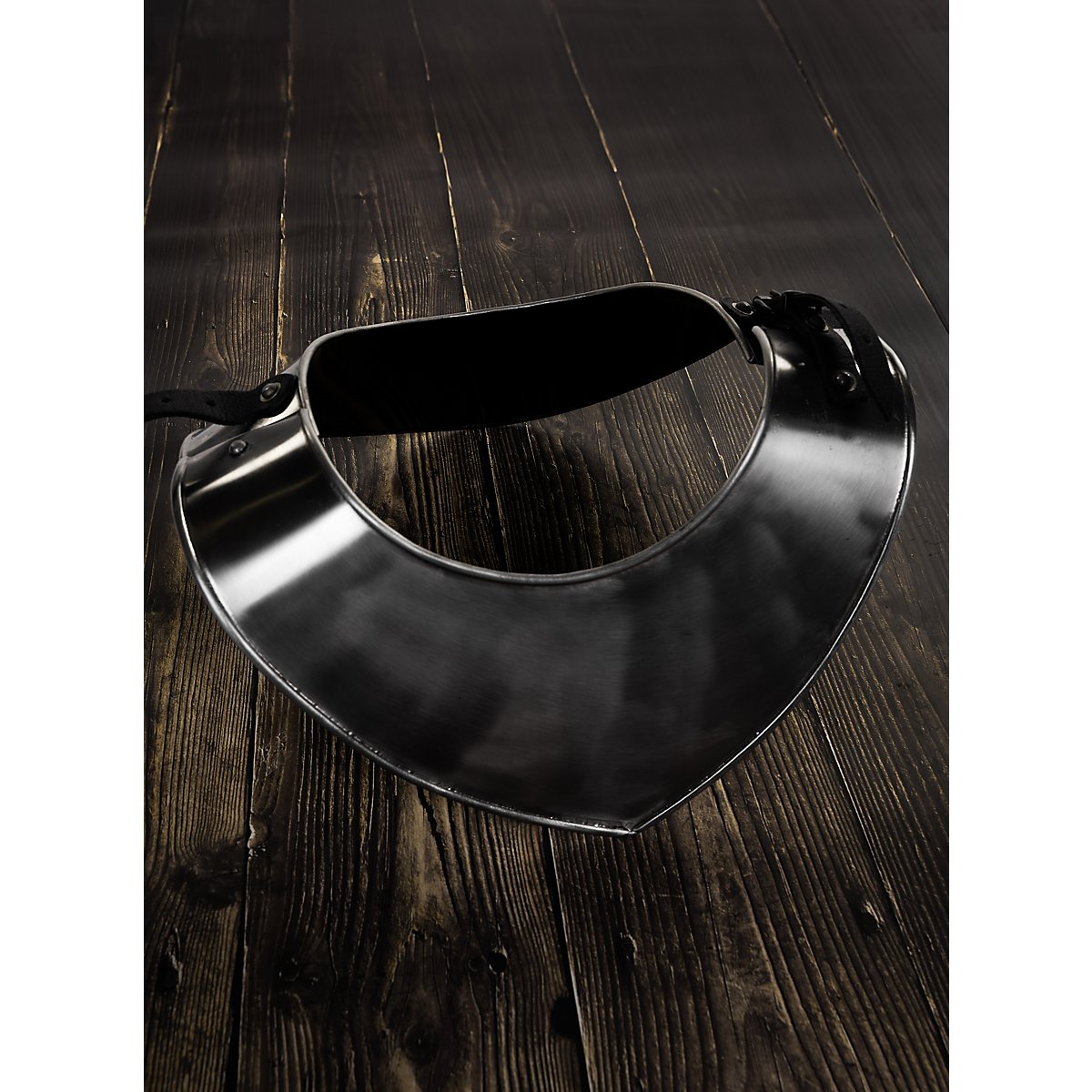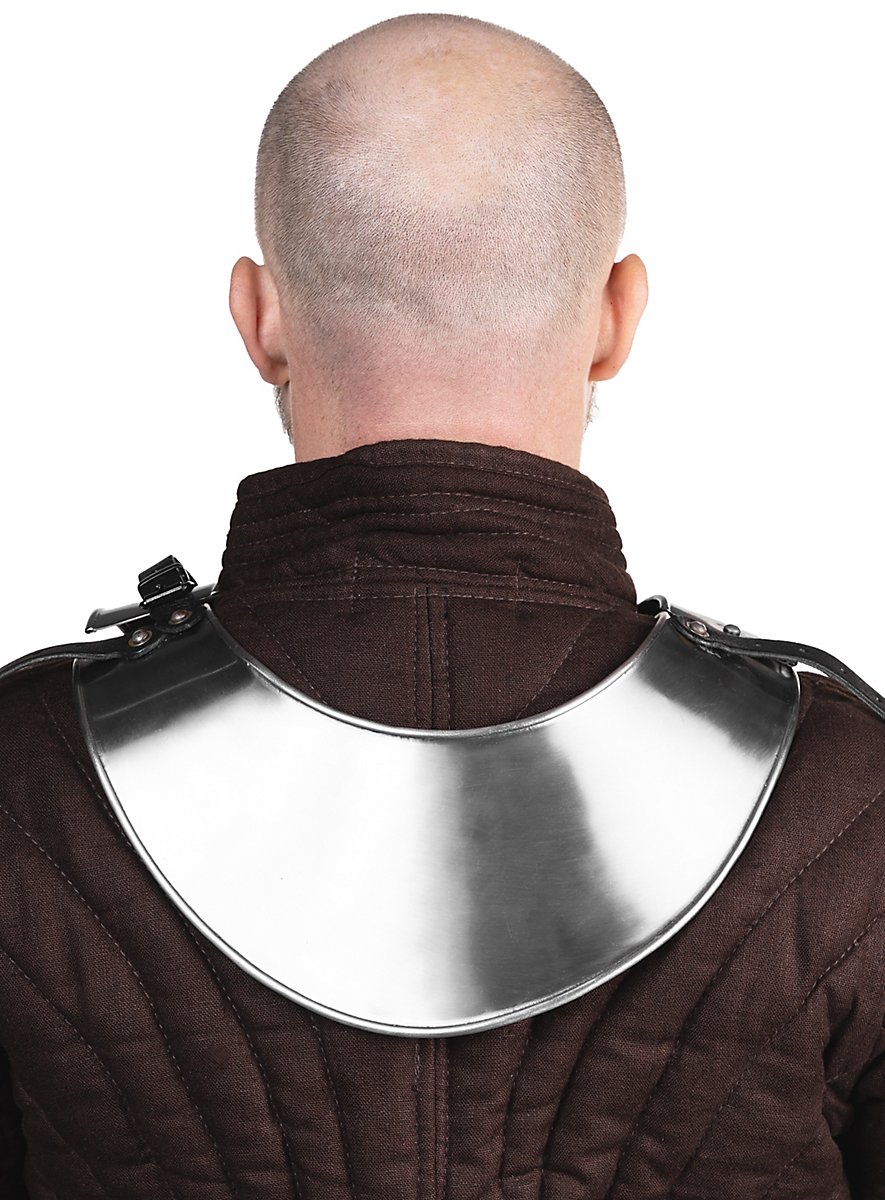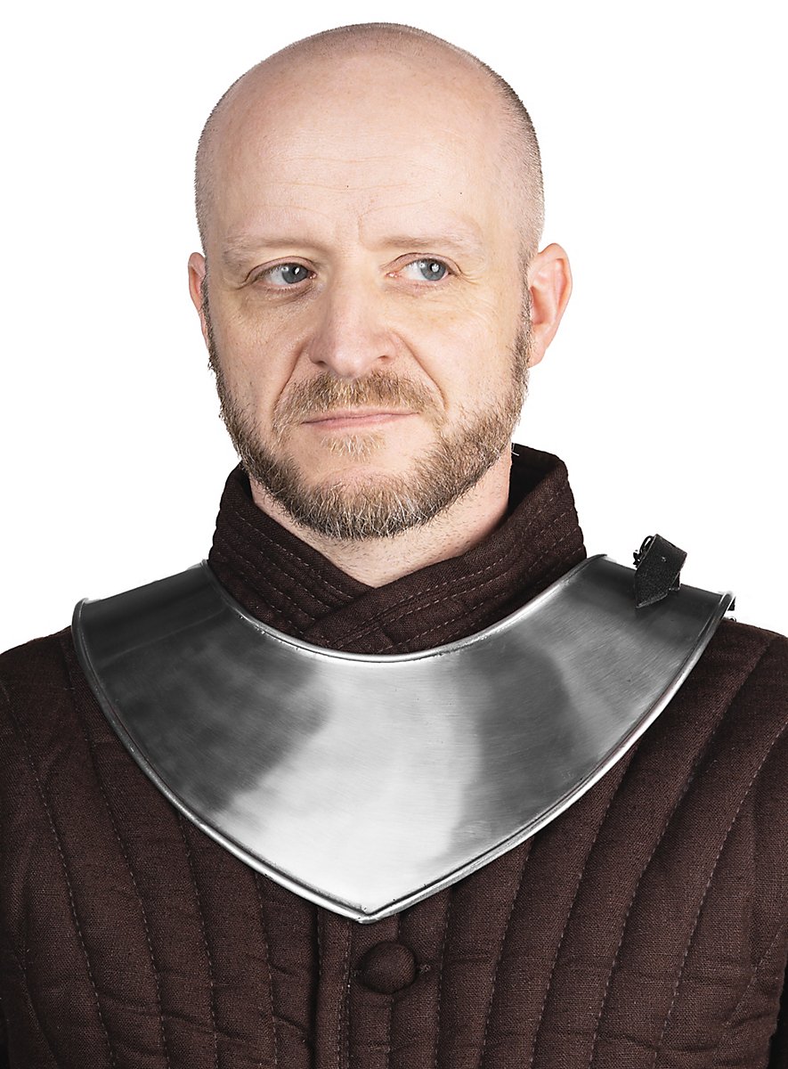 Questo collare medievale in metallo è una buona protezione contro i colpi di armi imbottite in Larp e si usa per fissare le spalle in metallo o le spalle in pelle Andracor. Si adatta bene a personaggi bellicosi e soldateschi. Il collare può essere indossato unisex ed è stato progettato per essere indossato sotto un doppio mantello foderato, come un gambeson o una corazza. Il collare è fissato per mezzo di una cerniera con la quale il collare viene messo intorno al collo e fissato dall'altro lato con una cinghia di cuoio.