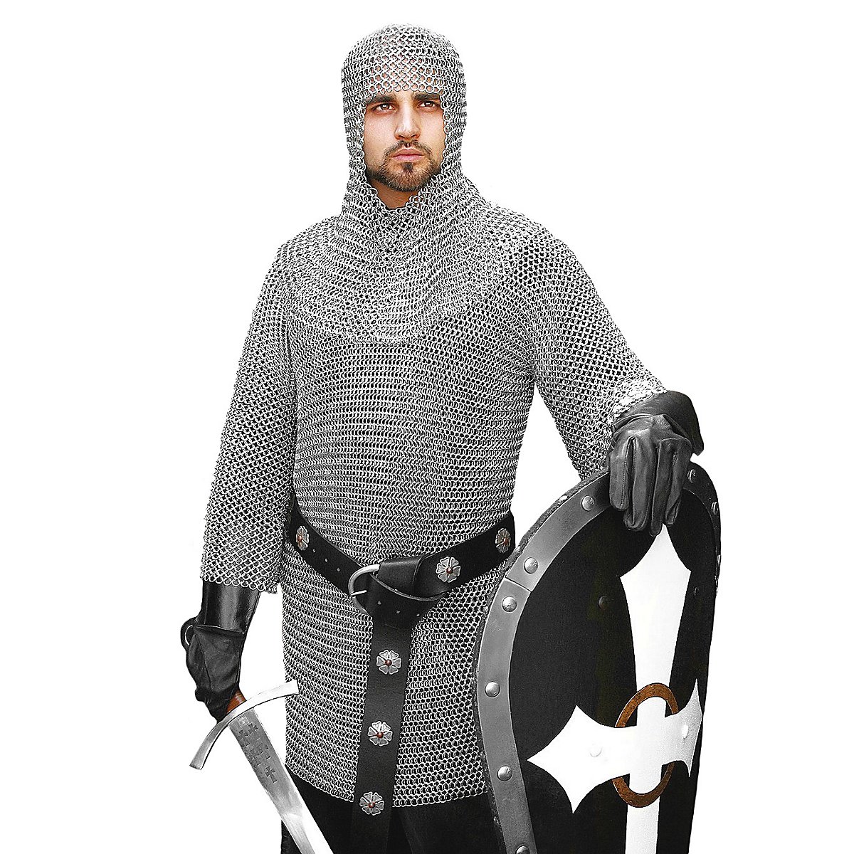 La nostra armatura da guerriero con cotta di maglia è realizzata con anelli d'acciaio resistenti. Gli anelli sono realizzati con filo d'acciaio spesso 1,7 mm, hanno un diametro esterno di 1,25 cm e sono intrecciati secondo il consueto schema europeo 4 in 1. La scollatura è rettangolare e il capo è imbottito. Lo scollo è rettangolare e le maniche sono lunghe circa 62 cm (misurate dalle spalle). La camicia di maglia misura circa 90 cm dalle spalle all'orlo inferiore. La circonferenza massima nella zona del petto e della pancia è di circa 130 cm. Come di consueto per le camicie di maglia, la forma si adatta perfettamente agli indumenti intimi e al busto, anche in caso di corporature molto diverse. Il peso totale è di 10,5 kg.