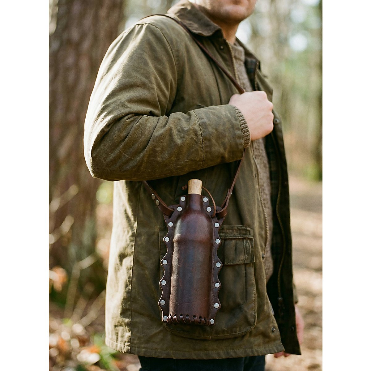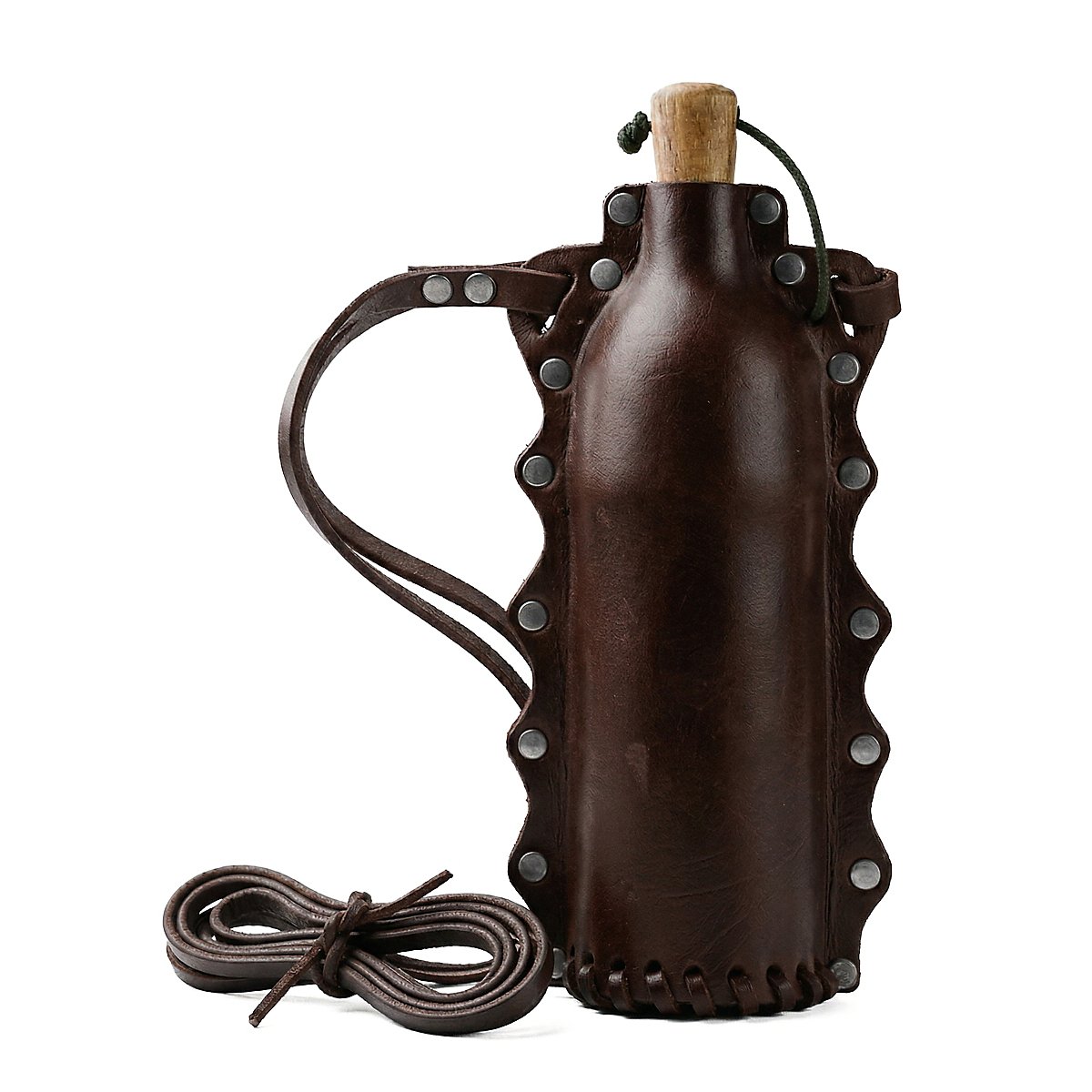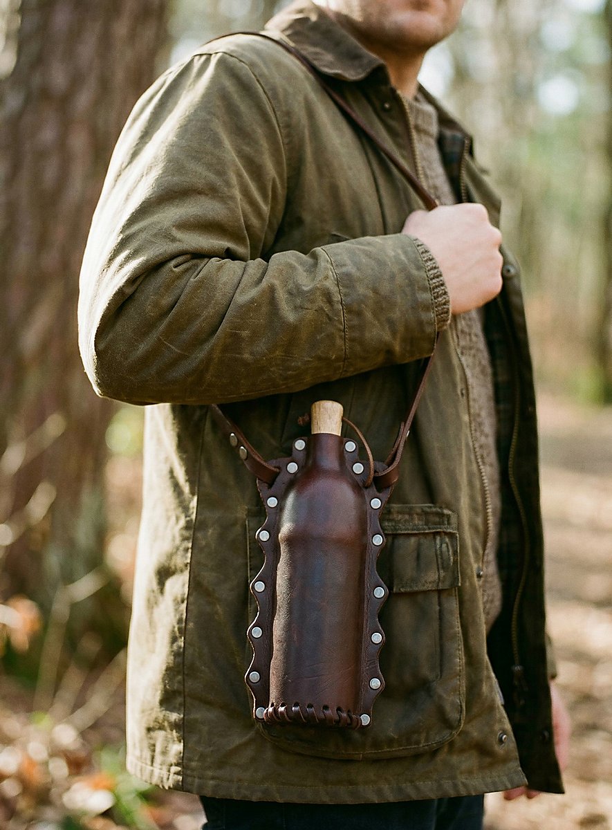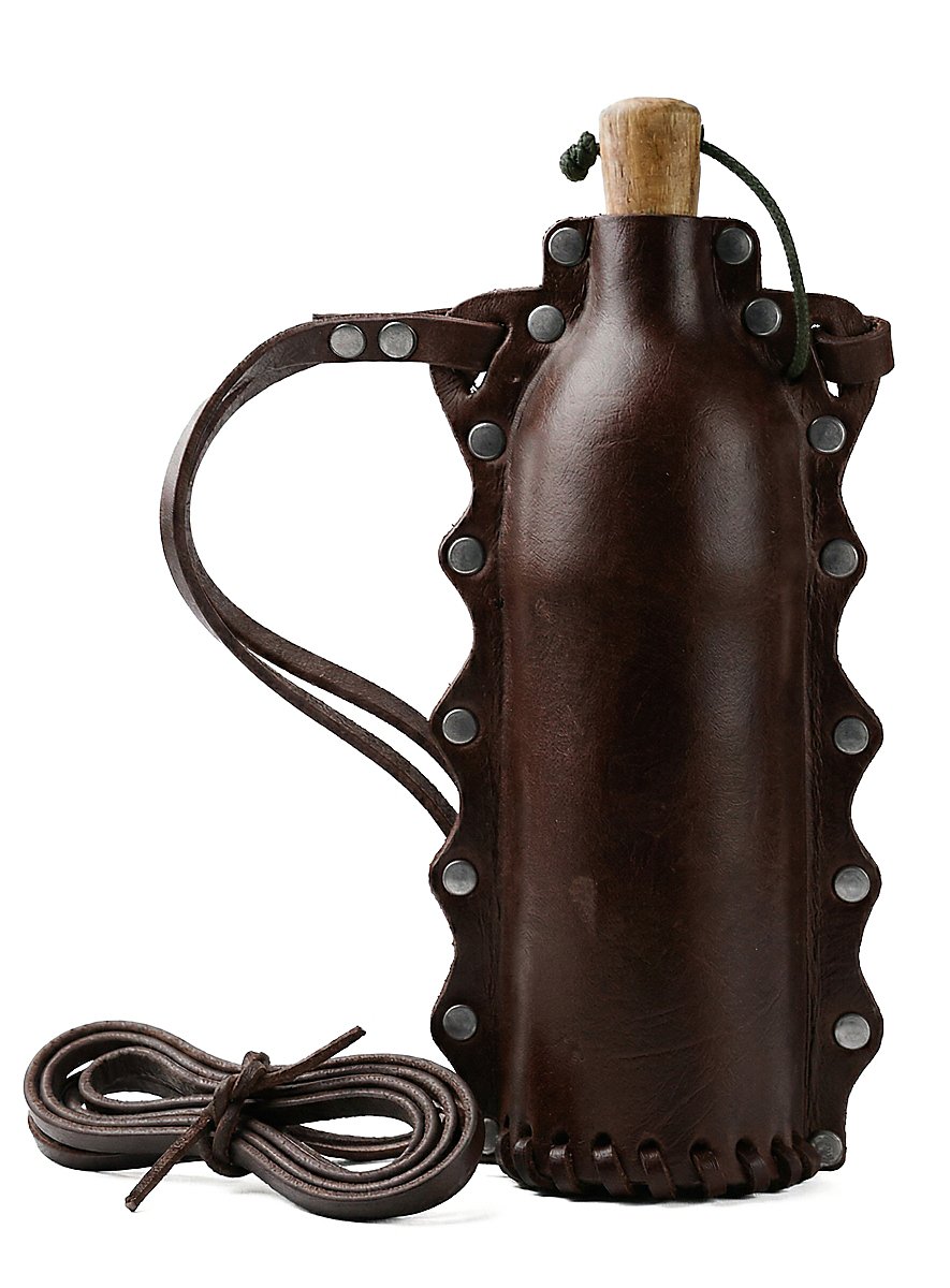 Se avete sete durante le vostre avventure, prendete questo meraviglioso beverino Doran! È realizzato in vera pelle ricoperta da un inserto in PET alimentare e ha una capacità di circa 500 ml. Un tappo di legno è fissato alla bottiglia con una cinghia di cuoio e una cinghia di cuoio di dimensioni generose serve come dispositivo di trasporto. Un accessorio meraviglioso che sta bene a tutti.