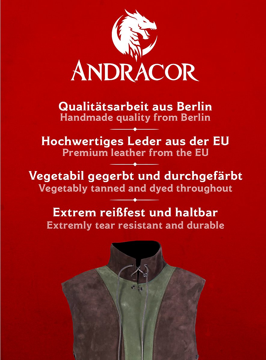 Tutti i prodotti Andracor sono progettati e realizzati a mano a Berlino dal 1999. La selezione rigorosa di materiali di alta qualità e i dipendenti esperti garantiscono un livello di qualità costantemente elevato. In questo modo creiamo prodotti che amiamo indossare noi stessi e che sono più che adatti all'impegnativa vita quotidiana del LARP.