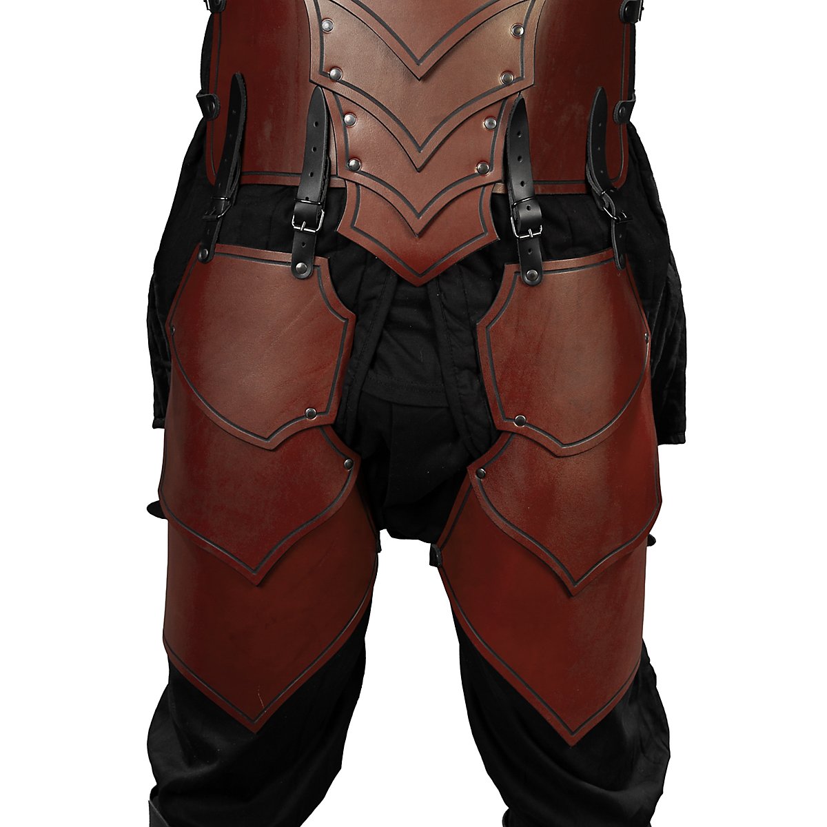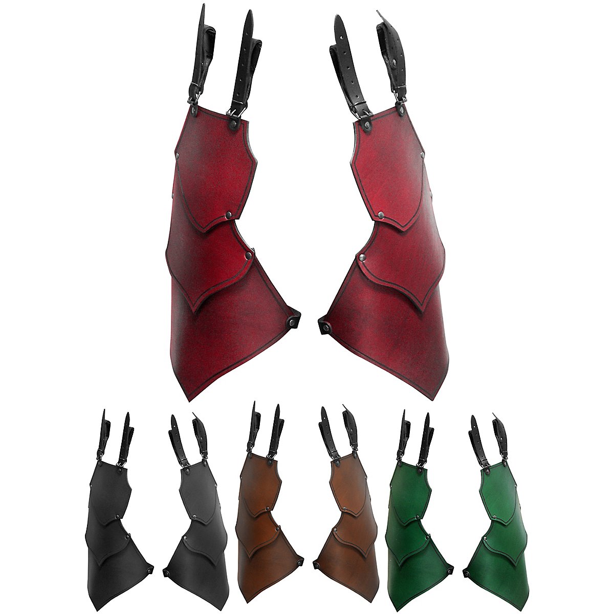 Con il loro design elegante ed entusiasmante, le nostre borse da gamba - cavalieri del drago sono la scelta giusta per molti personaggi del LARP. Sono conciate al vegetale, realizzate a mano con pelle da armatura spessa 3 - 4 mm e decorate con scanalature. Offrono un elevato grado di protezione e flessibilità grazie alla costruzione di parti in pelle parzialmente sovrapposte e rivettate. Si fissano all'armatura tramite le due cinghie poste sulla parte superiore. Se non avete un'armatura o se la vostra armatura non ha le fibbie per fissare le cinghie, scegliete semplicemente l'opzione di fissaggio alla cintura. Decidete semplicemente il design di cui avete bisogno o che si adatta meglio alla vostra armatura o al vostro abbigliamento. Una cinghia e una fibbia sul lato inferiore di ogni binario sono utilizzate per un fissaggio personalizzato e sicuro alla coscia.