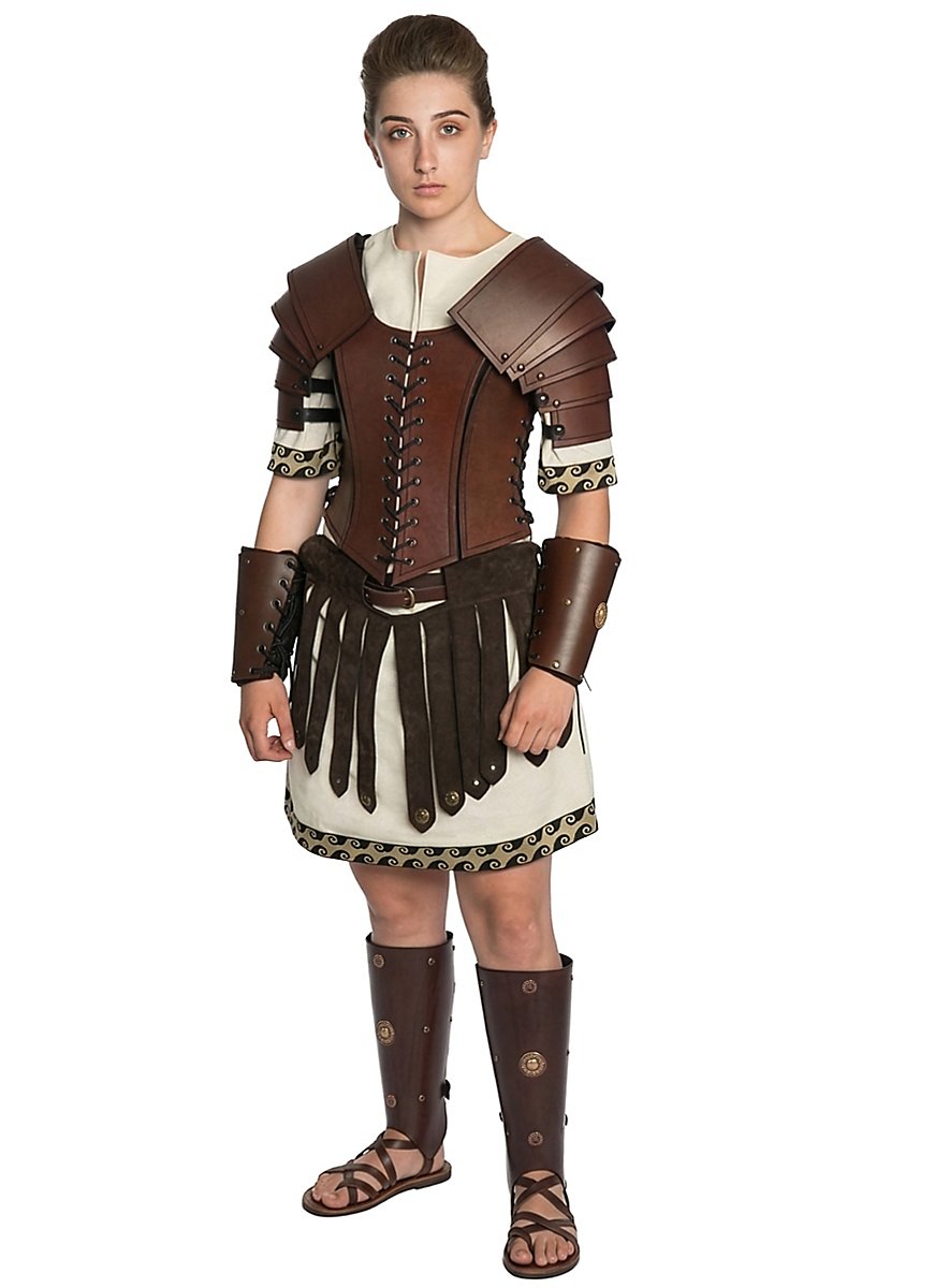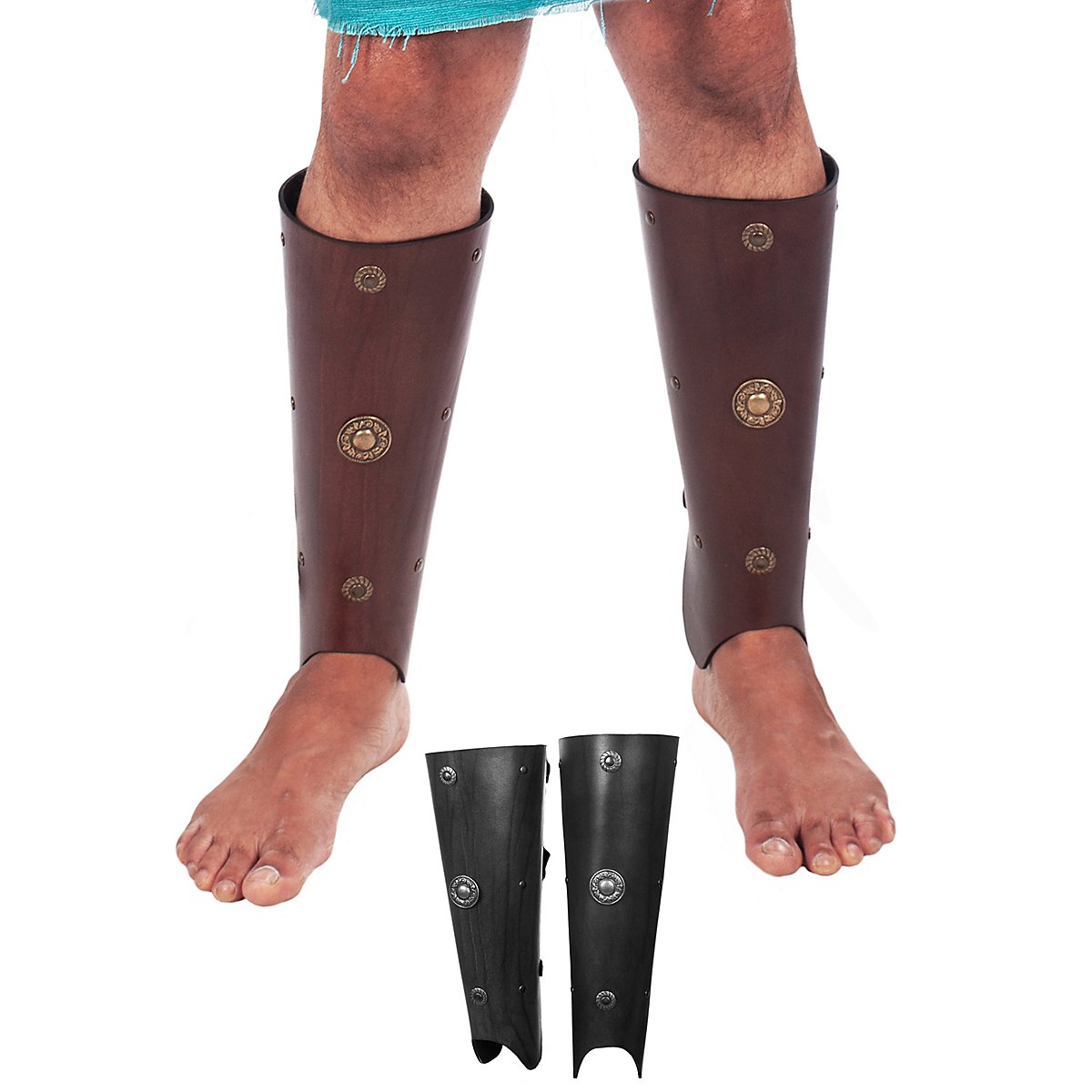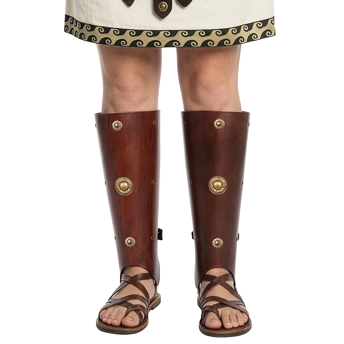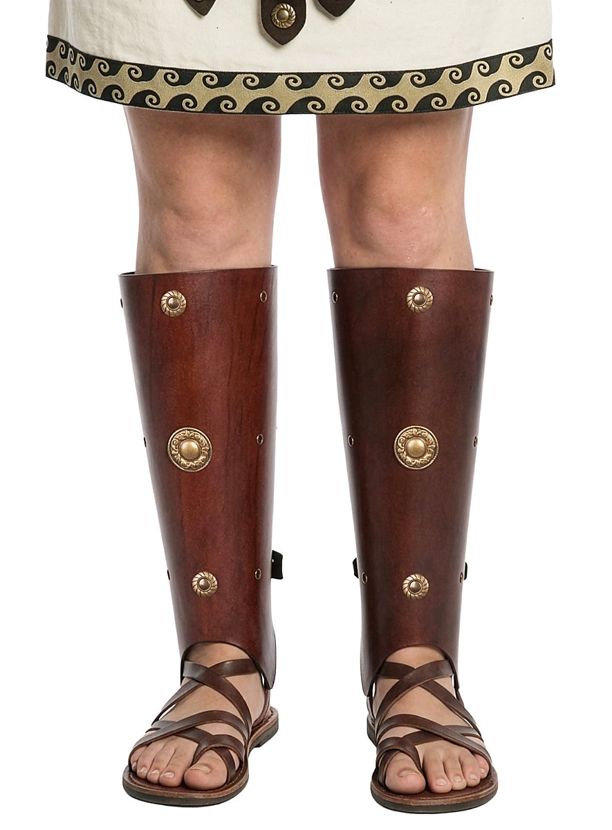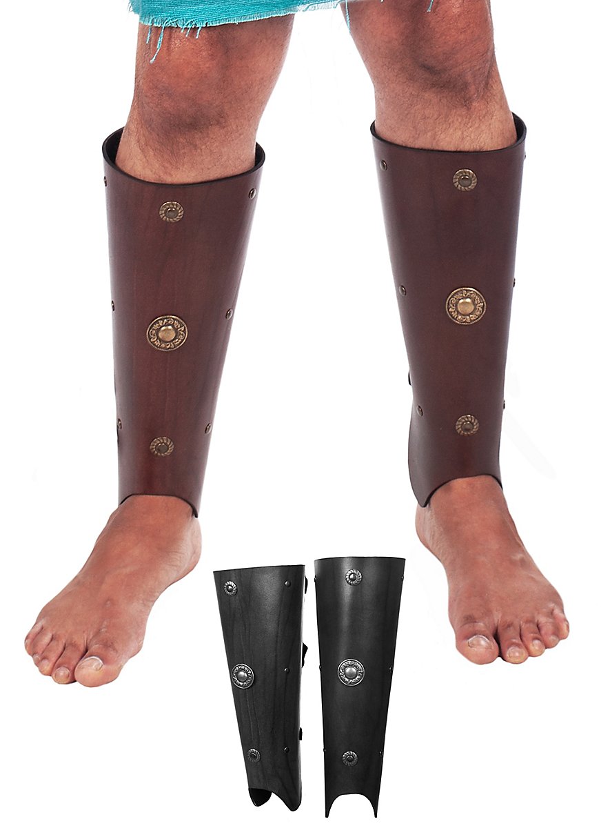 I greaves dal taglio semplice ricevono un significativo aggiornamento e un tocco romano grazie al rivetto decorativo centrale.