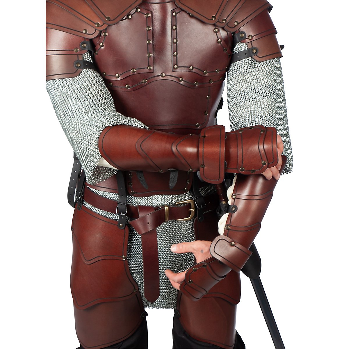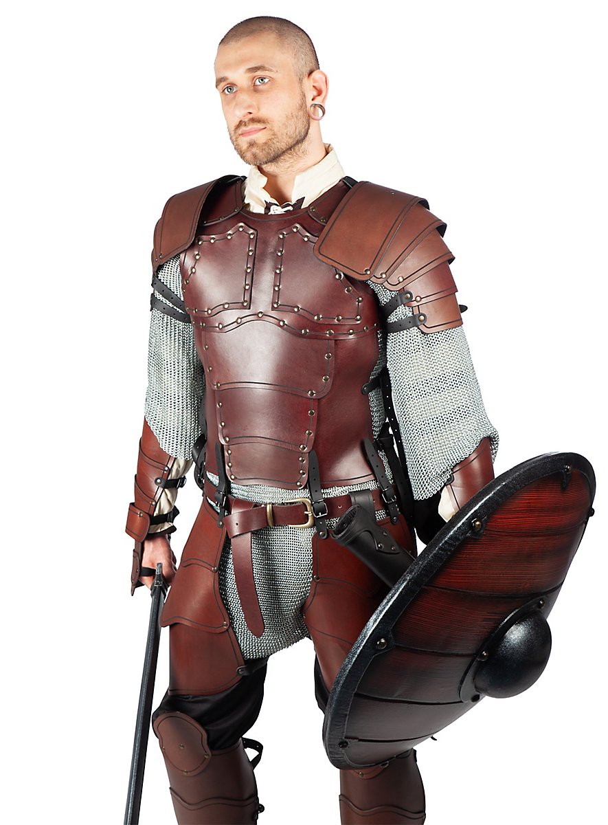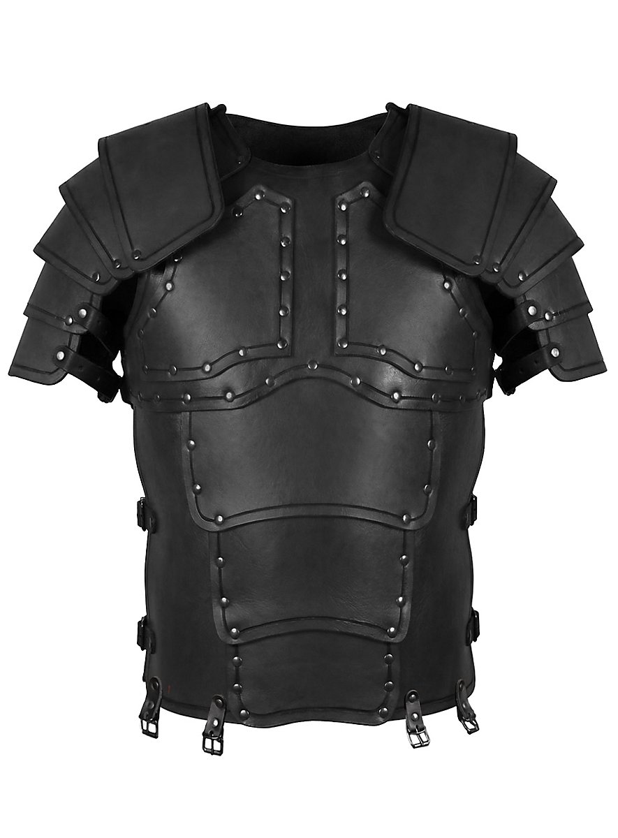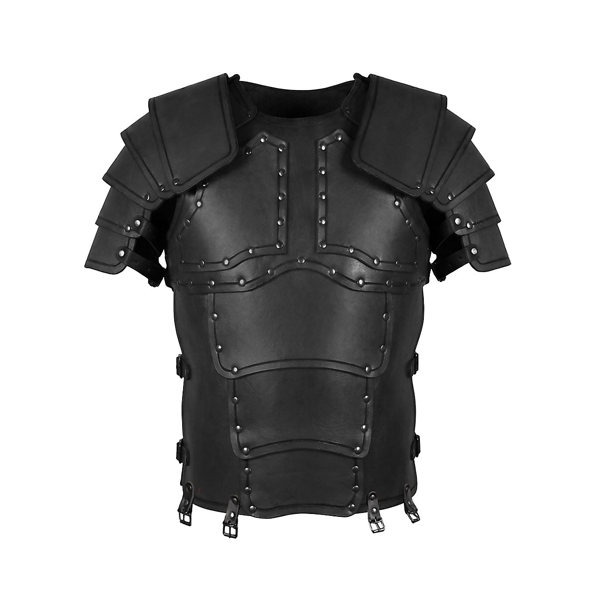 Gli elementi in pelle rivettati garantiscono una doppia protezione e conferiscono all'armatura un carattere forte. Fibbie e cinturini in pelle completamente regolabili consentono a chi indossa l'armatura da mercenario di adattarla individualmente alla propria corporatura e alle proprie estremità.