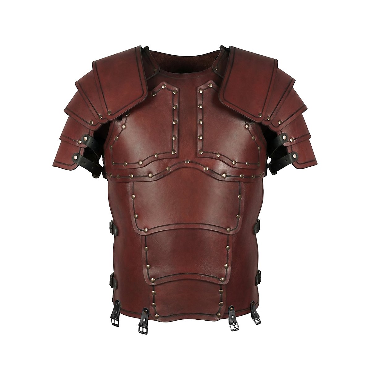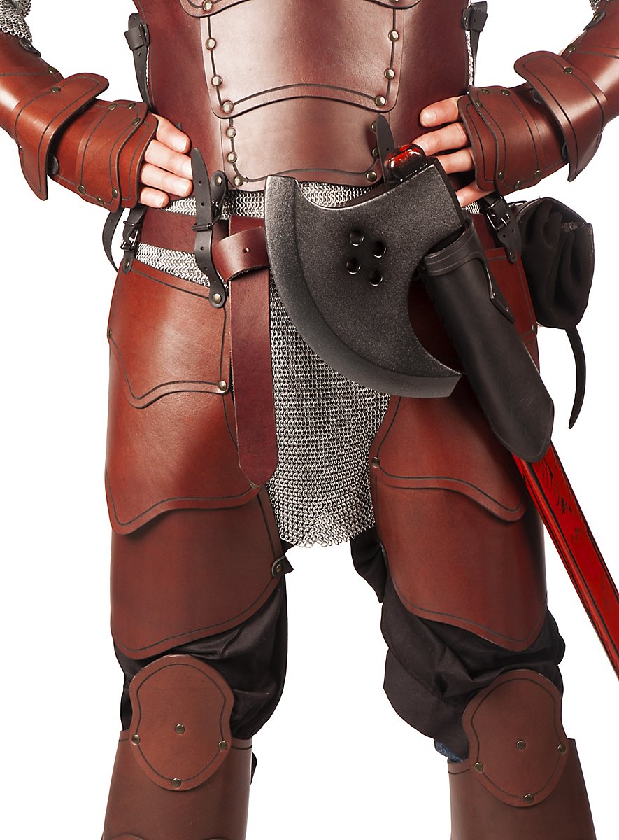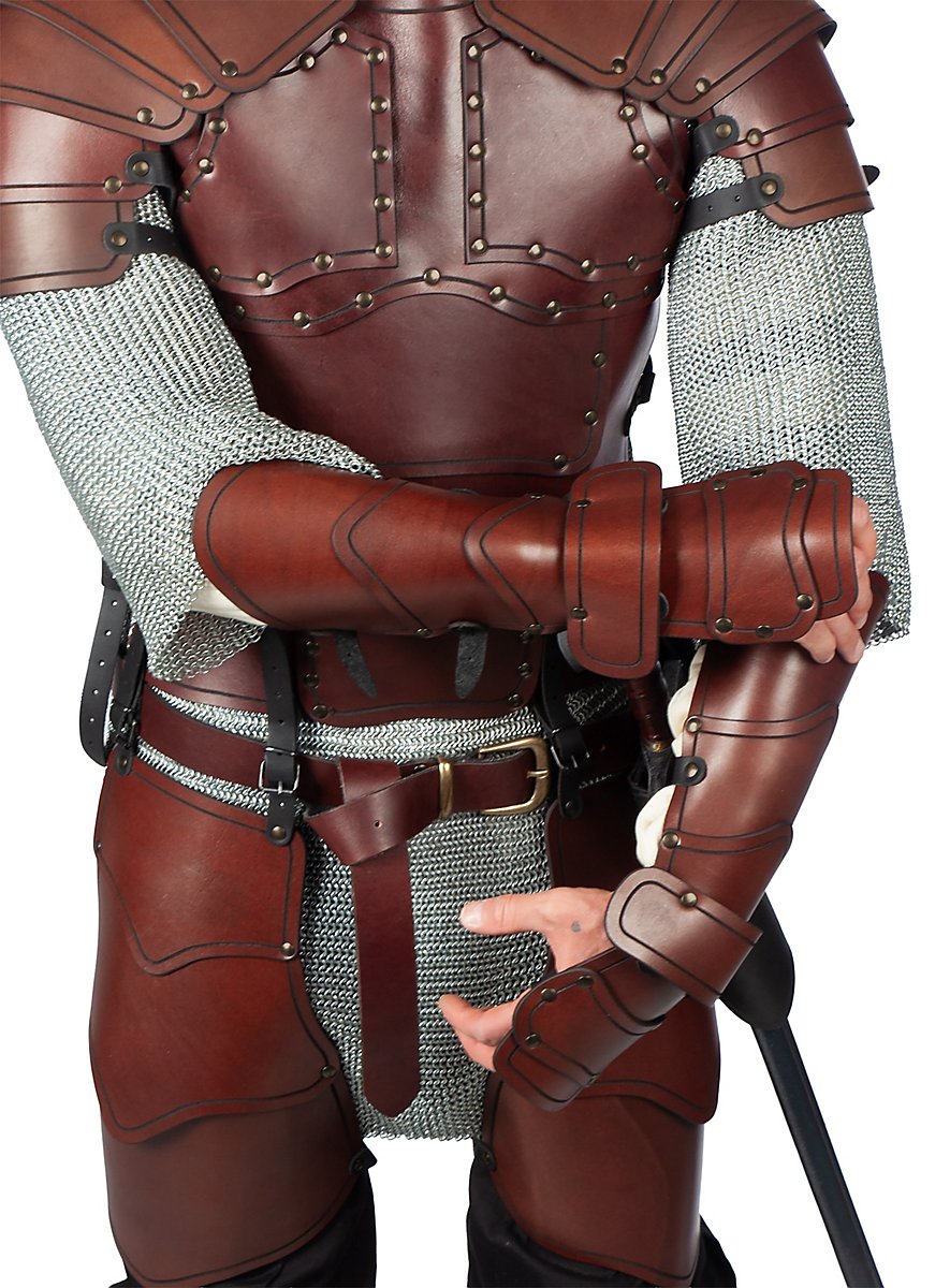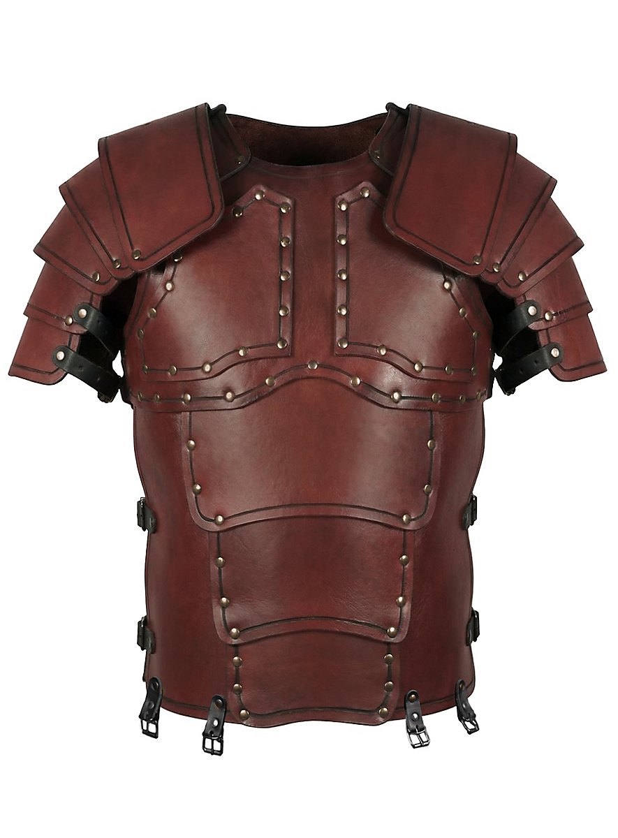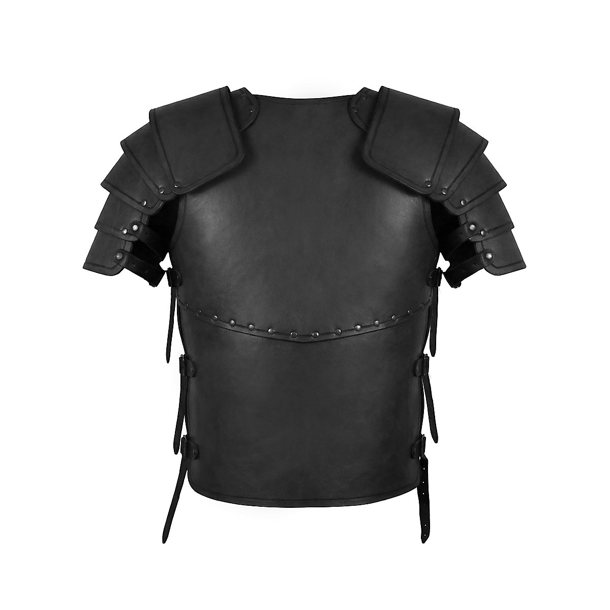 Gli elementi in pelle rivettati garantiscono una doppia protezione e conferiscono all'armatura un carattere forte. Fibbie e cinturini in pelle completamente regolabili consentono a chi indossa l'armatura da mercenario di adattarla individualmente alla propria corporatura e alle proprie estremità.