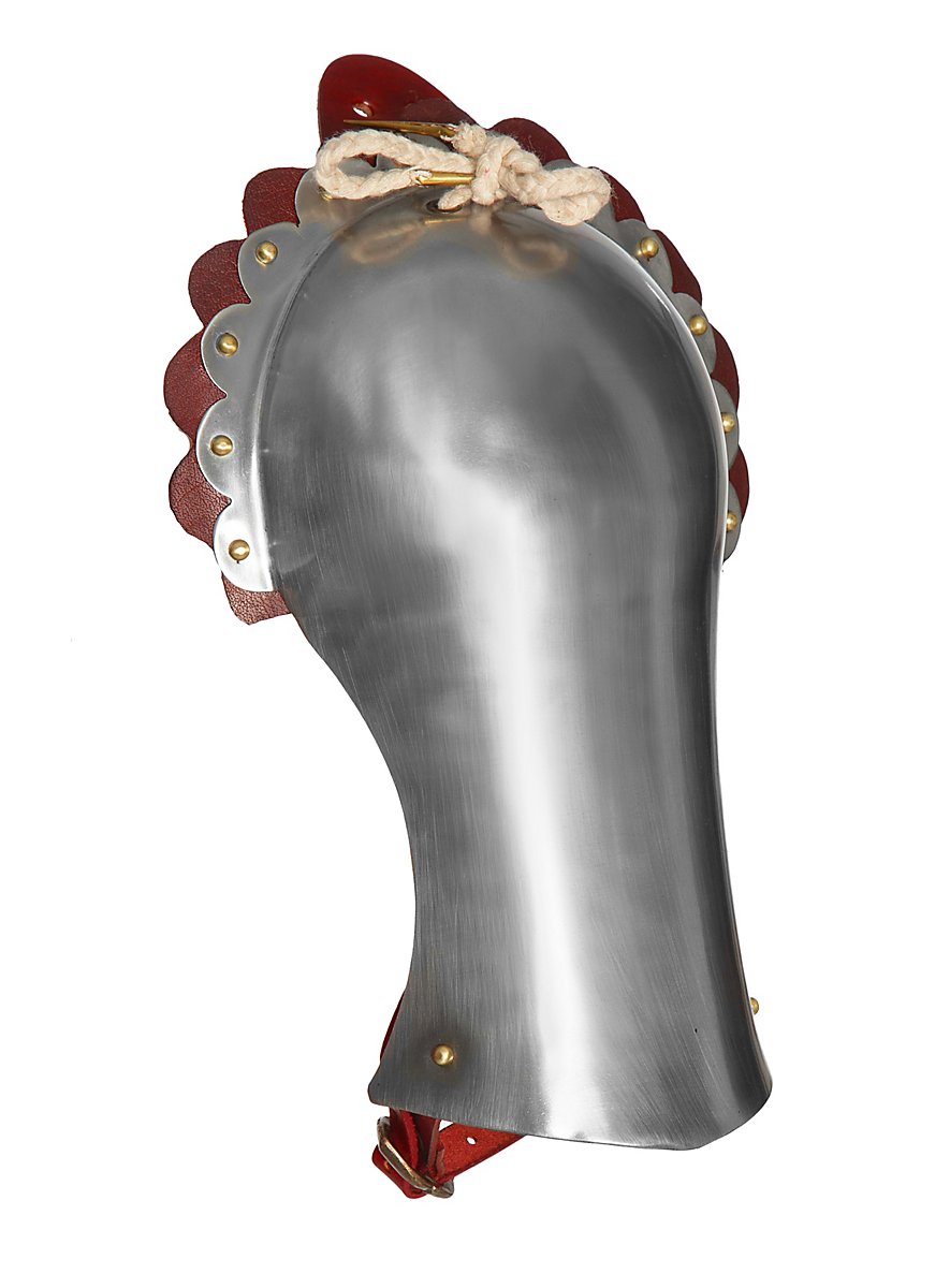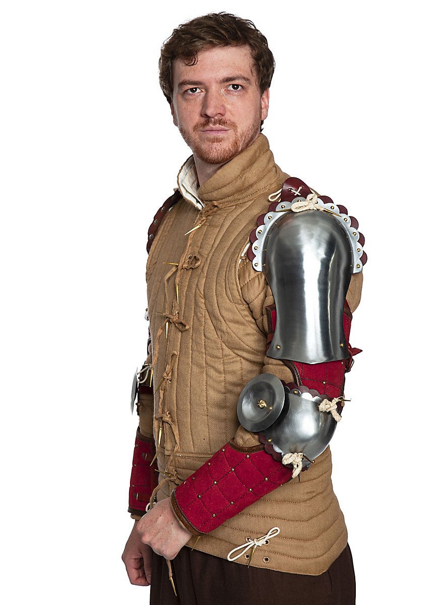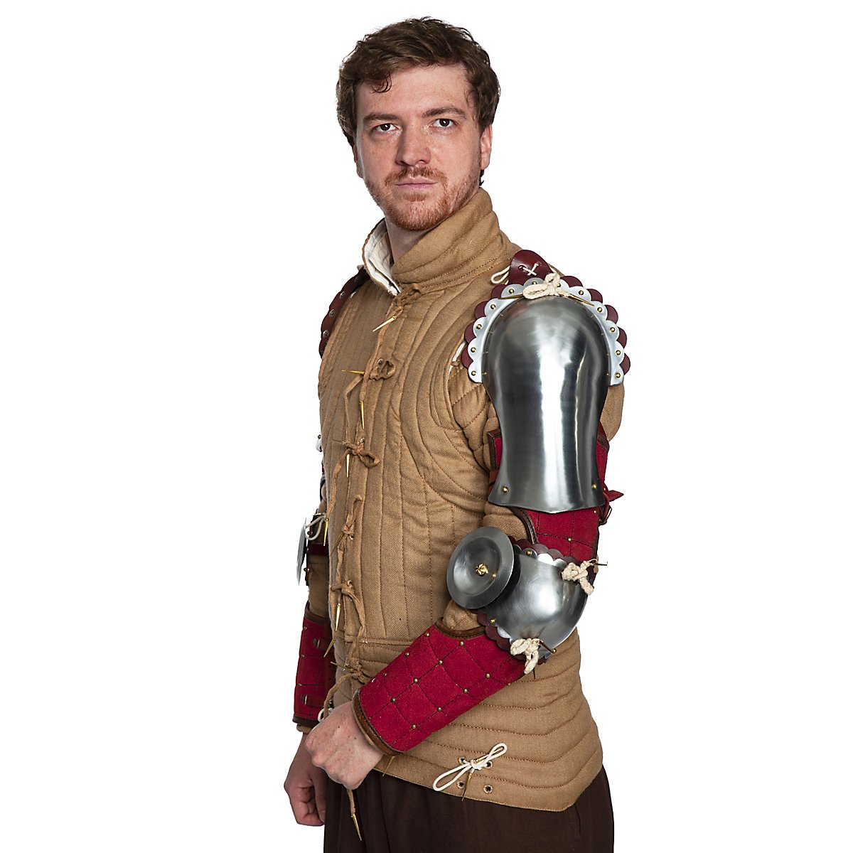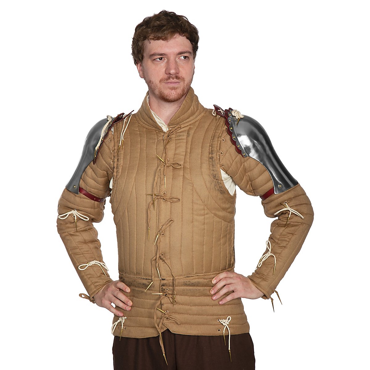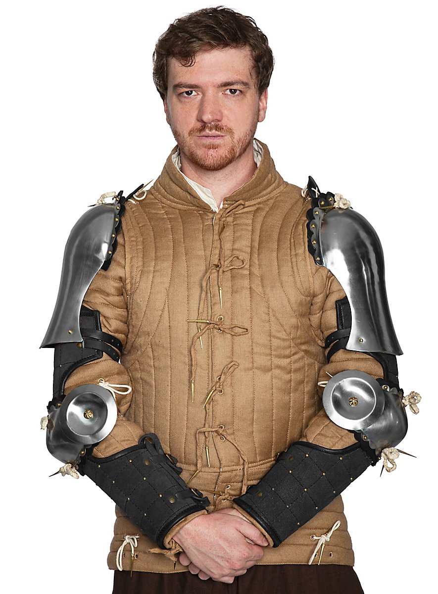 Le spalle a piastre non sono fissate con fibbie a collari o pettorali di metallo, ad esempio, come spesso accade, ma con cordicelle sulla doppietta dell'armatura, sul gambeson o sulla cotta di maglia, come era consuetudine in passato.